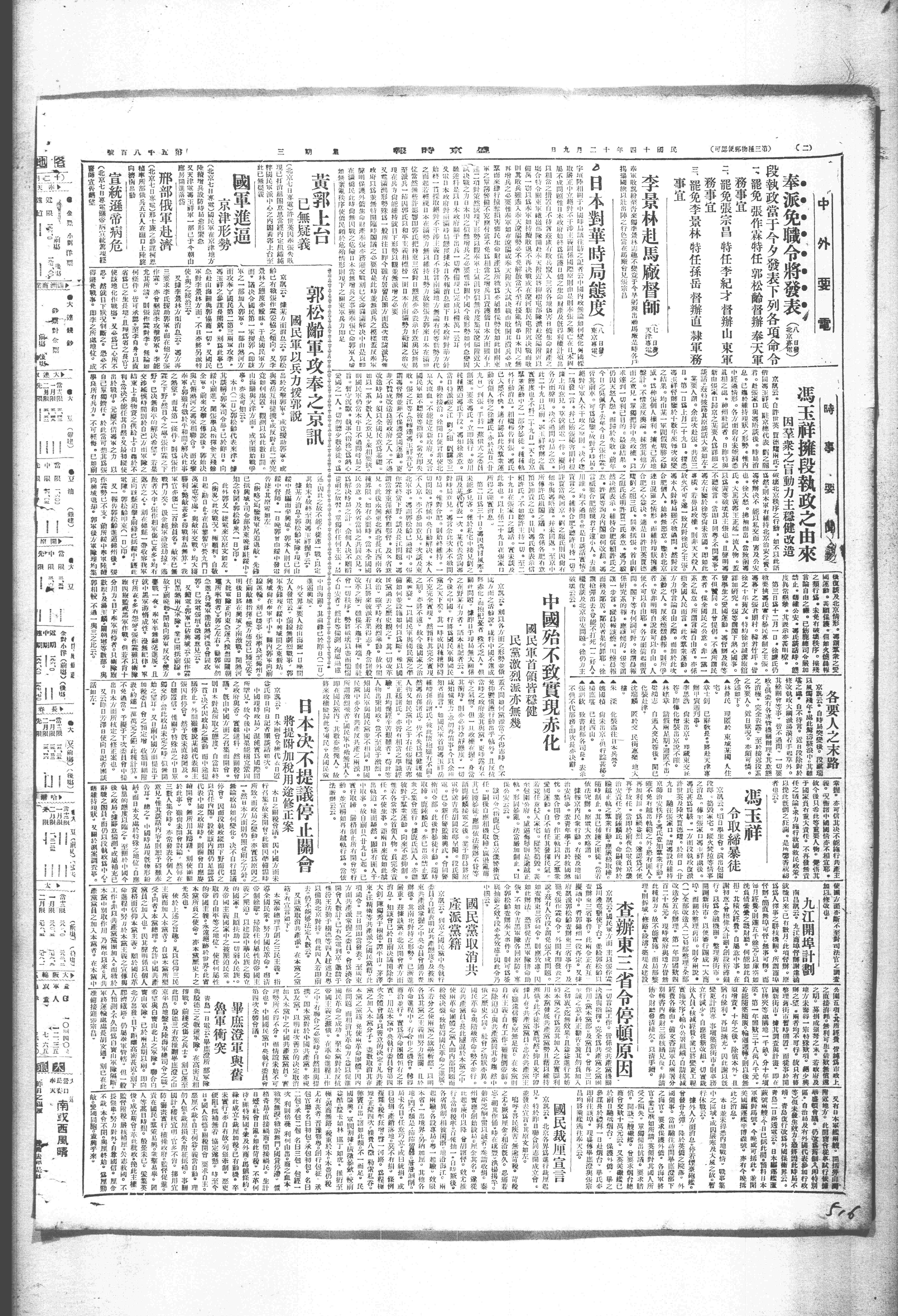 (3)公使团因冯玉祥李景林战争,照会外交部,认天津驻兵为违背辛丑条约,请特别注意,同时天津领事团组织联军,分布华界租界交界地方。
