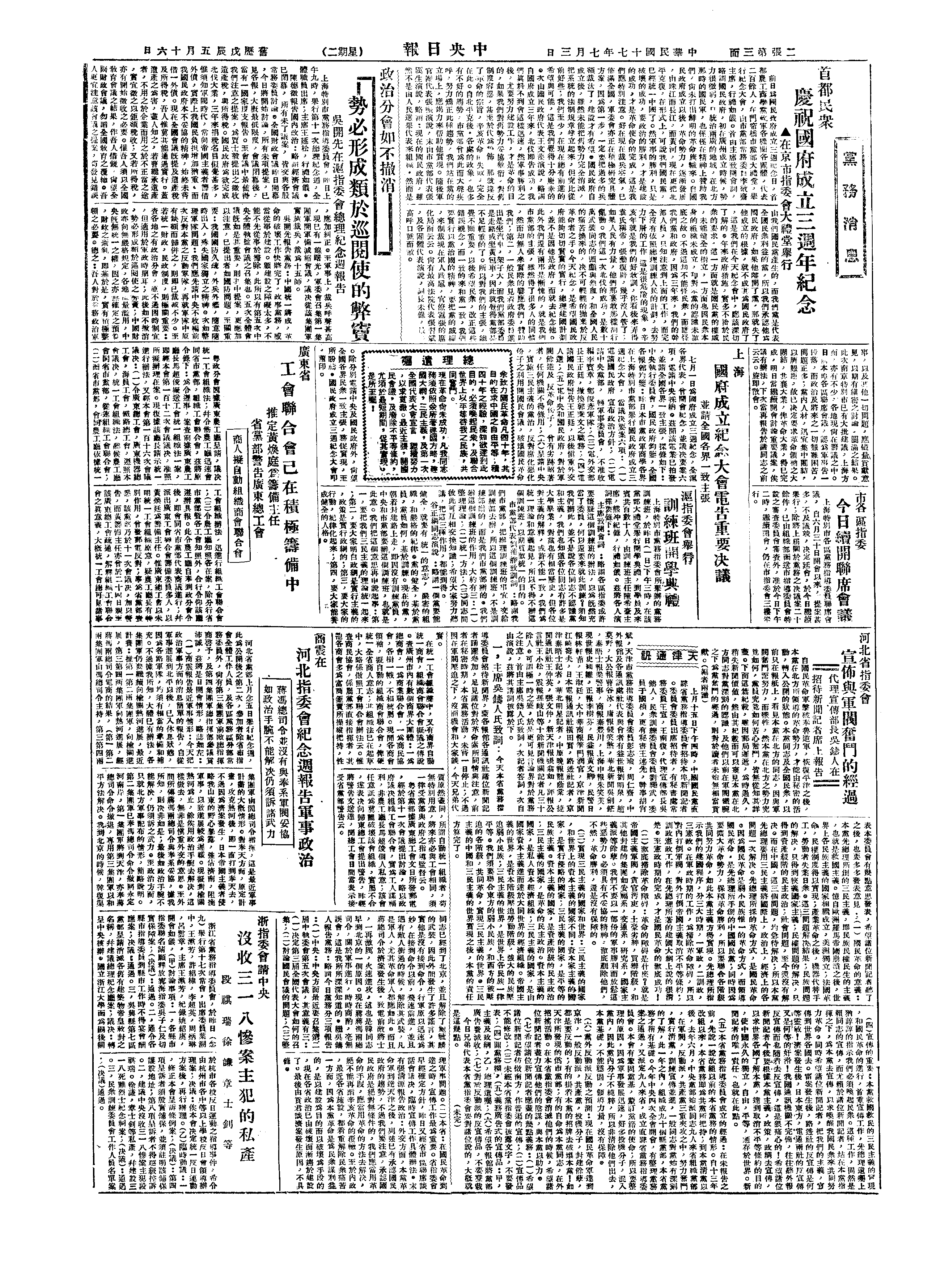 一、捐弃个人地位观念及区域观念,以求中央组织之巩固,政治始能稳定;