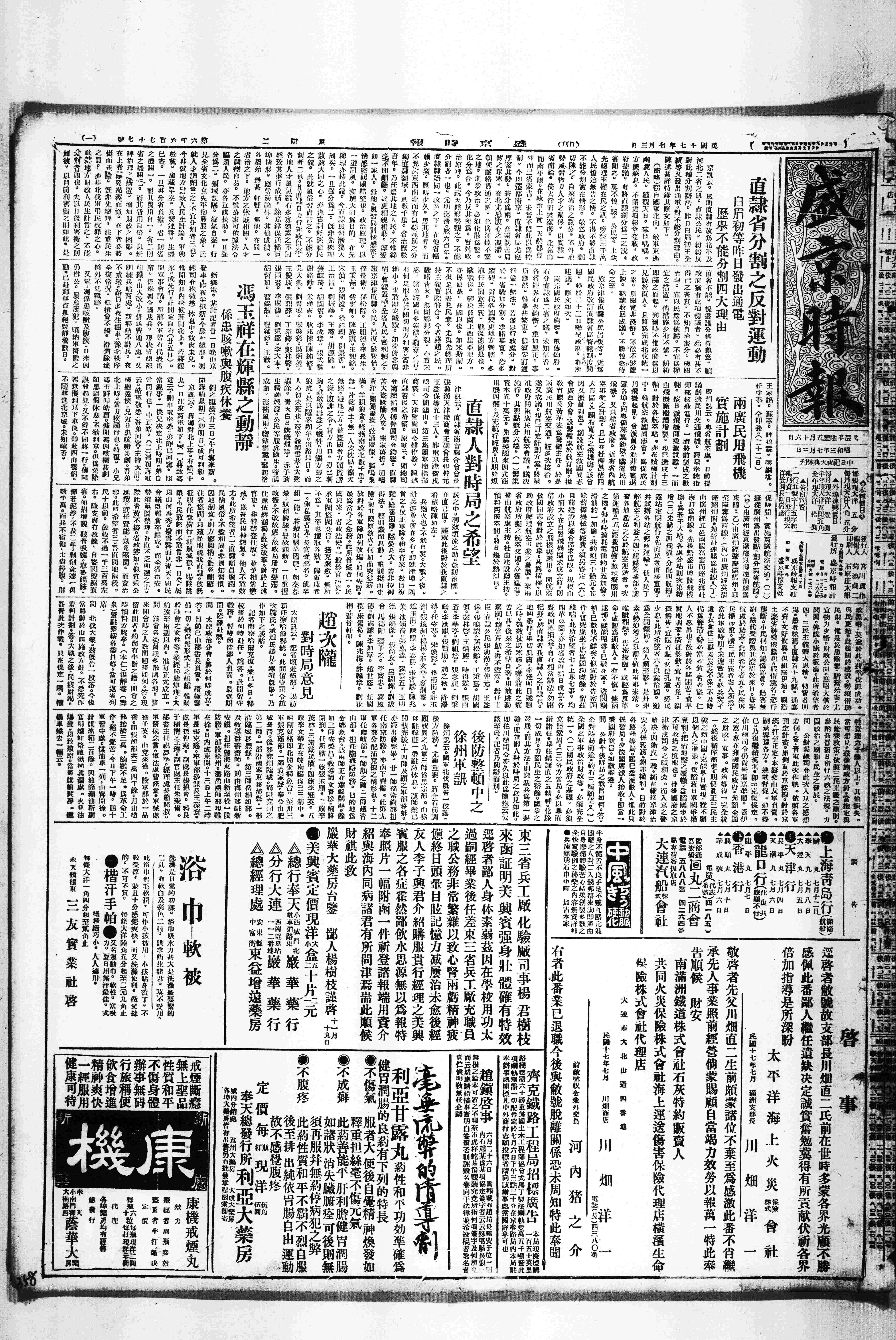 又谓东三省问题务希和平解决,深望日本国民予以公正之援助。