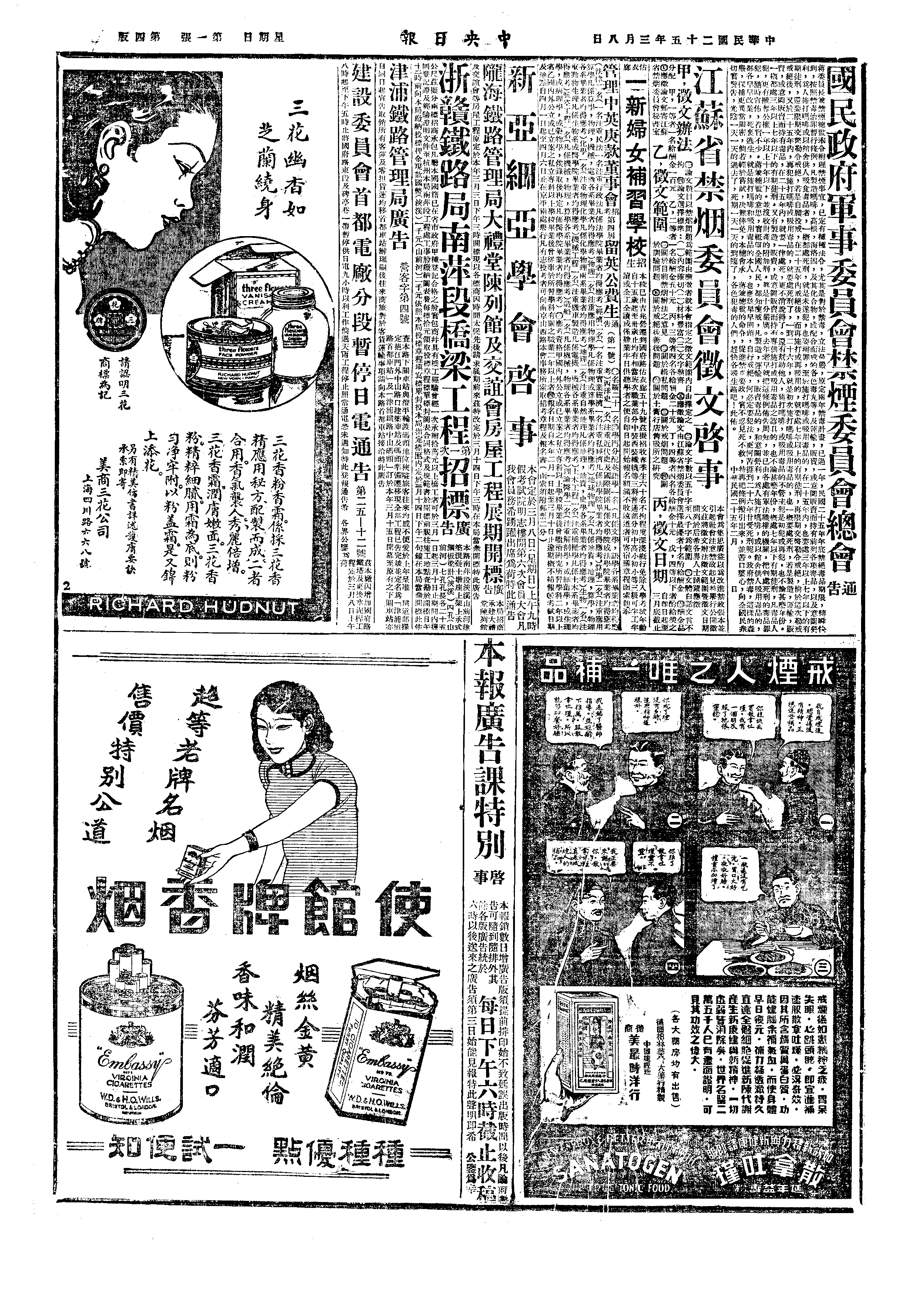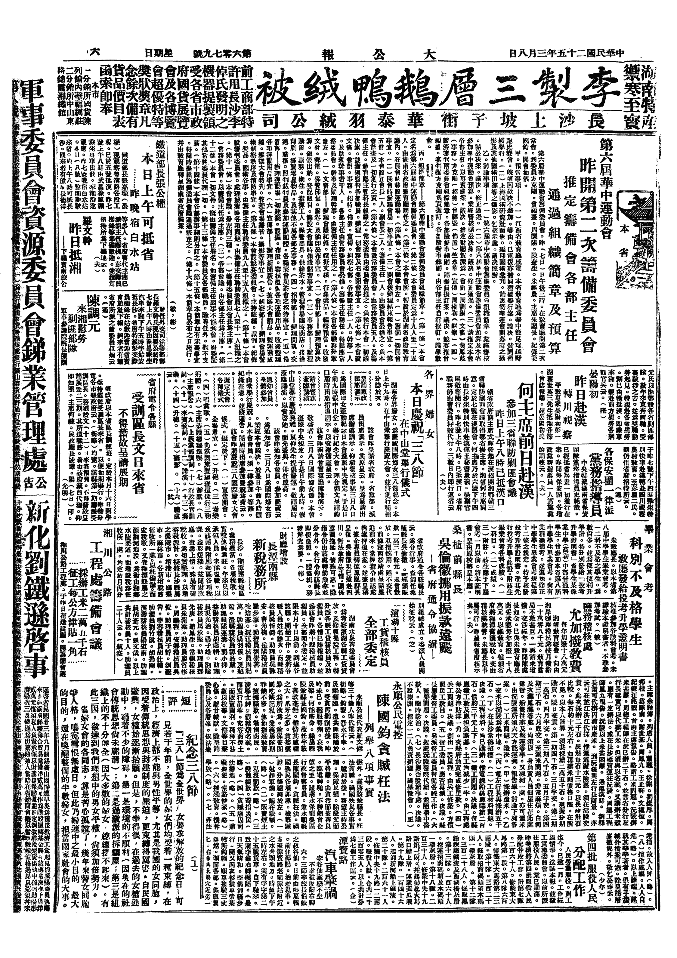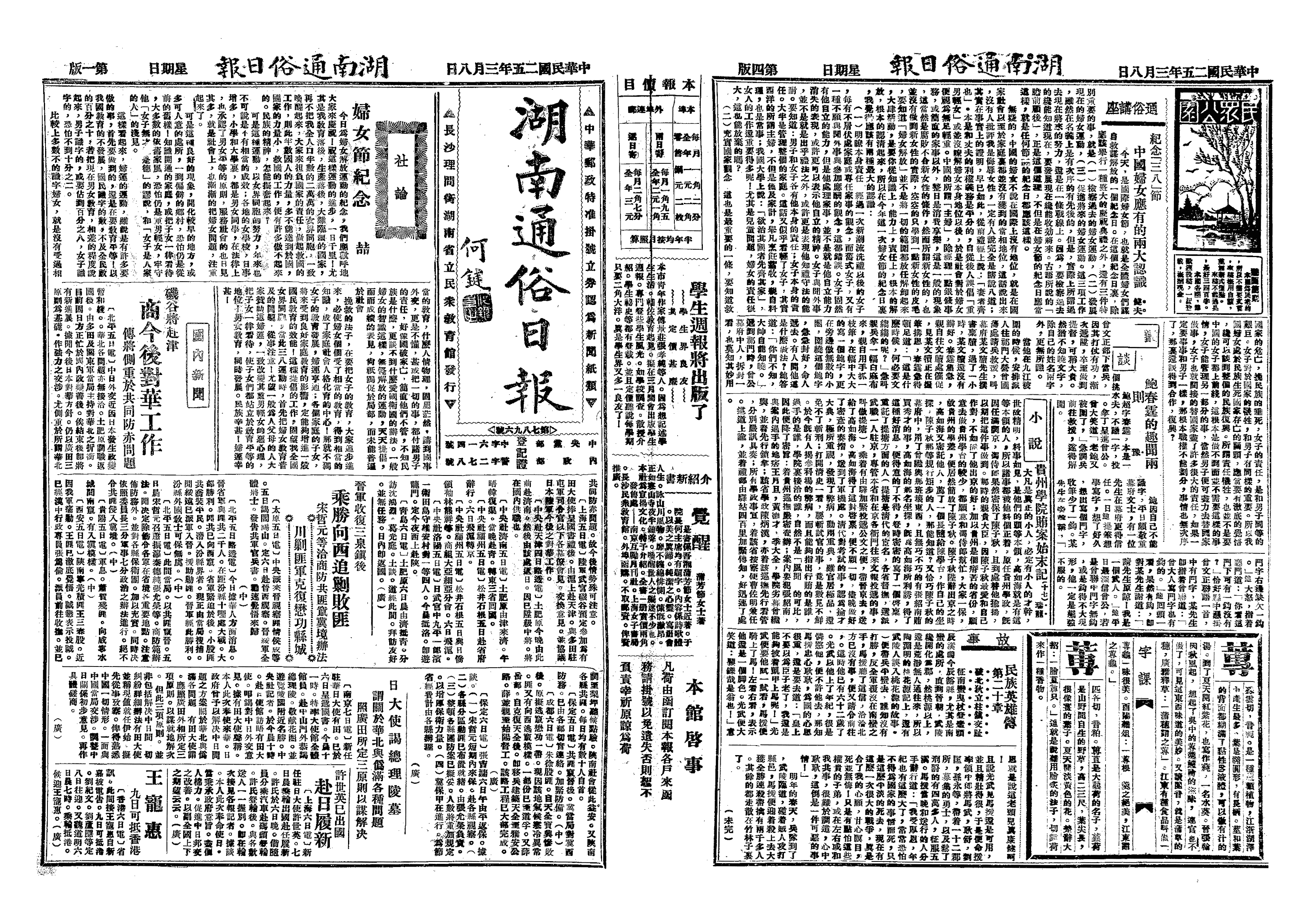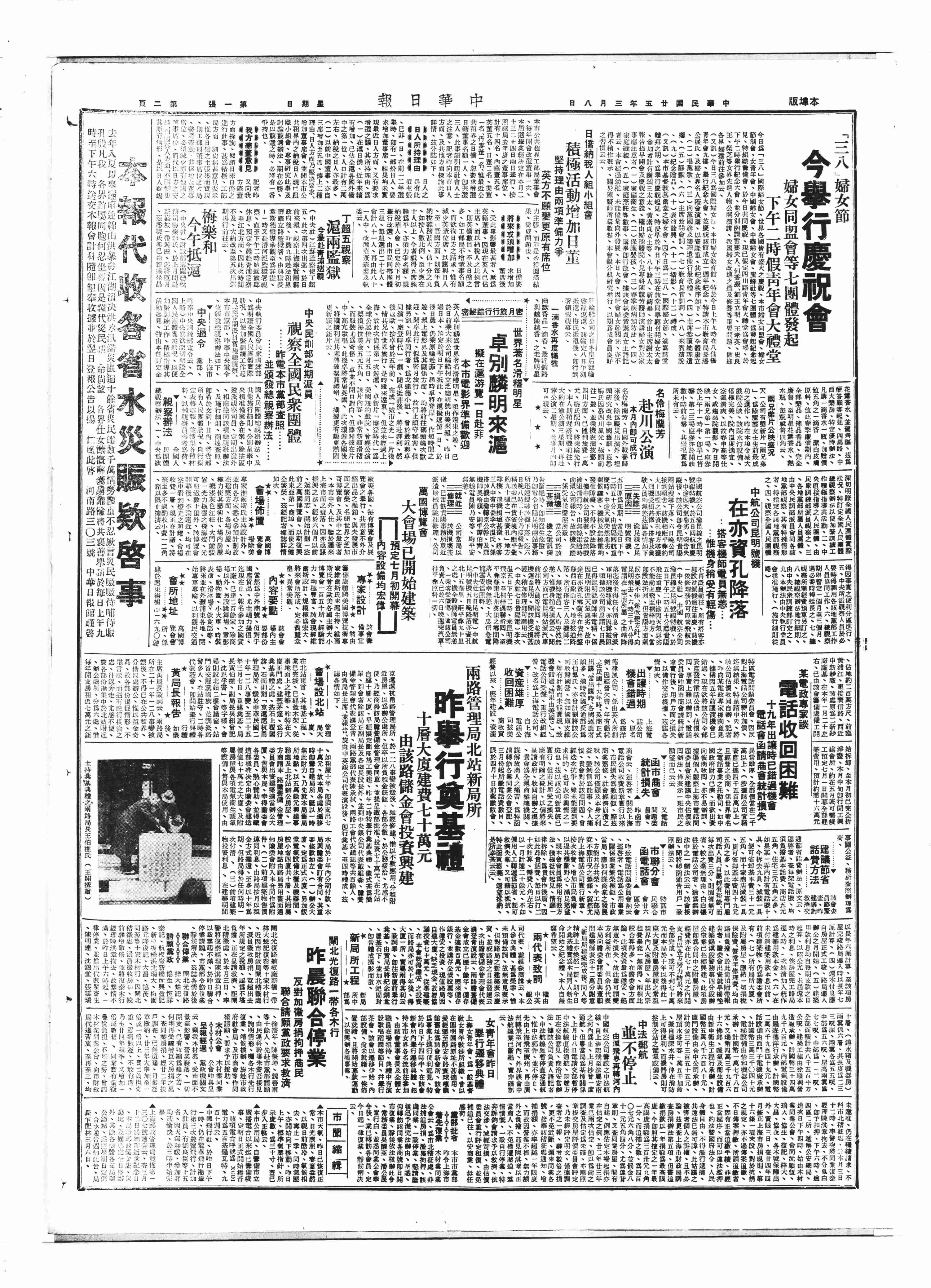 △ 下午02时,上海妇女界救国会、文化界救国会等七团体在北四川路青年会礼堂举行纪念“三八”妇女节大会。
