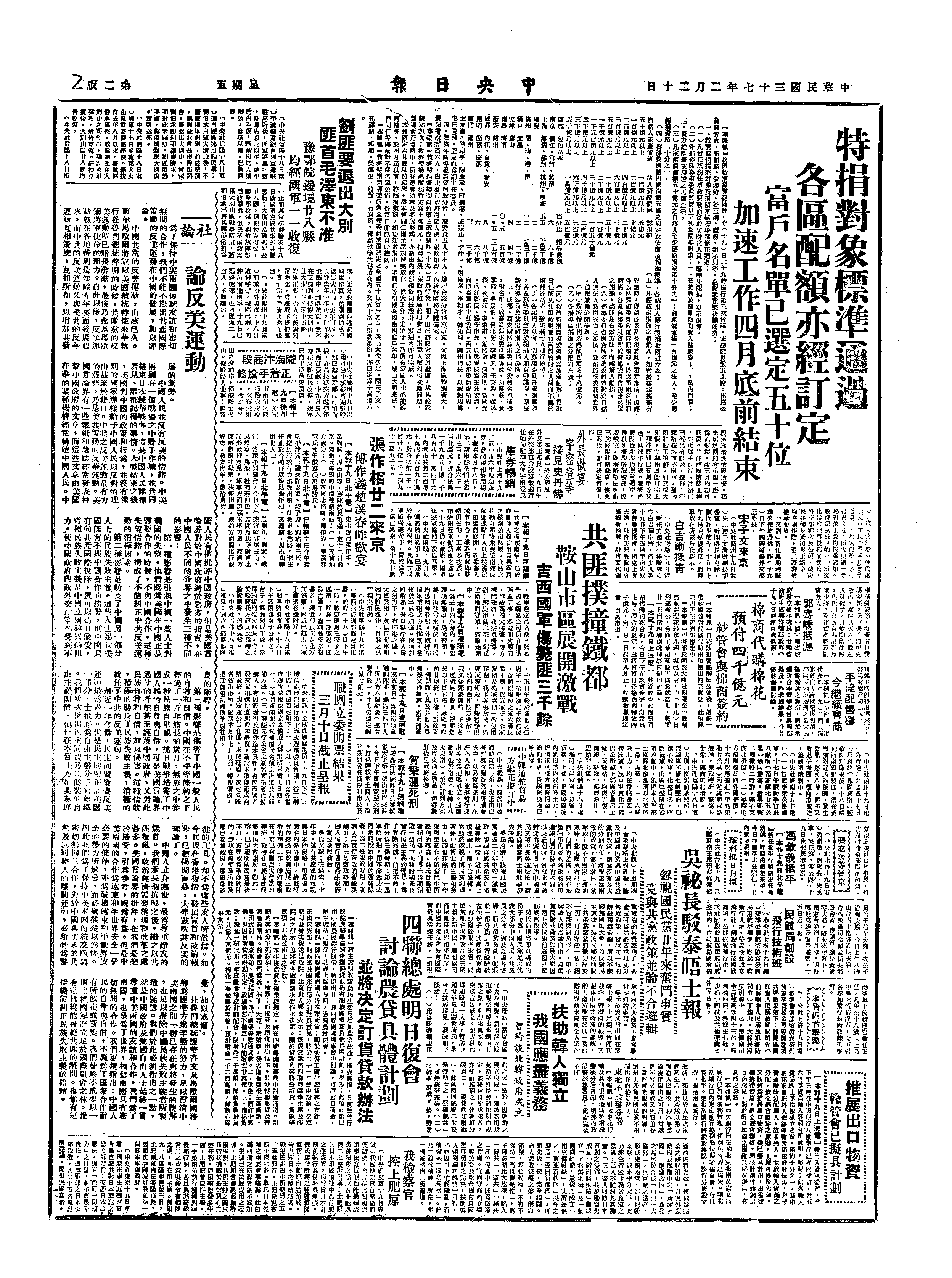 致电刘少奇,提议由中央工委于03月初召集彭真、聂荣臻、薄一波、陈毅、邓子恢、康生、饶漱石到中央工委所在地开会,讨论刘少奇关于晋察冀与晋冀鲁豫两区合并的提议,以及支援整个南线北线的财政、经济、军工干部,成立华北机构,成立大党校、大军校、大党报等问题。