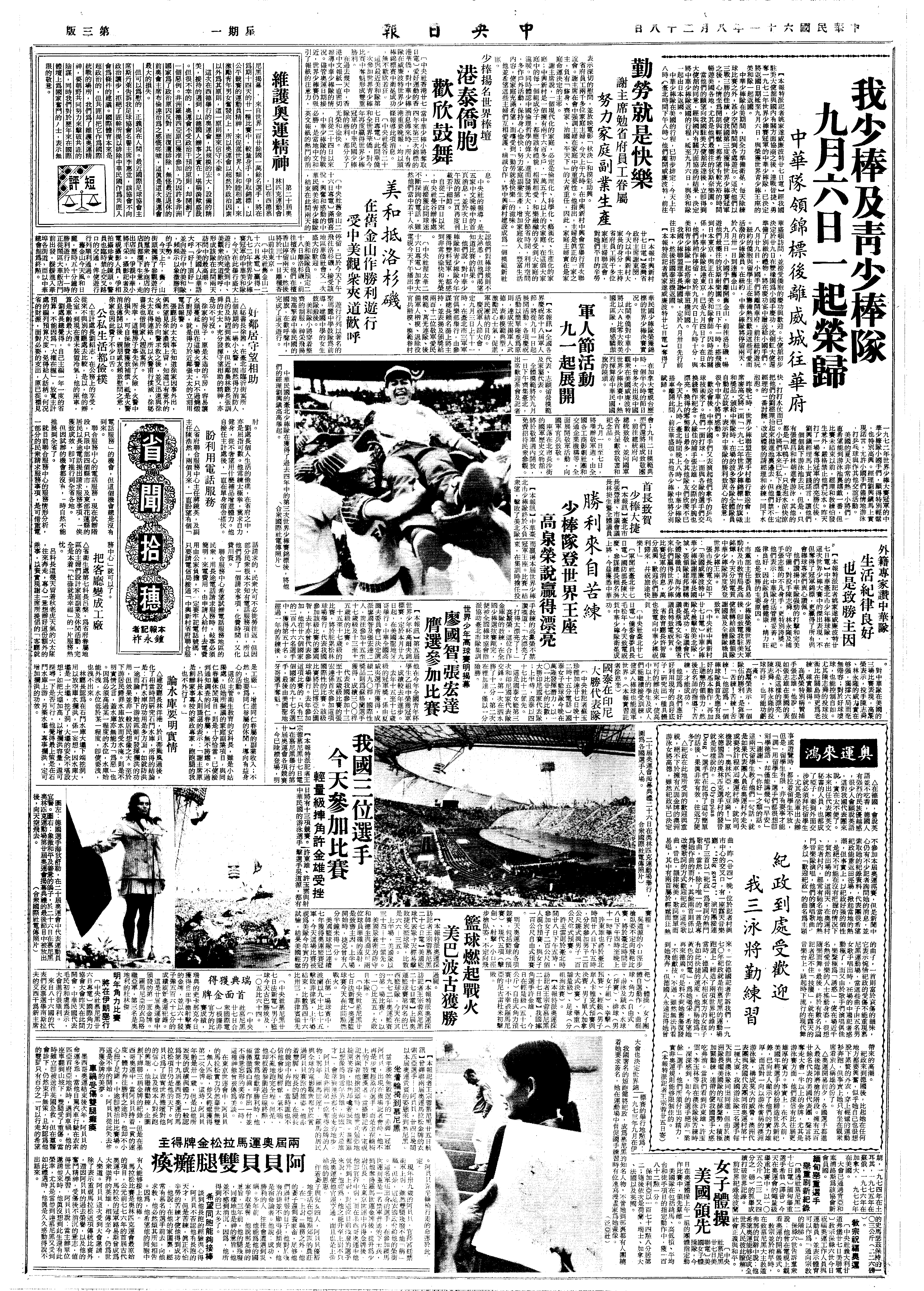 中国青少棒队(十二至十五岁的男童)及少年棒队(十二岁为度),先后于上周在美参加比赛,均击败了美欧诸队,获得冠军;殊为奇蹟。
