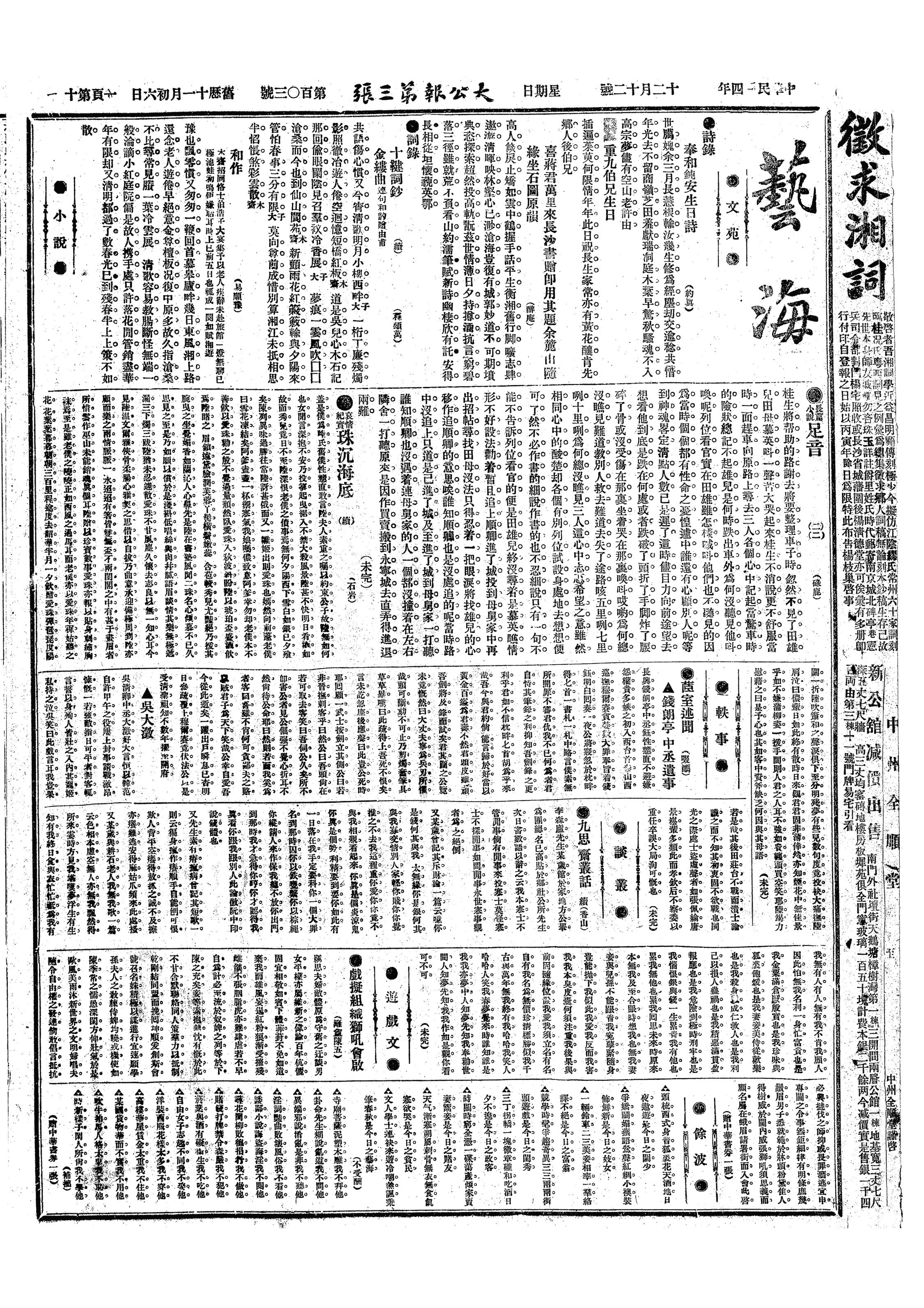吴茂之来一函,言任警备队书记长兼戒烟所书记,每月共薪水十三千文。与昌福公司董蜀芝交守瑕诗去。翁方纲《跋坡公像》云:竦眉凤眼,秀摄江山,两颧清峙而髯不甚多,右颊近上黑痣数点,是为宋李伯时之真本也。山谷貌丰腴而坡公两烦清峙。坡集中题跋一条云:传神在于颧频。吾常灯下顾见颊影,使人就壁画之,不作眉目,见者皆失笑以为吾矣。以此条记之,最明白矣。右烦有黑痣数点,见《郝陵川集》。今日《娱闲录》登《觚斋随笔》数则,平常巳已极。前记各报登余著作,尚有朱云石《平论报》登余之诗,杨宏稣《崇正日报》登余《宣言书》未计,盖二十五种矣。晚陈雪岑来谈甚久,言曾延年、李思纯、觉奴、毋我为一党,党见甚深,渠及何雨辰皆被排云。