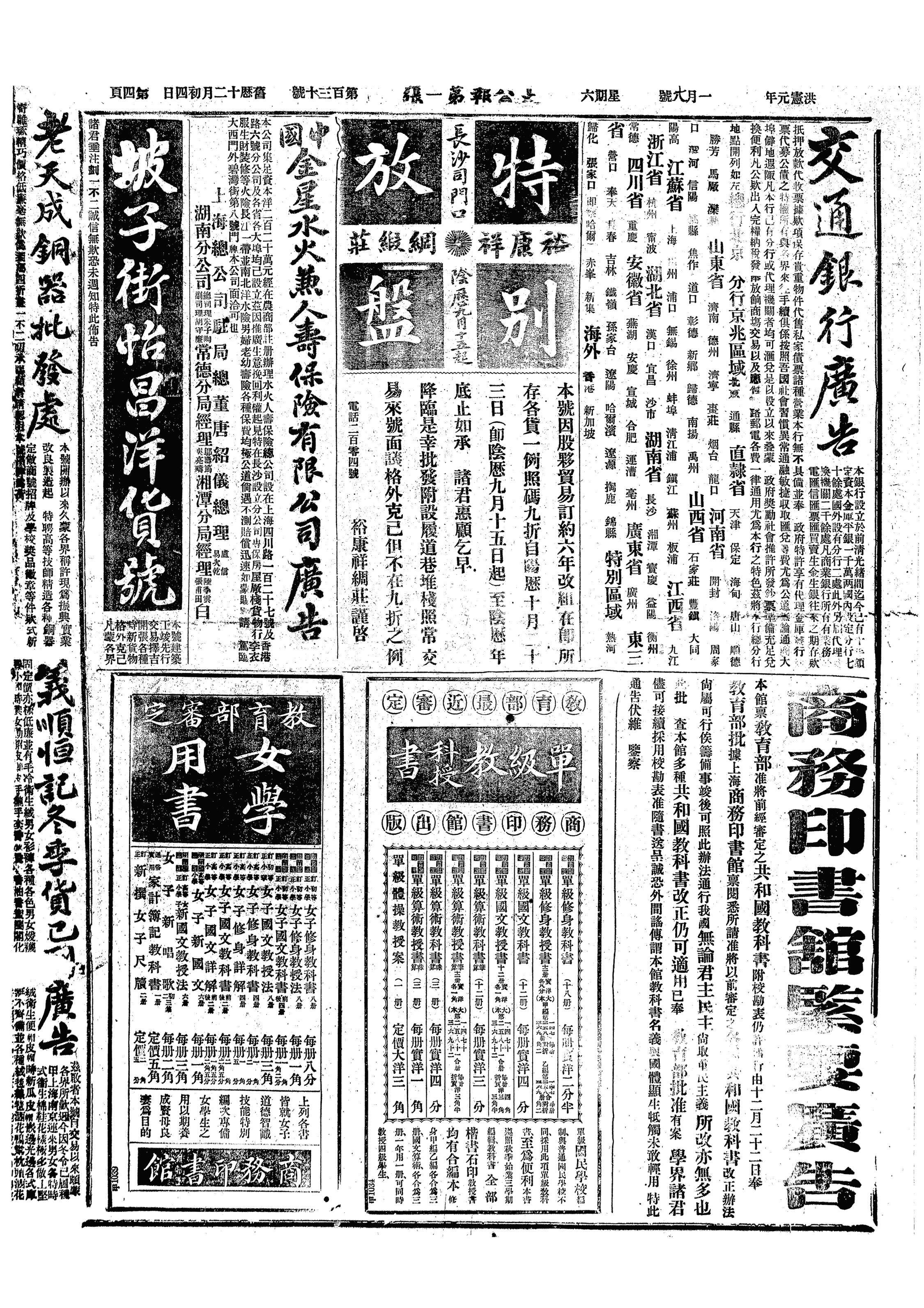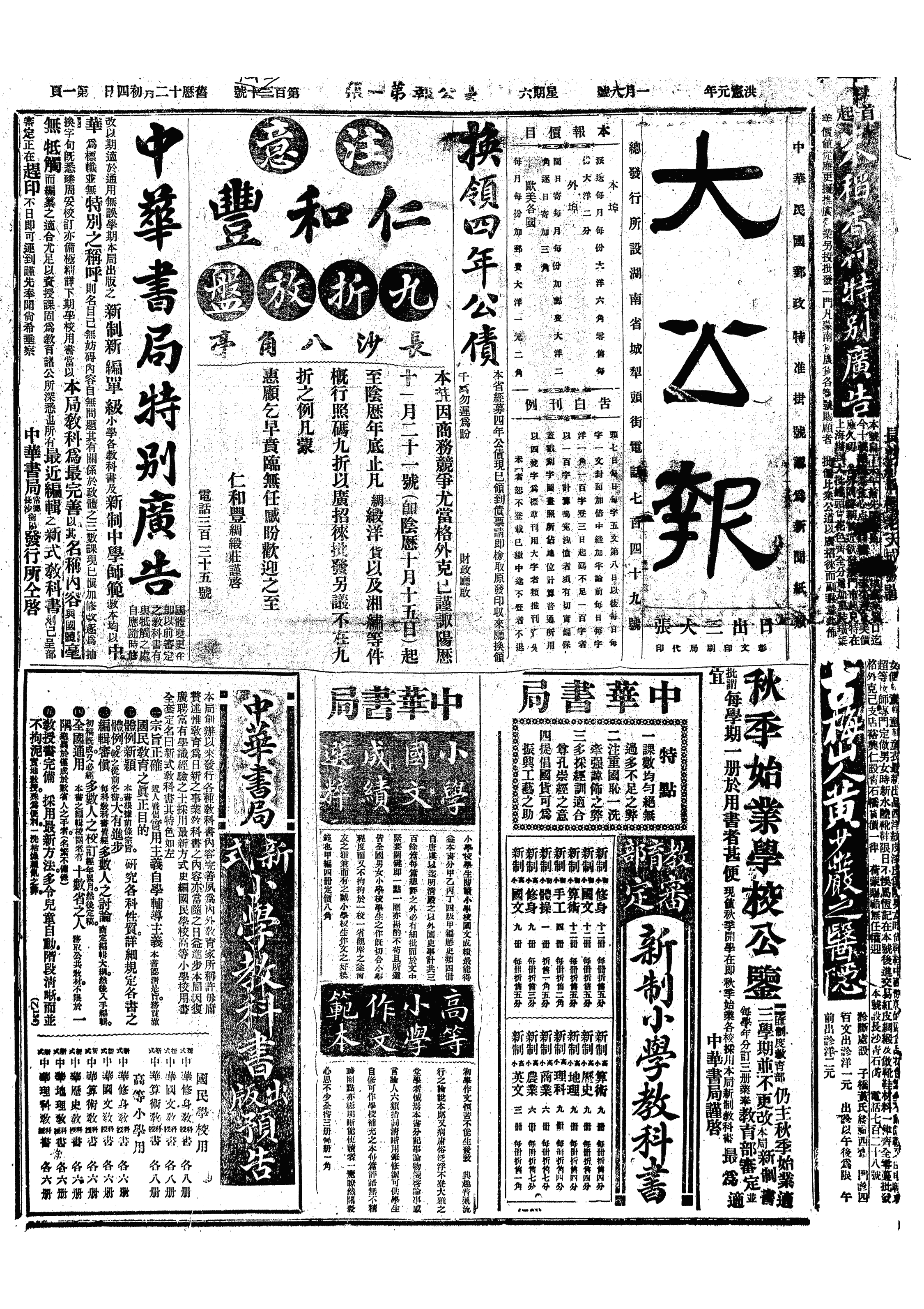 昌福公司初九日开特别会,拟托粹记带《华严疏钞》六十八本,十一元五角二分,《华严十玄门》二分,《华严经略策》五种,一本,一角三分,《楞严正脉》十四本,二元四角,《广宏明集》一本,一元七角六分,共十日《群报》登山西金永电,滇、黔并举,则刘显世亦在内也。事《耶儒月旦》。午饭后过观鉴庐,闻李澄波言,统率办事处来电云,蔡谔为总统,梁启超为国务总理,唐继尧为陆军部长,此电《群报》未登。晚王嫂之子来,言汉州现守城,某场已劫,米价日涨,人心惶然不安。