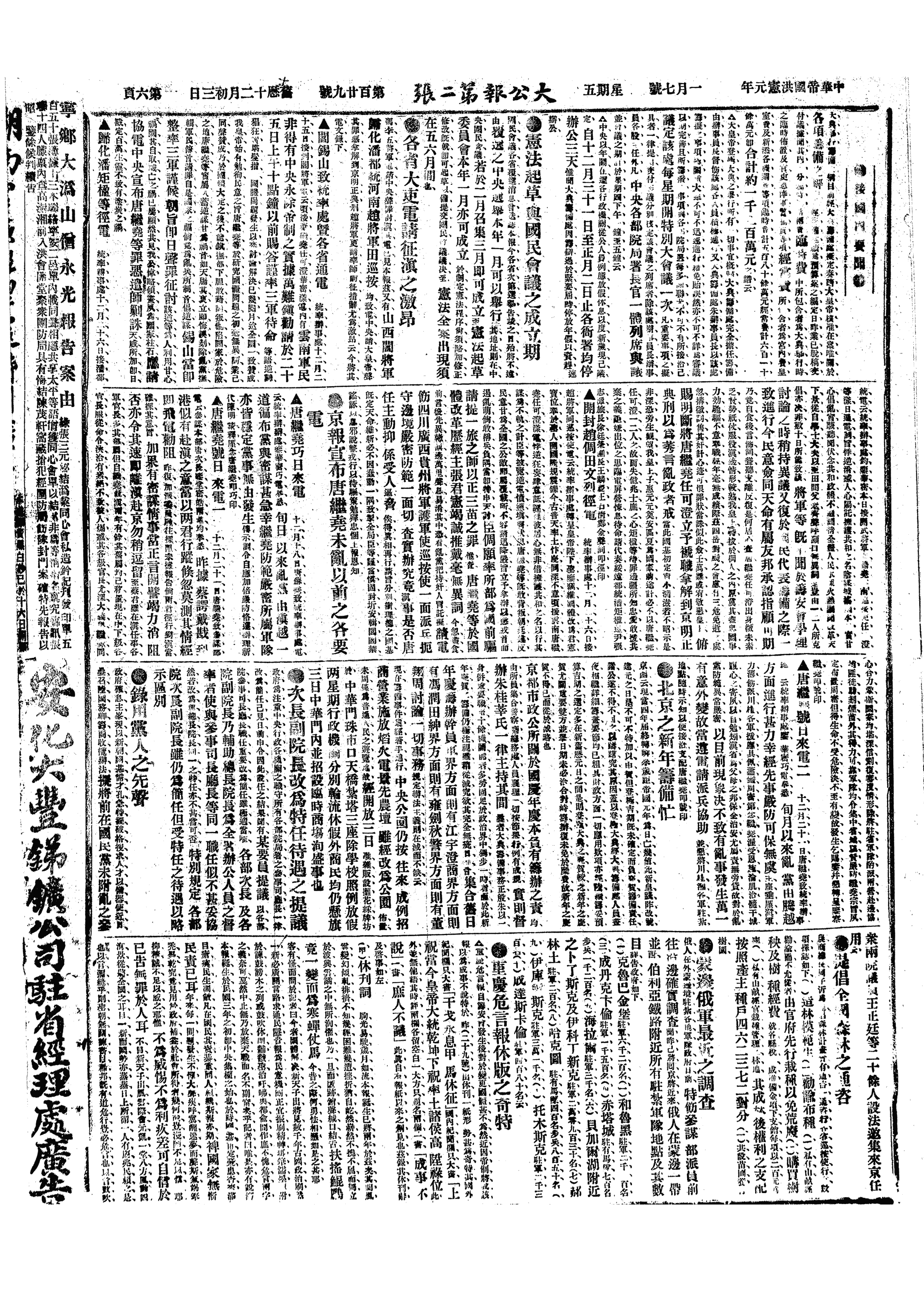 △ 政事堂以云南护国军实行讨袁,是日特通电各省切实查报地方治安情形。