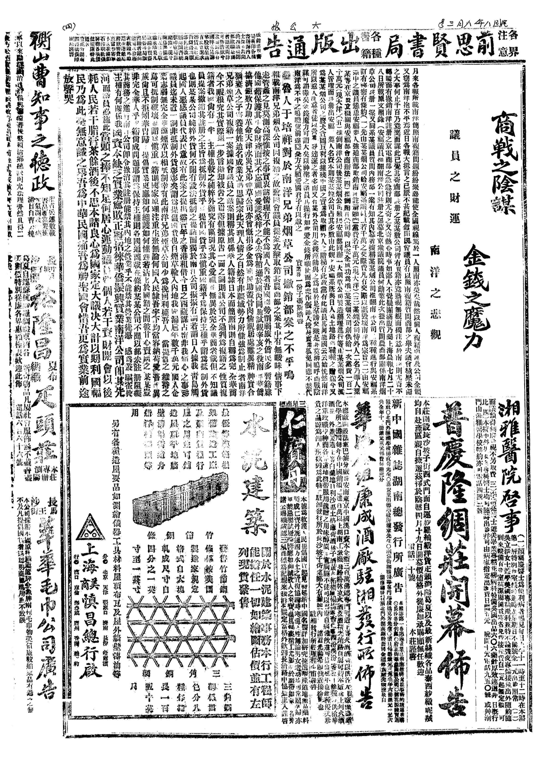 △ 江苏省教育会、中华职业教育社、华侨联合会、上海青年会、寰球中国学生会、上海基督教联合会等10团体,因北京国务院08月28日发出禁止请愿布告,是日联名电徐世昌及北京国务院,就布告诬指各界代表“不依照法定程序”请愿一事予以驳斥。