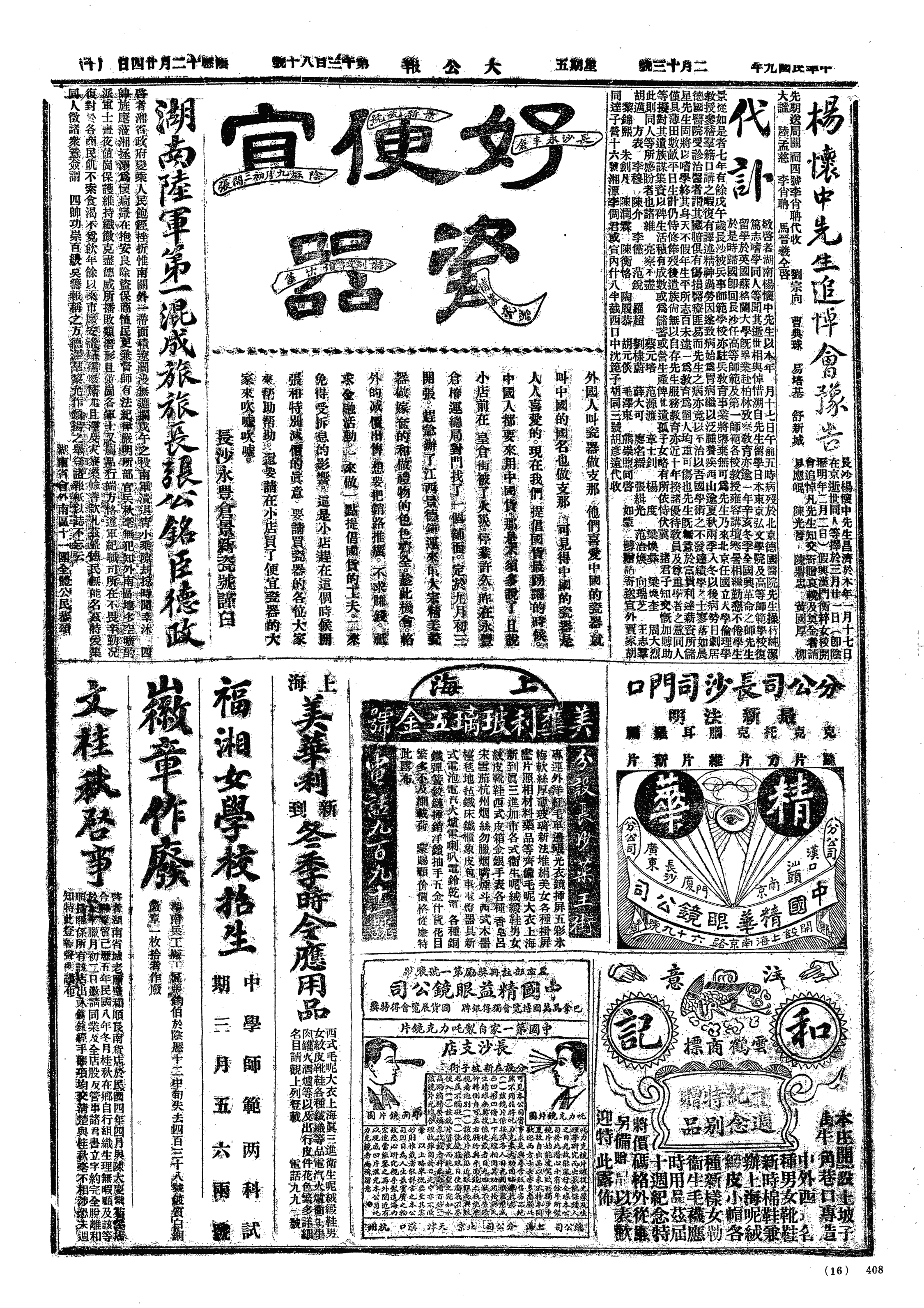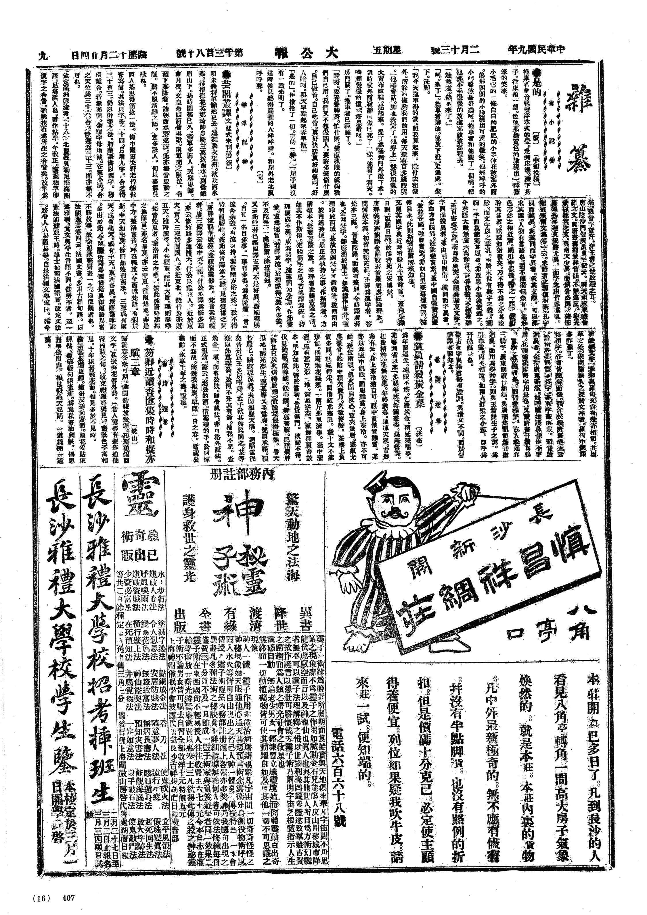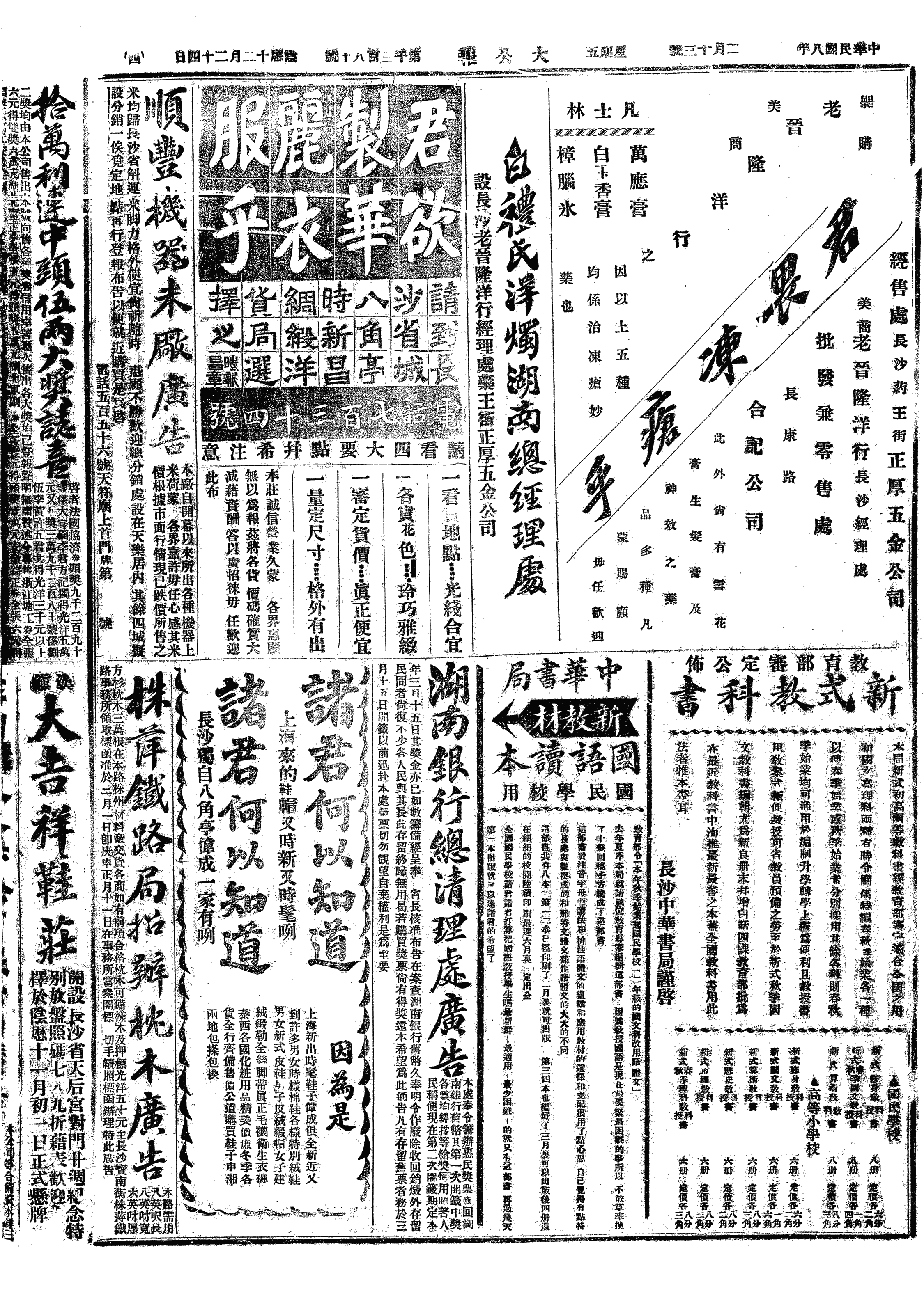 少荆来,同出外,路泥许不堪。至流通处,晤熊小岩、廖学章、邱仲翔,小岩言,曾对杨吉甫言予惮改国文,故今年改任钟点,吉甫欲请监学兼改国文,予托小岩荐马光攒。今年公肃、少荆均停聘矣。