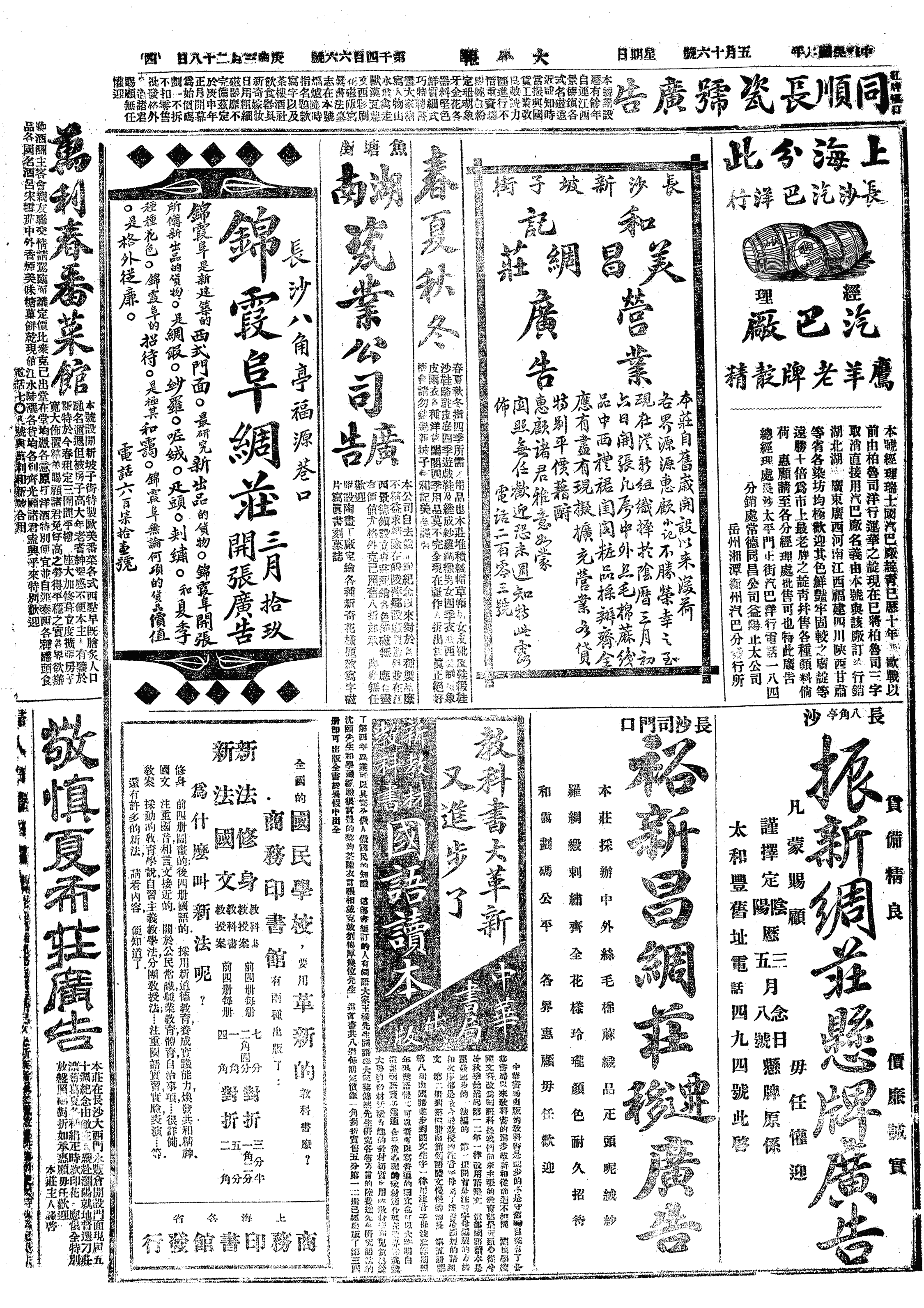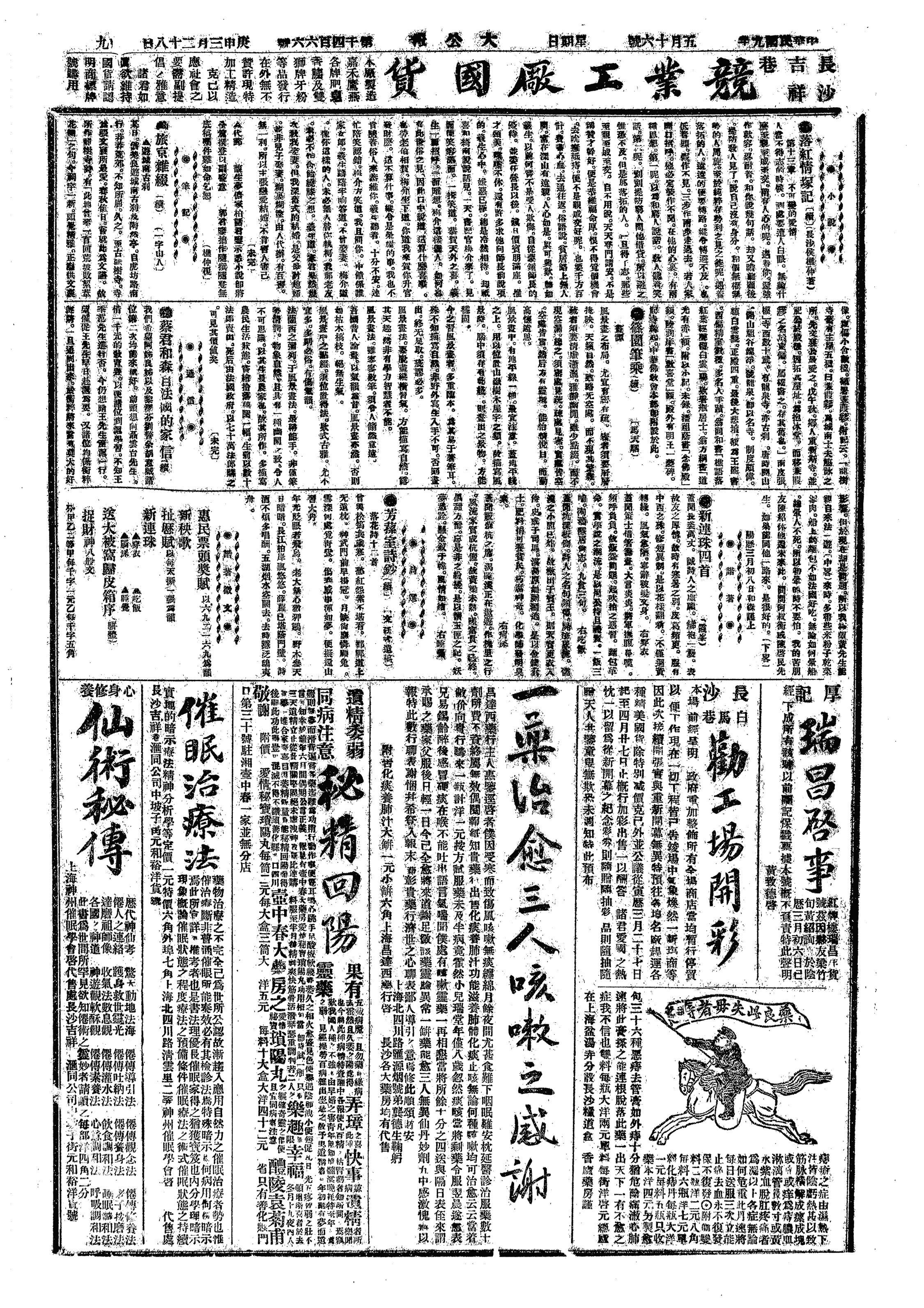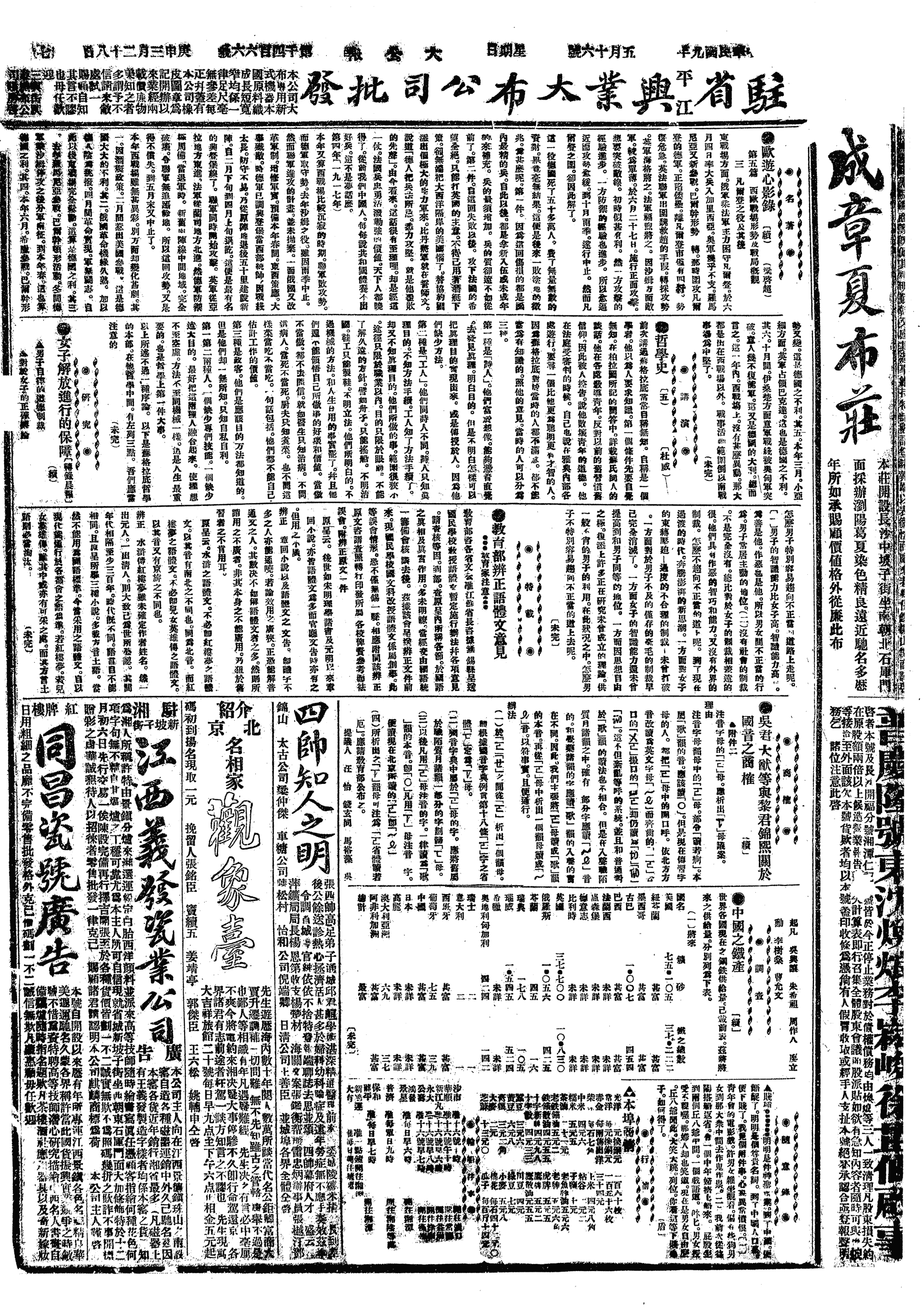往送少荆、岳安长行。晤张又荃、仲常、王祖一,少荆、岳安行,予即归。与周季畬交楷、桓信去,嘱转培芝、荃叔一阅,予意在使粮户派知之也。午饭后,取道玄所看《凤双飞全传》,阅之,盖《天雨花》之类也。昌福公司请四月初一日在布后街开公司成立十年纪念会,午前十一时也。