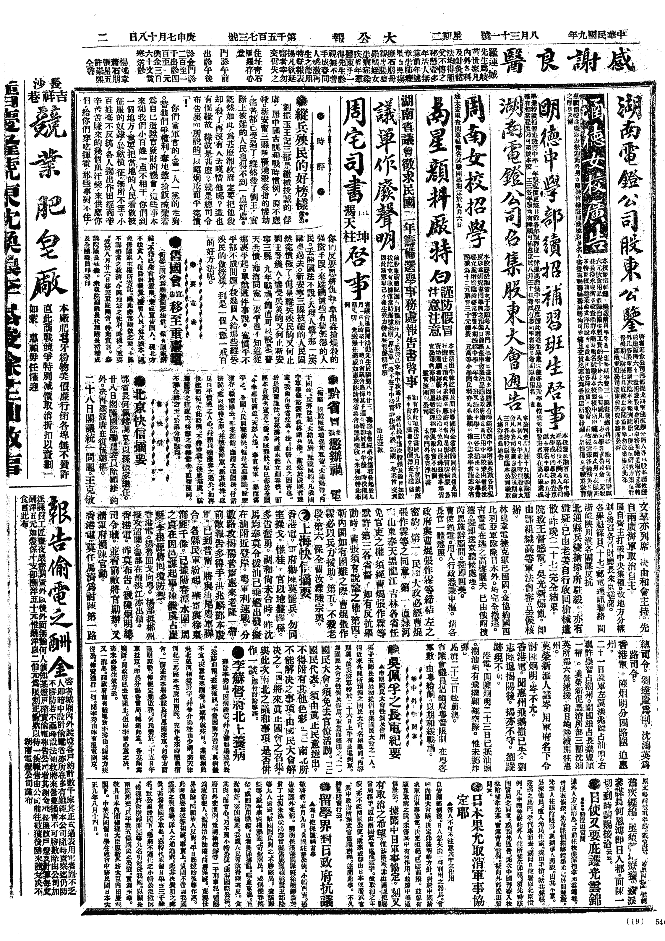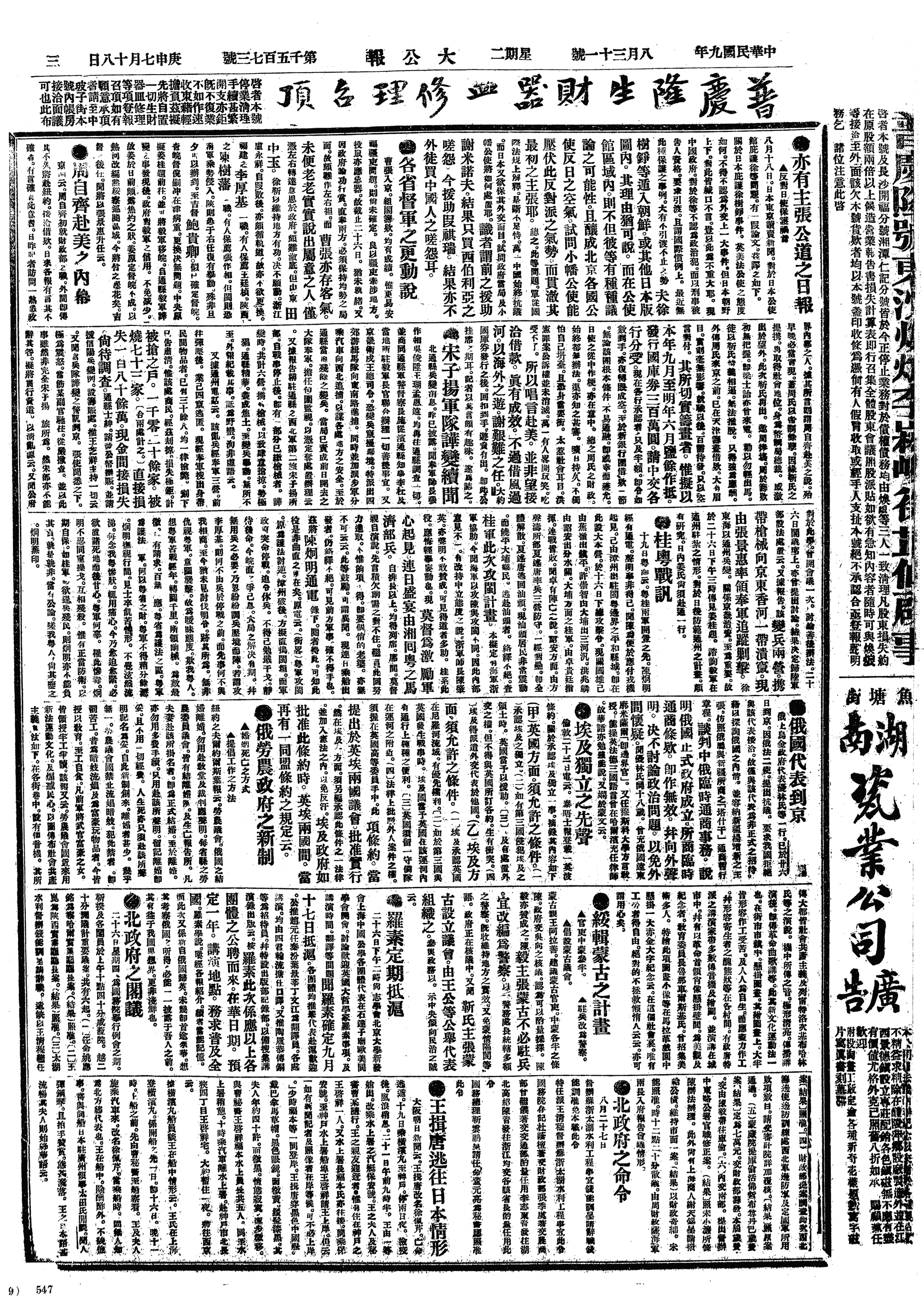 中华民国史大事记>19200831