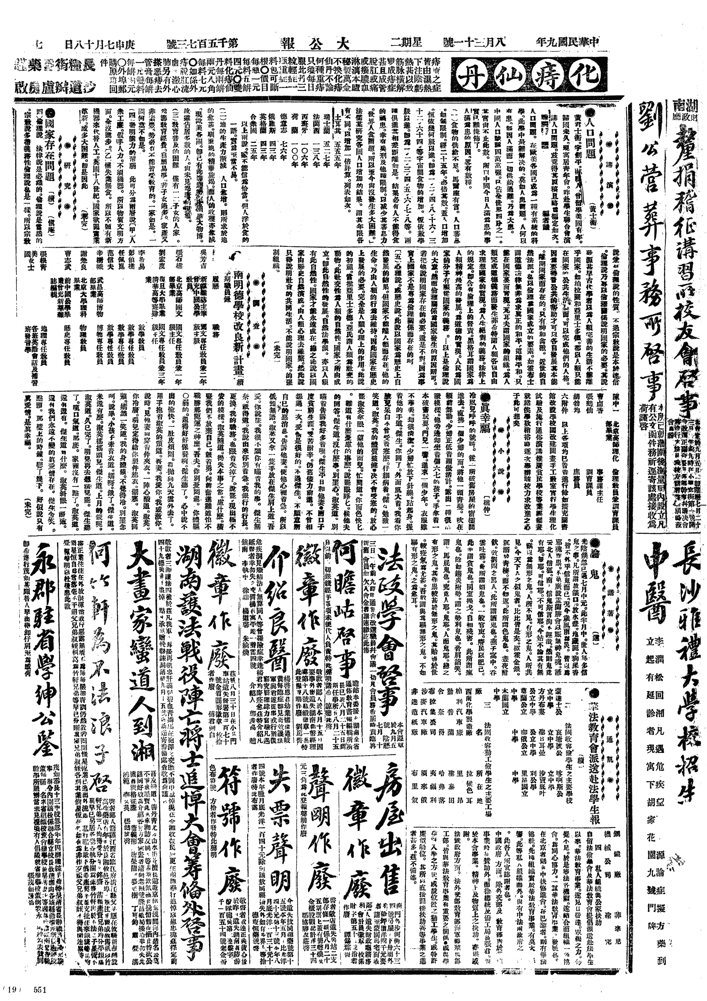 饭后过方正街华英女学,又至丁公祠同善公所,同方絜云、周和甫谈少顷,又访何雨辰,坐久之而归。何雨辰所租之屋,每年租银九十元,可谓贵矣。雨辰无恒产而负担如此之重,则予之生活较雨辰为宽舒,又何必郁郁乎。