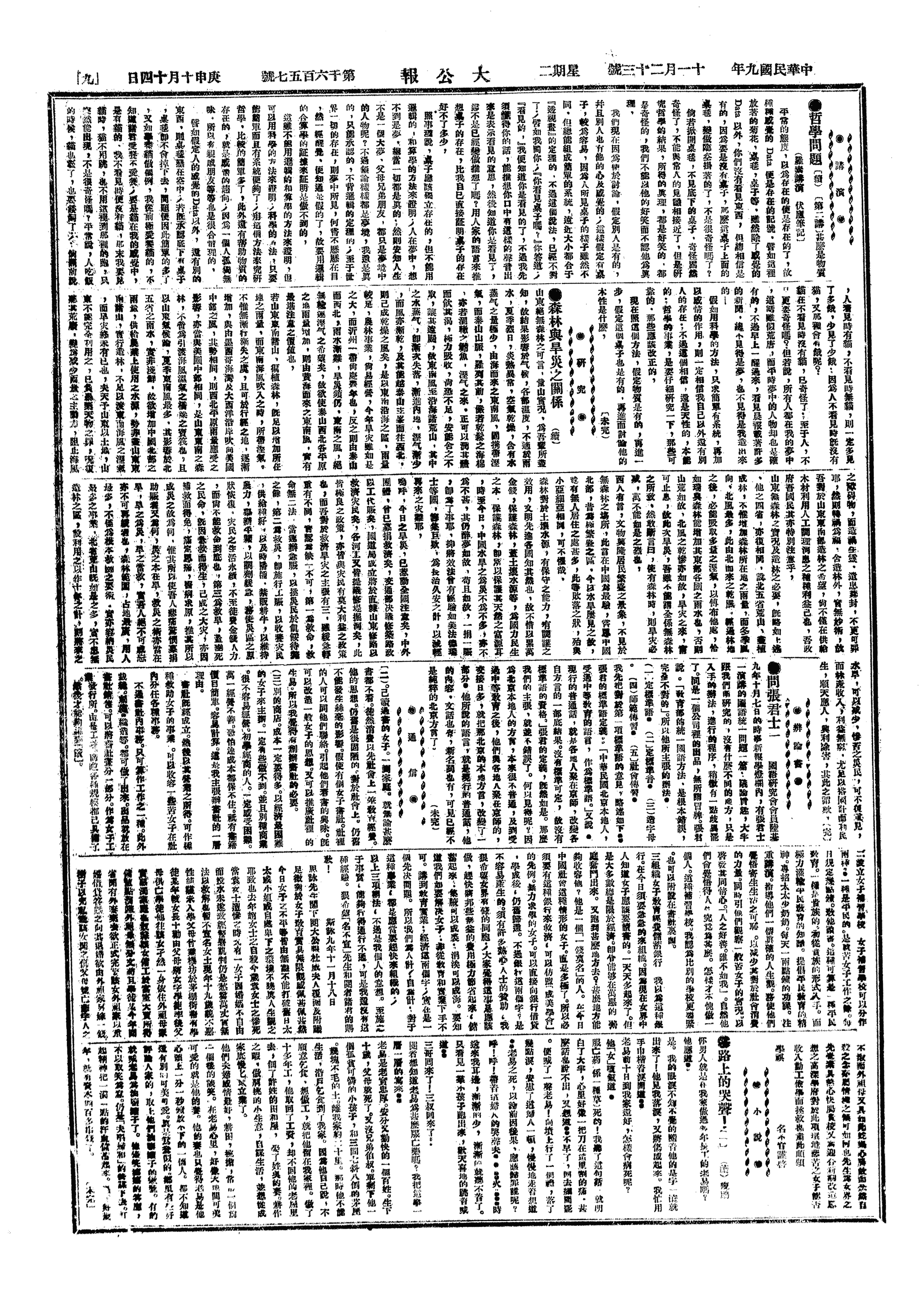 饭后过公学讲《天下篇》。五、六女过晨星法文专修女校报名,缴半年学费十二元方准入学。杨啸谷之妇亦在此读法文。《国民公报》今日将力山信登完矣。午饭后发桓女信,去钱二百三十文。