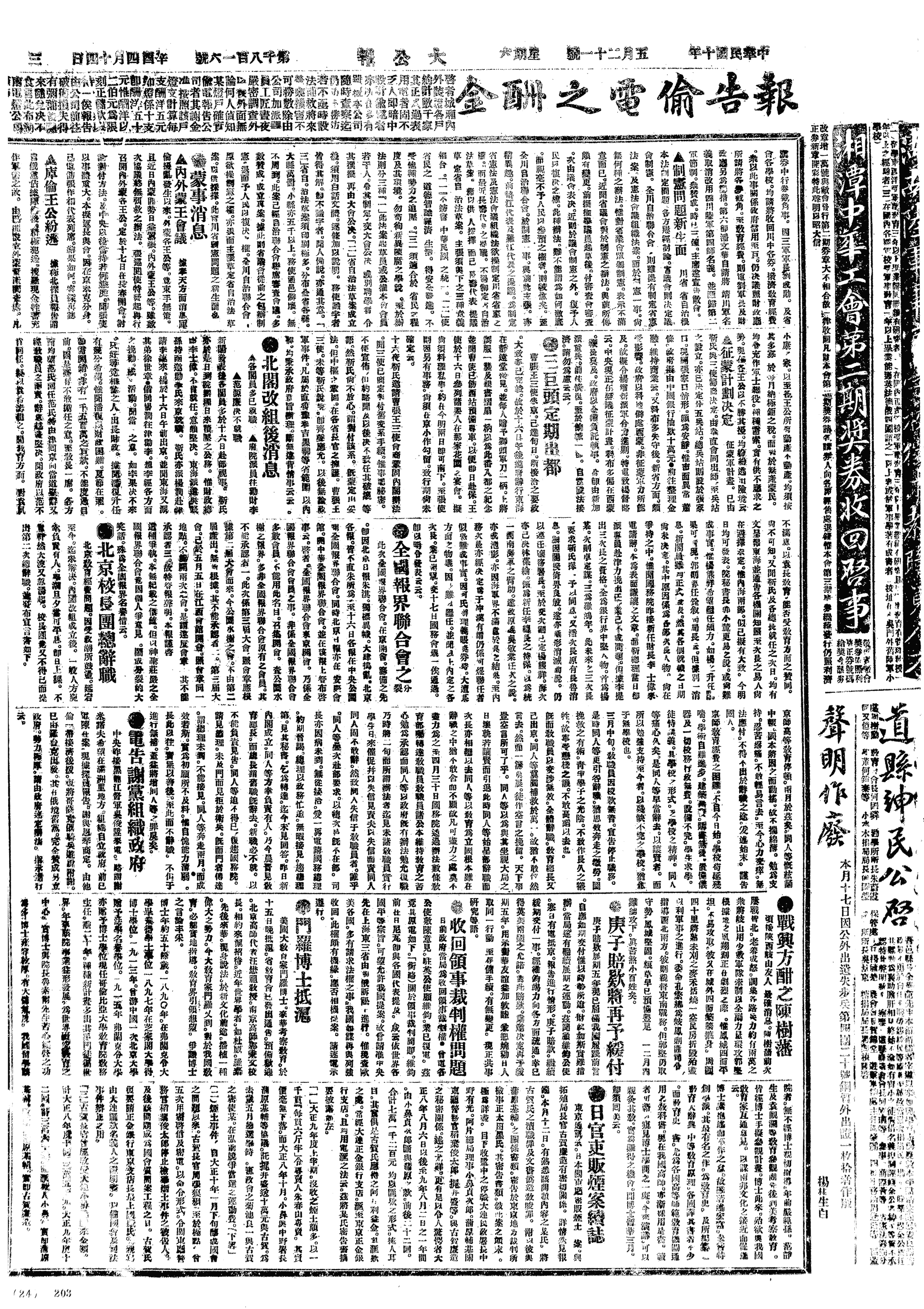 (1)北京国立八校教职员第2次辞职(因国务院以开课为发薪条件)。