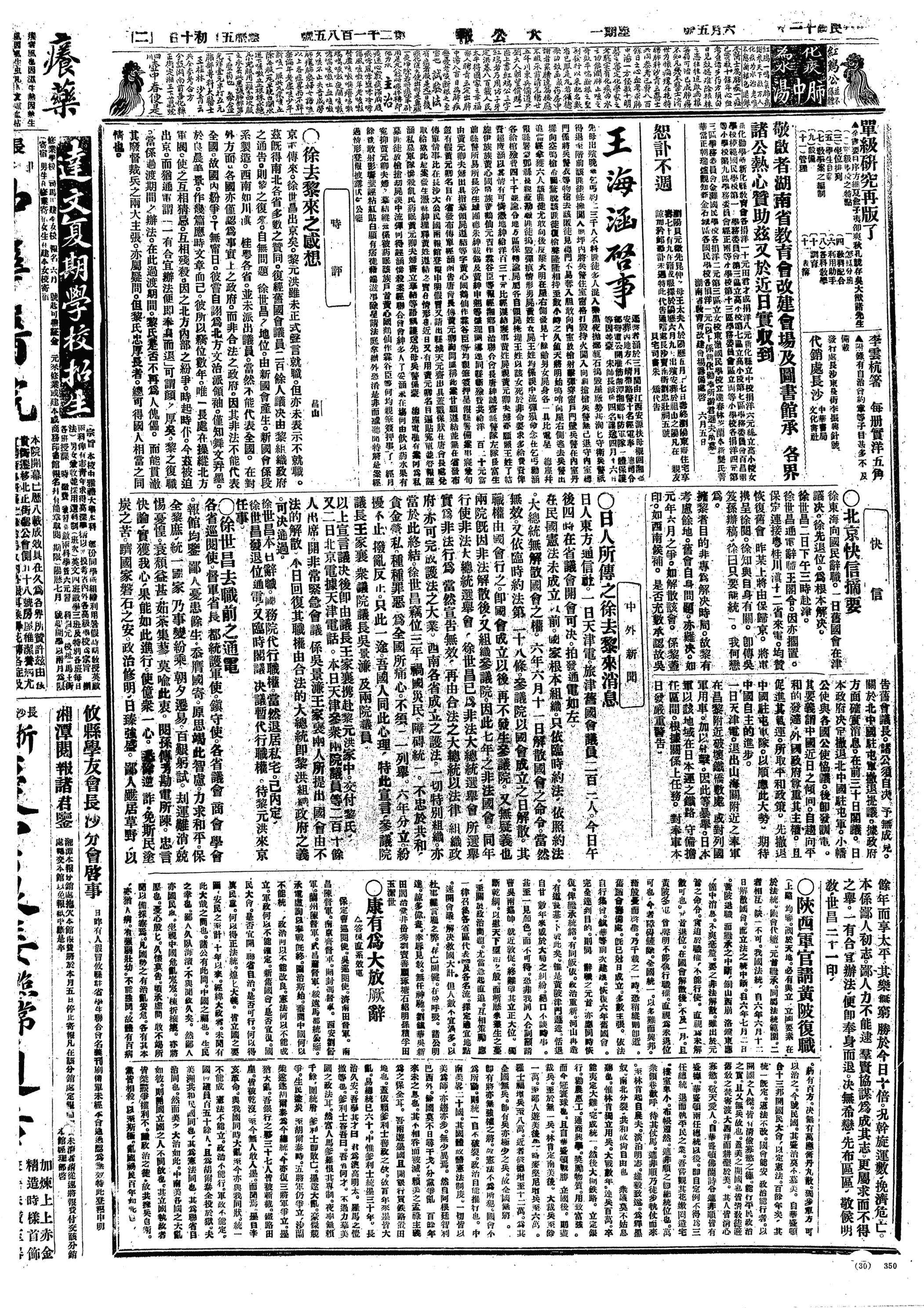 △ 王芝祥、董康、高恩洪电请吴佩孚赴津促黎元洪复职。