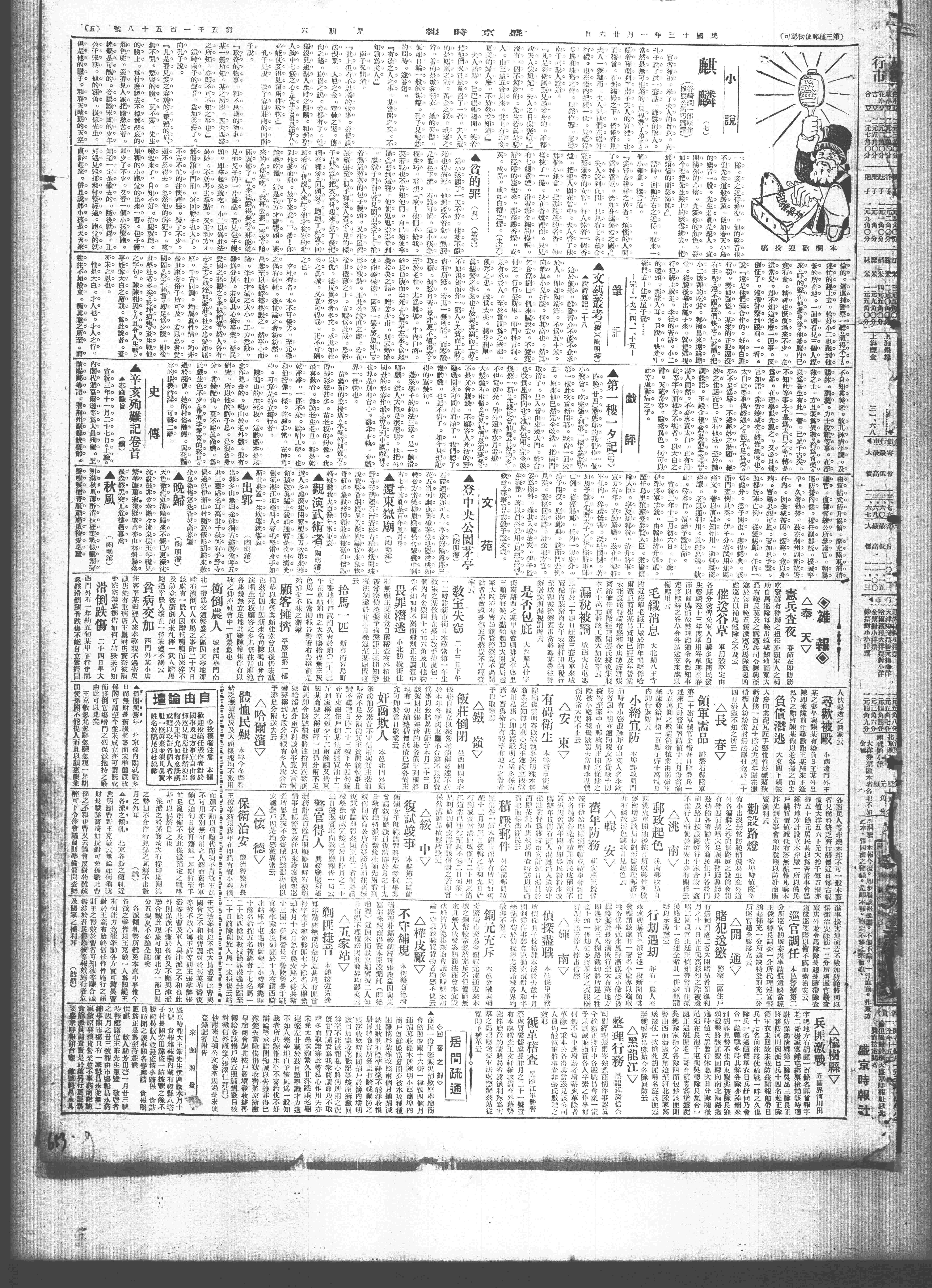 昨半夜甚寒,今日乃大寒节也。北大来通知:寒假照章放21日,自02月01日起,至21日。自22日起,照常上课。夜过术伯谈。守瑕令人交来吴印丞新刻《松邻丛编[书J》,予即携示少坡,值有人斗牌饭酒。予在术伯屋中,听其谈少坡之事,并阅少坡夫人信,始知源利通倒七十余万,少坡财产,根本动摇,生活且有难于维持之势。欠百川银数千元未还,百川亦有怨言。呜呼,一儒者治生,可不急哉。