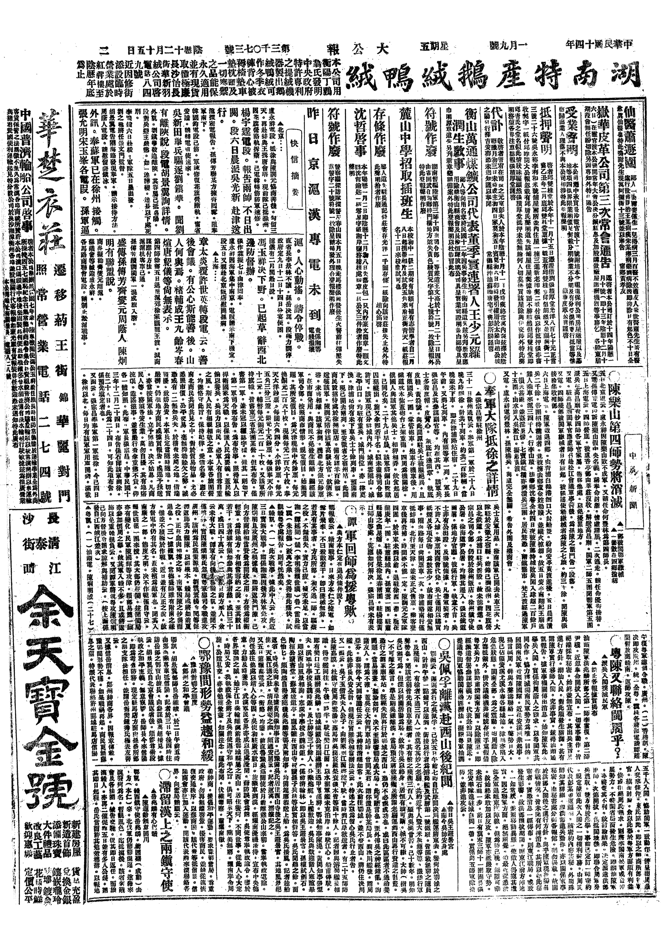 △ 孙传芳、齐燮元分别于是日及次日在杭、沪召集军事会议,决定组织江浙联军总司令部,以齐为第1路总司令,孙为第2路总司令,联合出兵驱逐张允明,拒奉军南下。