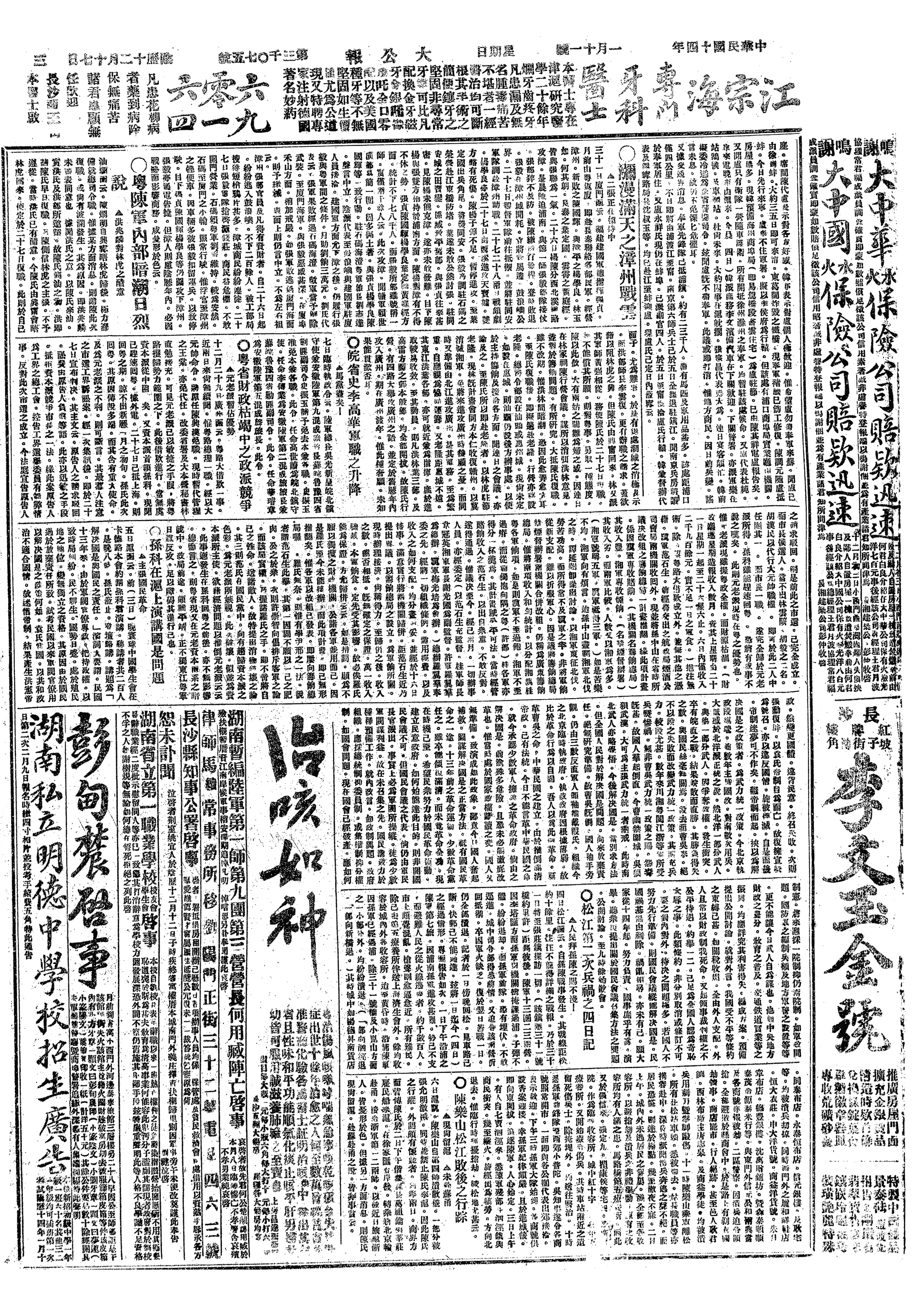 (1)齐燮元指挥第6、第19师联合孙传芳军击溃新任上海护军使张允明军,齐称江浙联军第1路总司令,孙传芳称第2路总司令,宣言拒奉军南下(张部分别被租界缴械及孙传芳改编)。