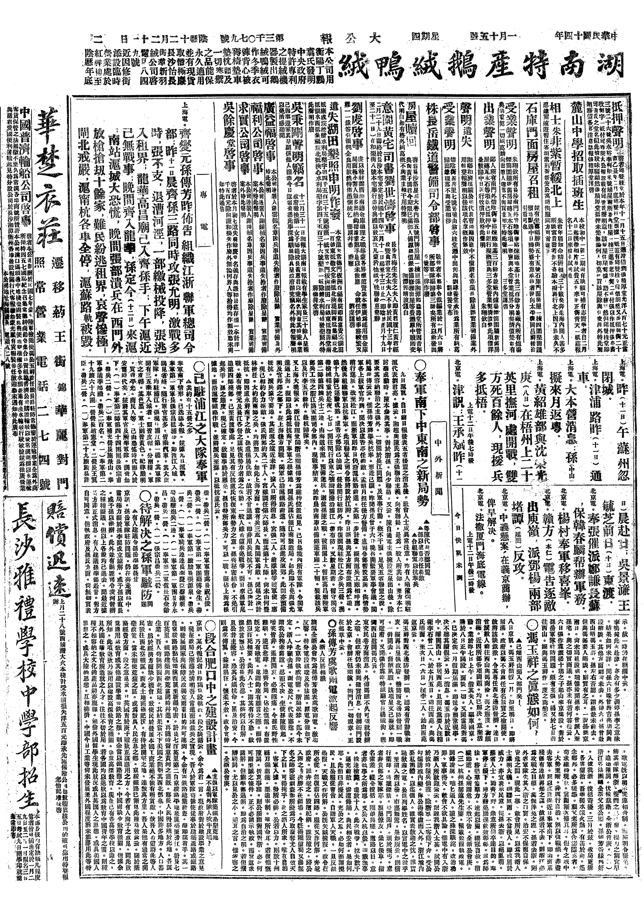 △ 孙传芳、齐燮元迫于形势,联名通电宣布撤退上海地域内所有两省之驻军,废除护军使及镇守使等名目,且反对以后再设置此类军职,兵工厂亦即日择地迁徙。