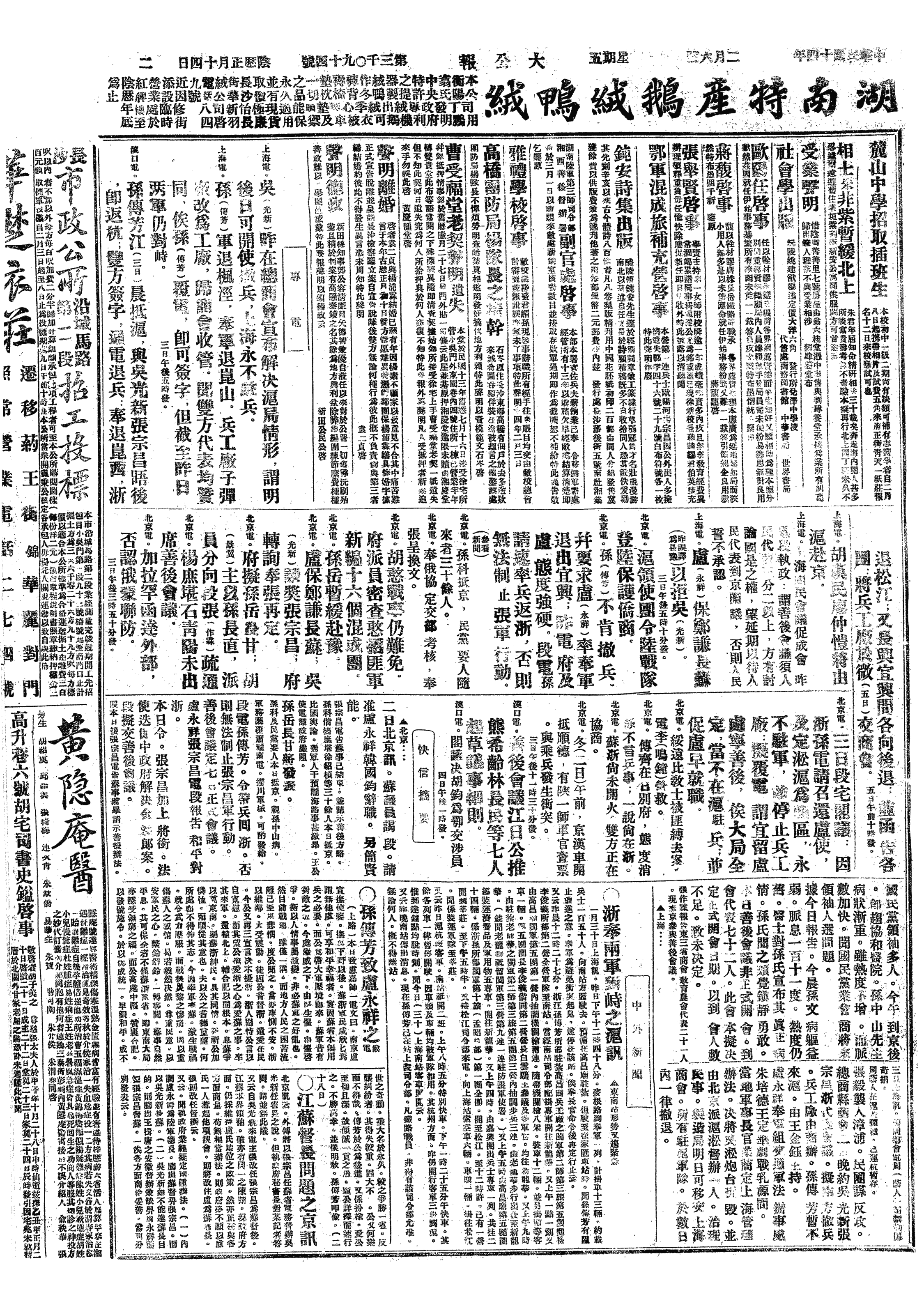 △ 张宗昌以“宣抚第1军军长”名义发布《紧要启事》,声称将参加此次江浙战争之苏属各军一律资遣回籍,不留一兵一卒遗害苏民。