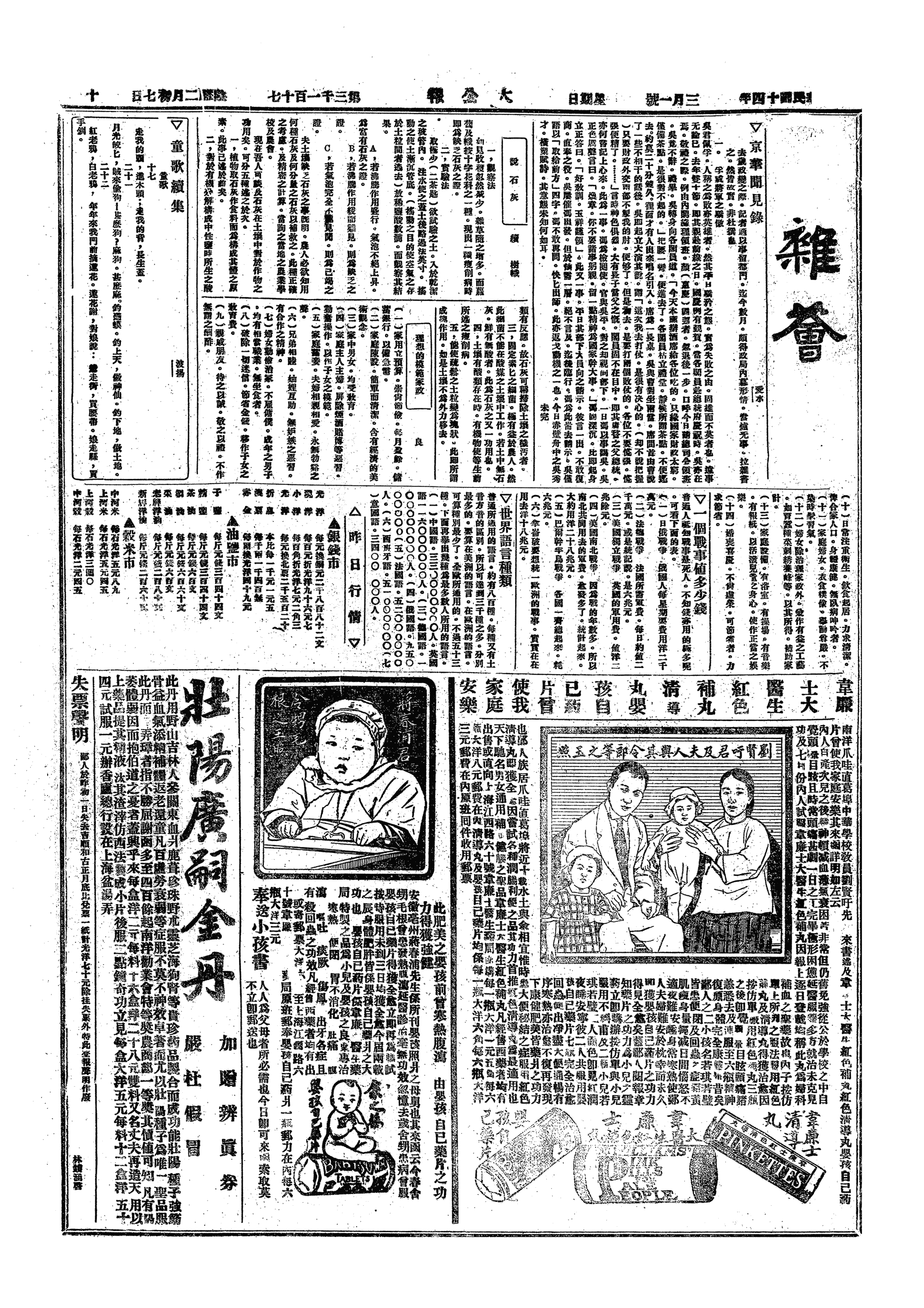 校《声调谱》。《顺天时报》昨日满停止。因其末后一版,无甚可采。“听花”所主之一栏,尤糟不可多言,拟日后改阅《京报》也。近来未游胡同,少受激刺,精神既较为安宁,经济尤为节省。有钱将洋铁匣做就,所有书籍、衣物,次第寄回。暑假归家,行装轻减,岂不妙哉。但大学不可自言辞退,归家后斟酌情形,再定可也。南大来函,校中办一周刊,索稿,予乃开一青年研究文学,所宜读之书目录与之。