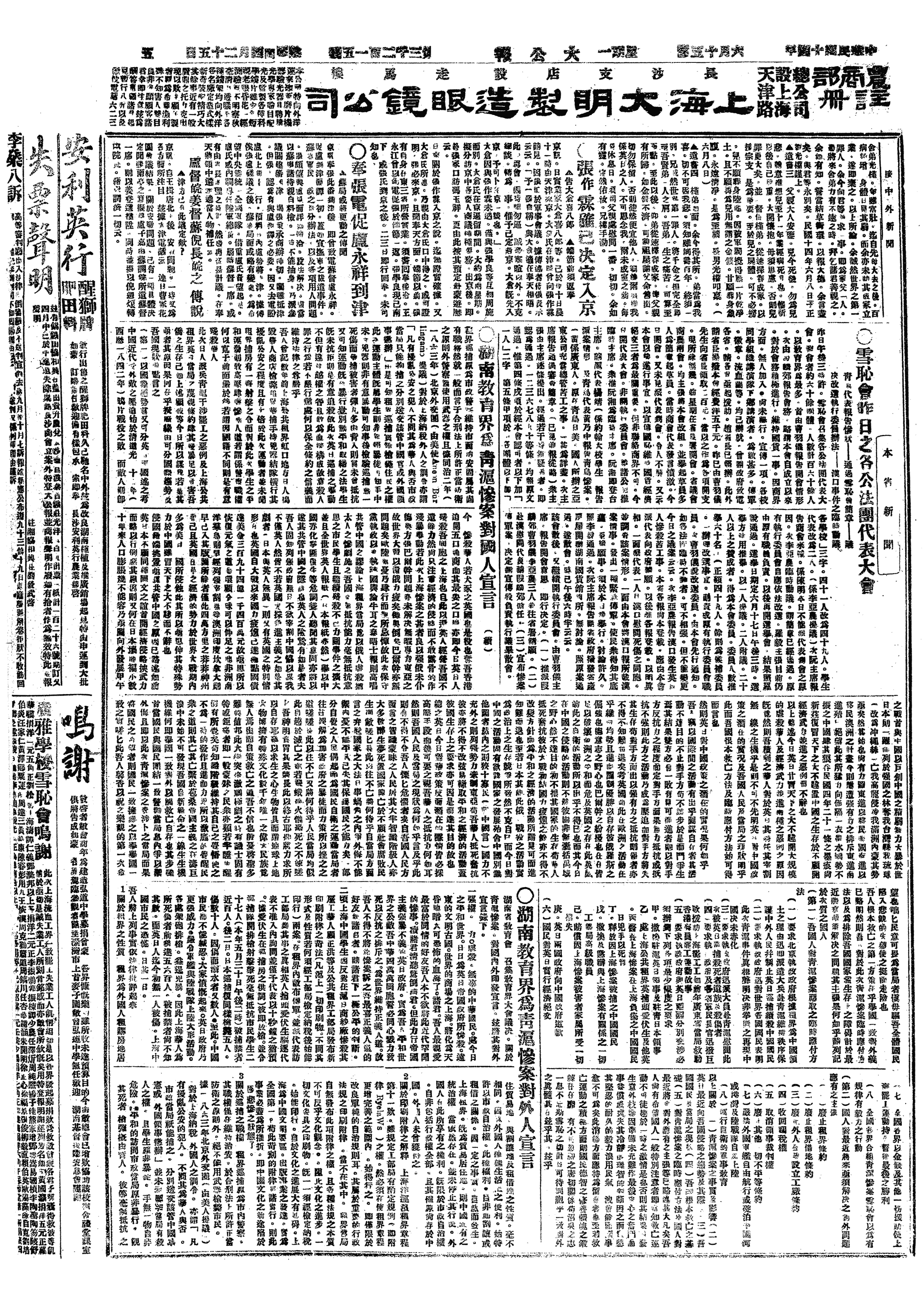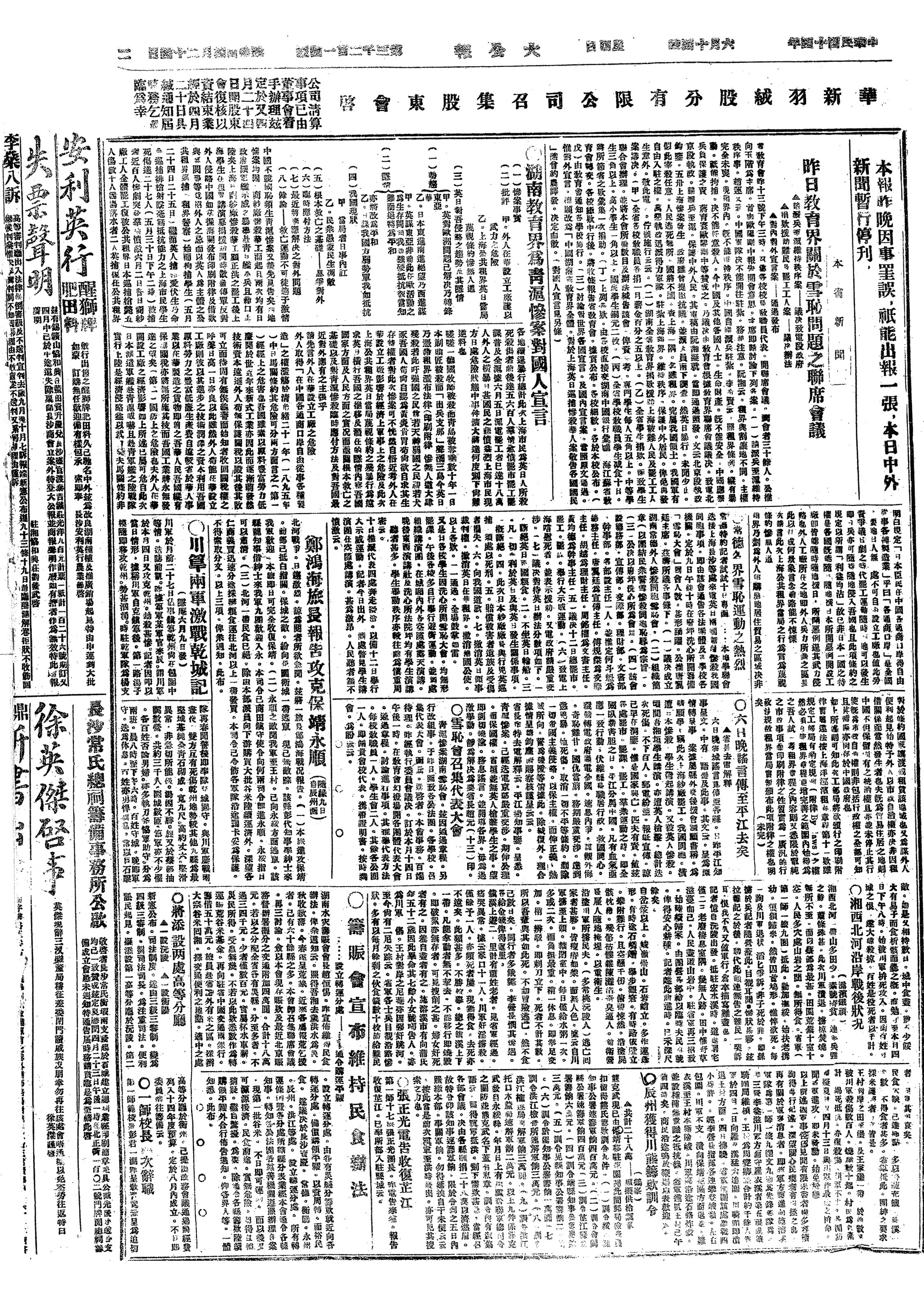议决06月25日全国政商工学各界一律停工、停市、停课半天,停止娱乐及宴会,并下半旗志哀,举行大示威运动,表示全国人心一致,由本日到会团体通电全国一致举行。