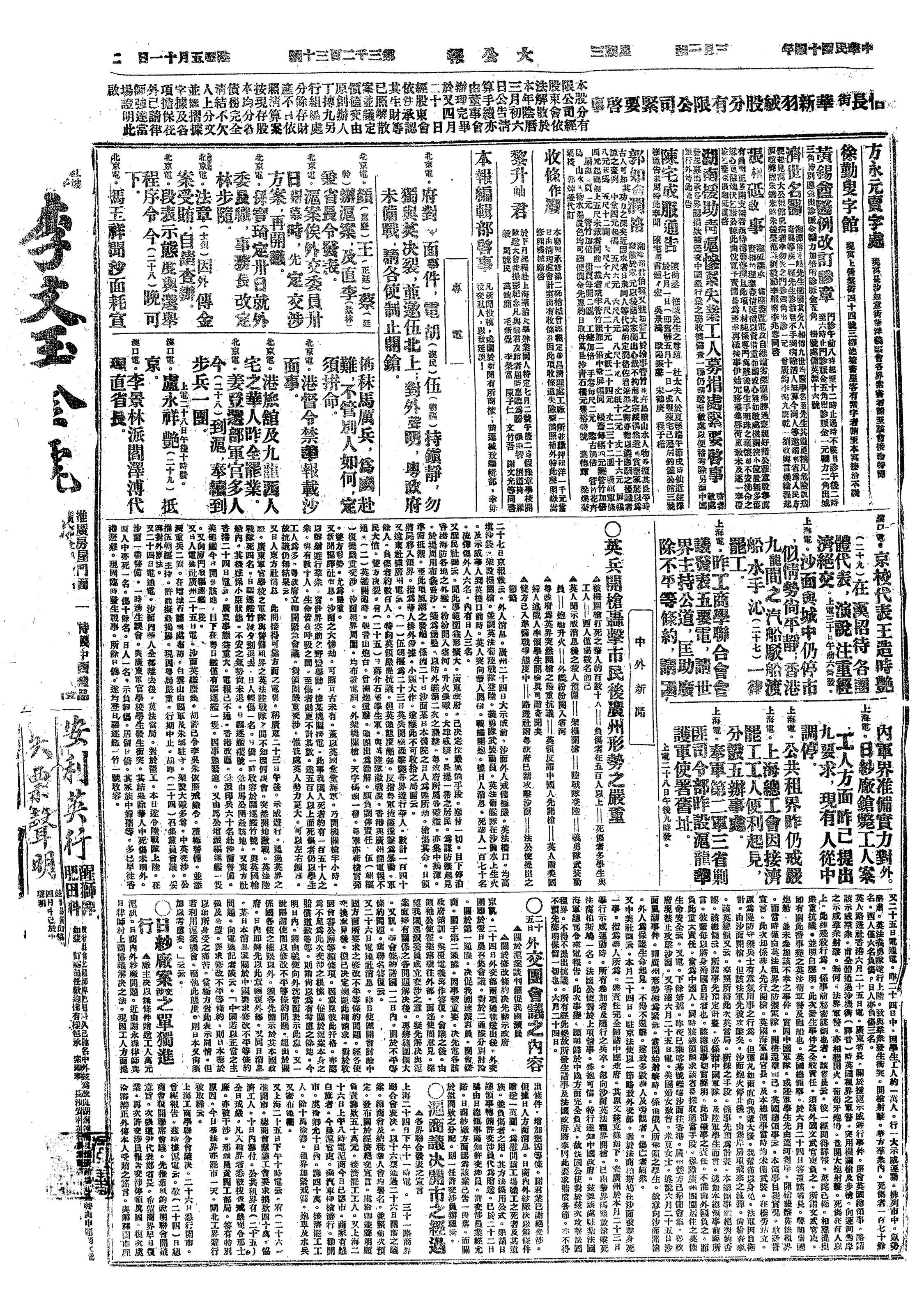 广州市10万人齐集会场,高呼“拥护国民政府”、“实现孙先生遗嘱”、“废除不平等条约”等口号。