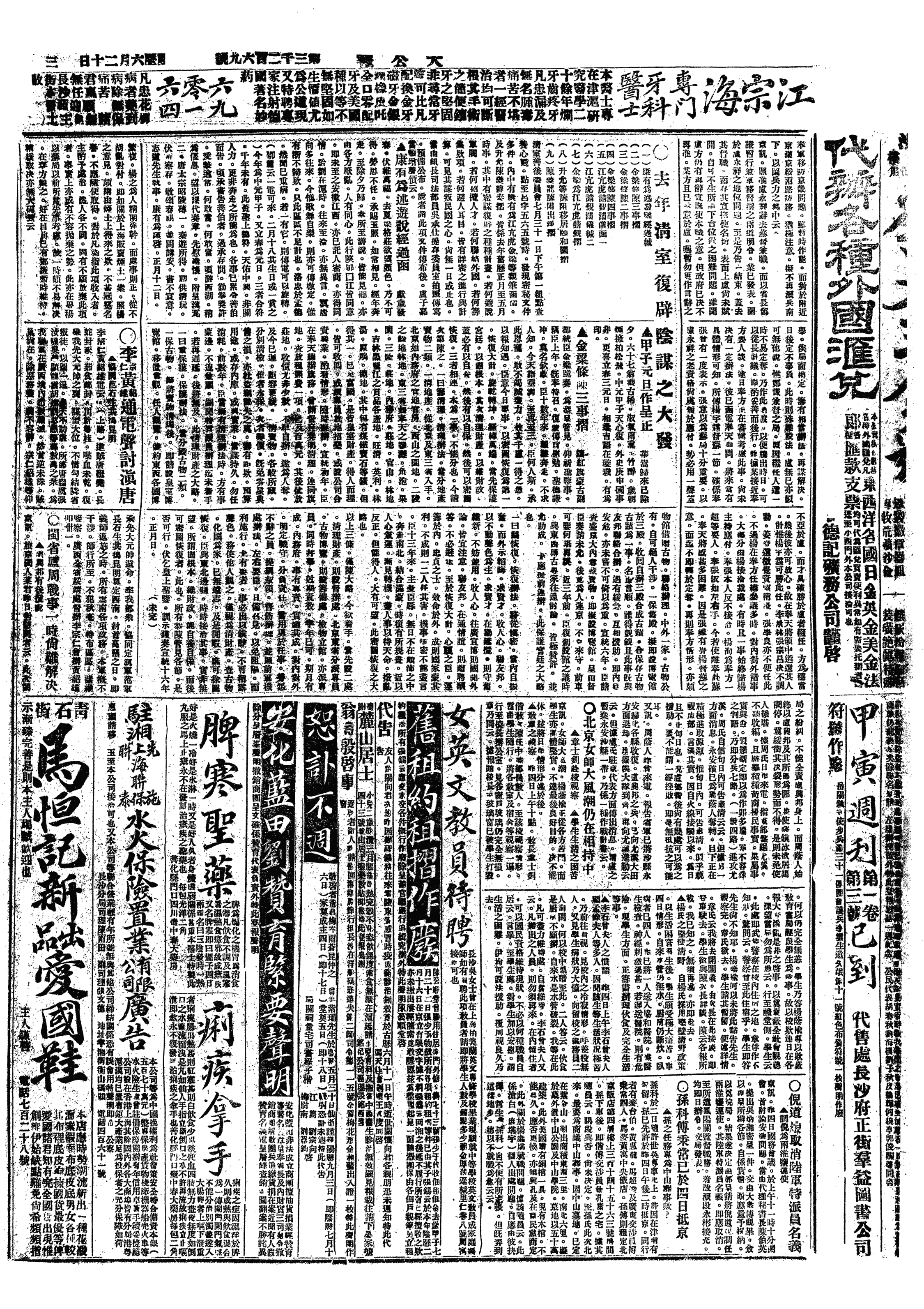 (3)天津美商宝成等纱厂工人二万因厂主压迫,罢工,厂主美人开枪,伤二十余人。