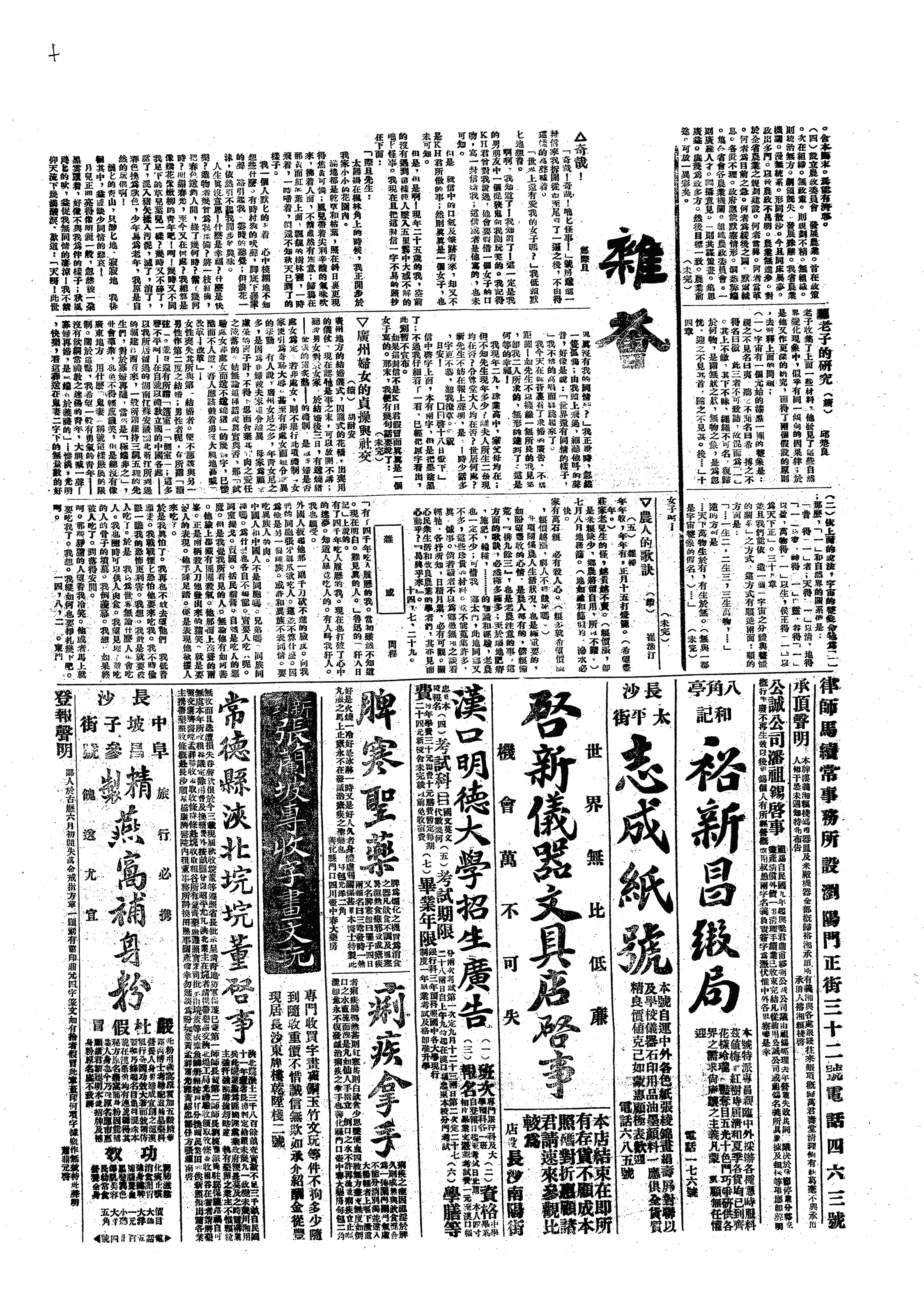 通电九澧广种杂粮度荒。电云:“天祸吾湘,歉岁迭遭,水灾甫已,旱灾踵至,秋收无望,后顾堪虑,与其非议于事后,不若挽救于事前。挽救之法,不外治标治本之法。治标则唯禁止装运,以及募捐施赈。治本则劝导乡民广种杂粮、豆麦疗饥,诚使杂粮丰获,亦足济民食,而免饥荒也。”
