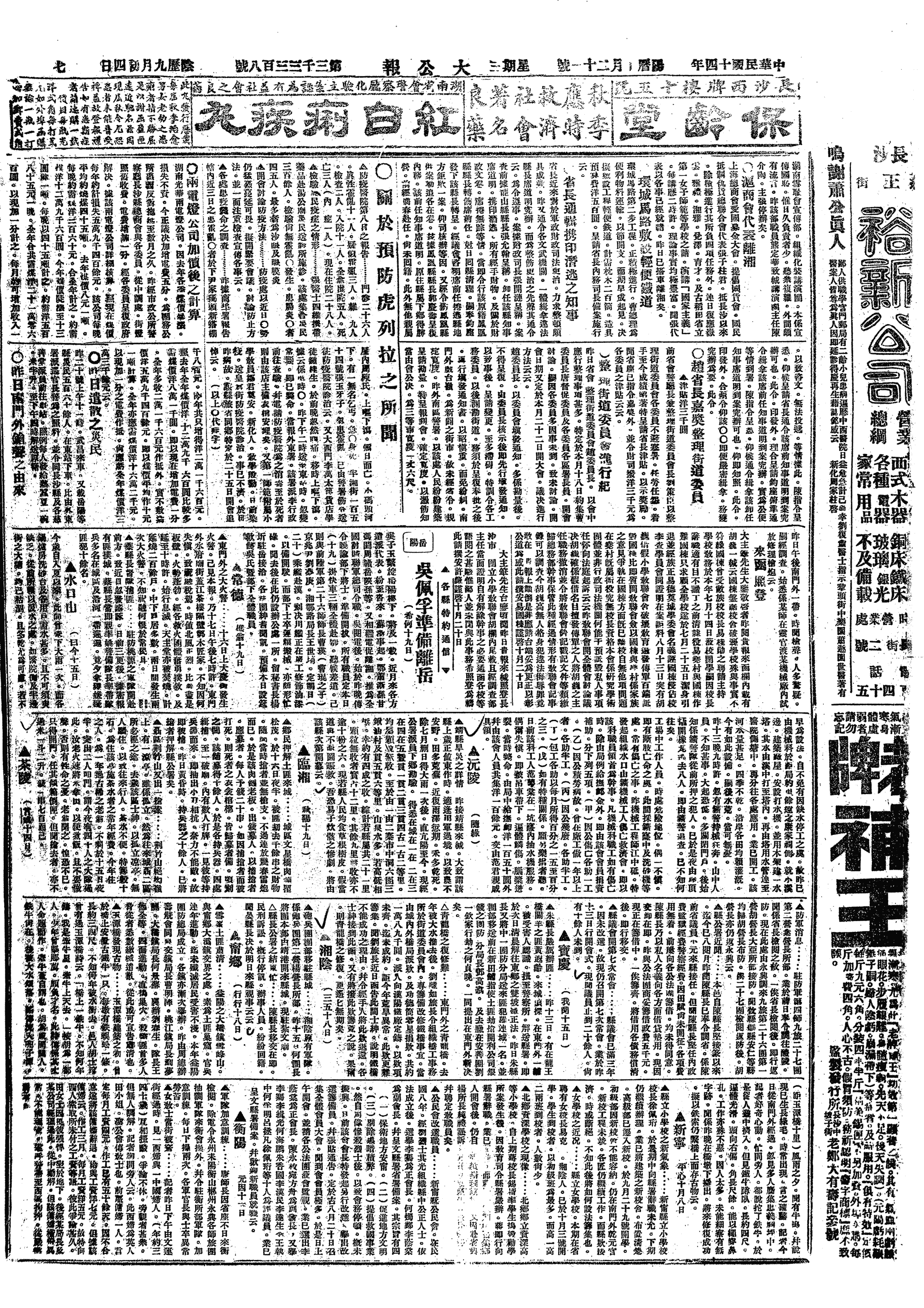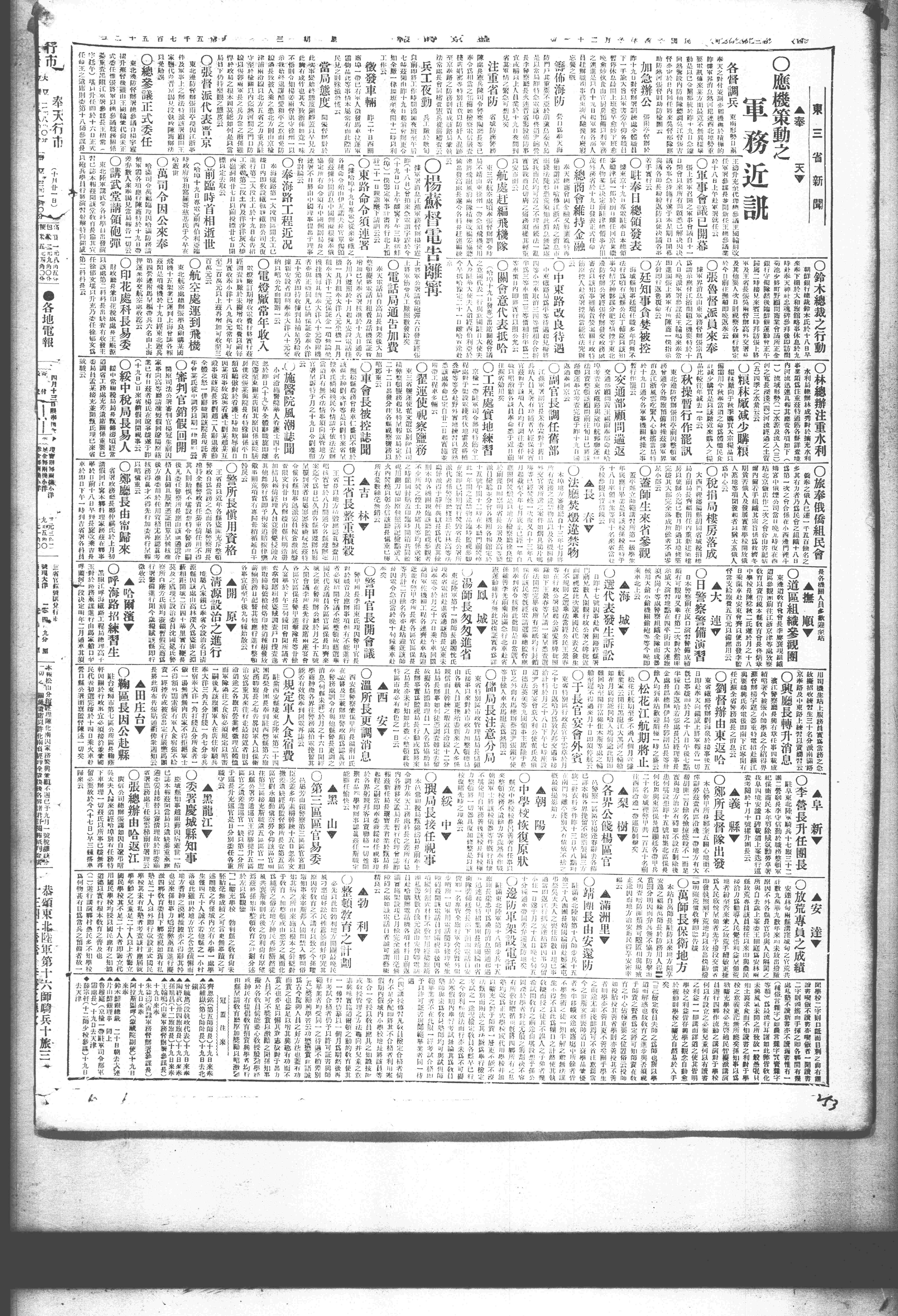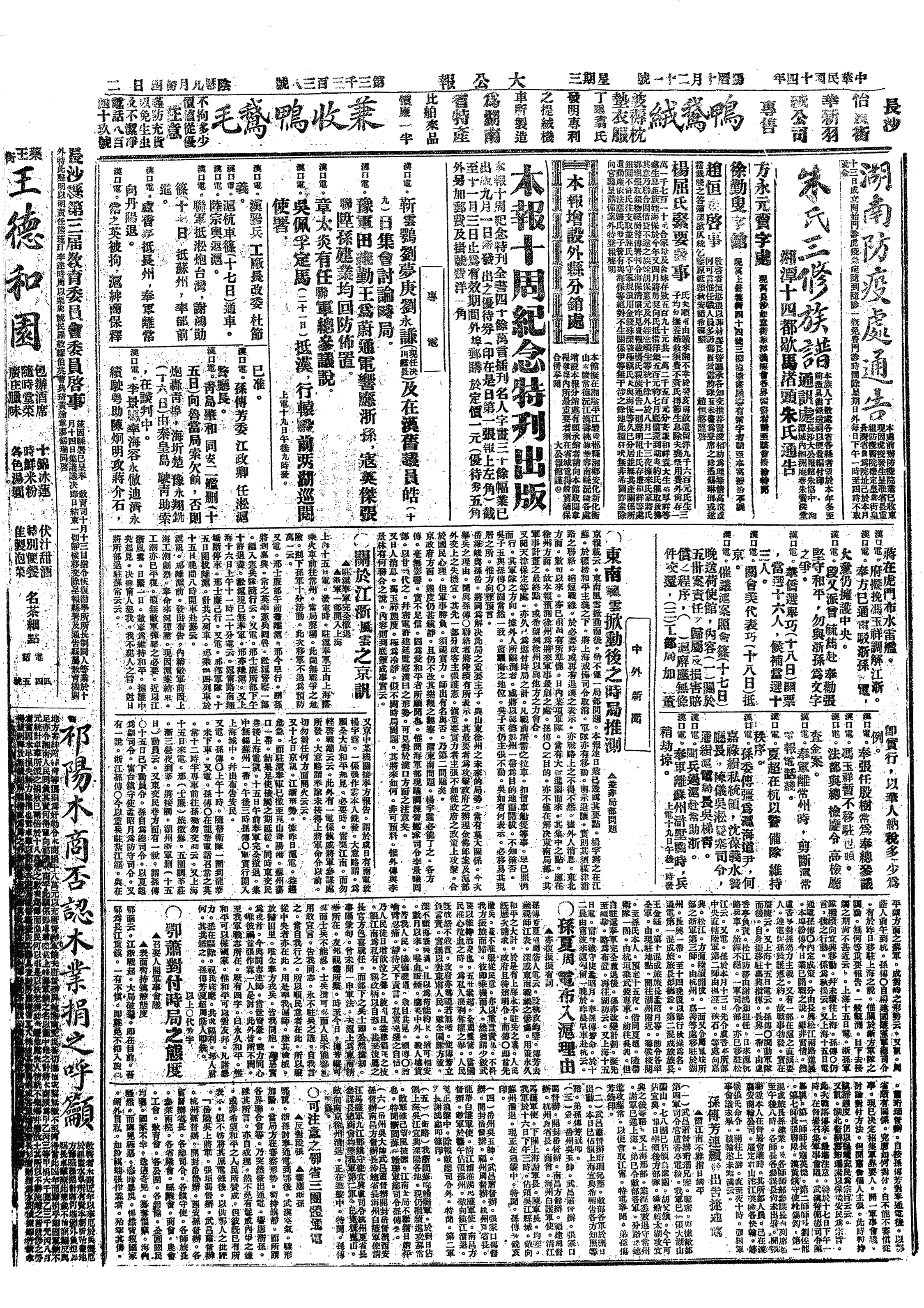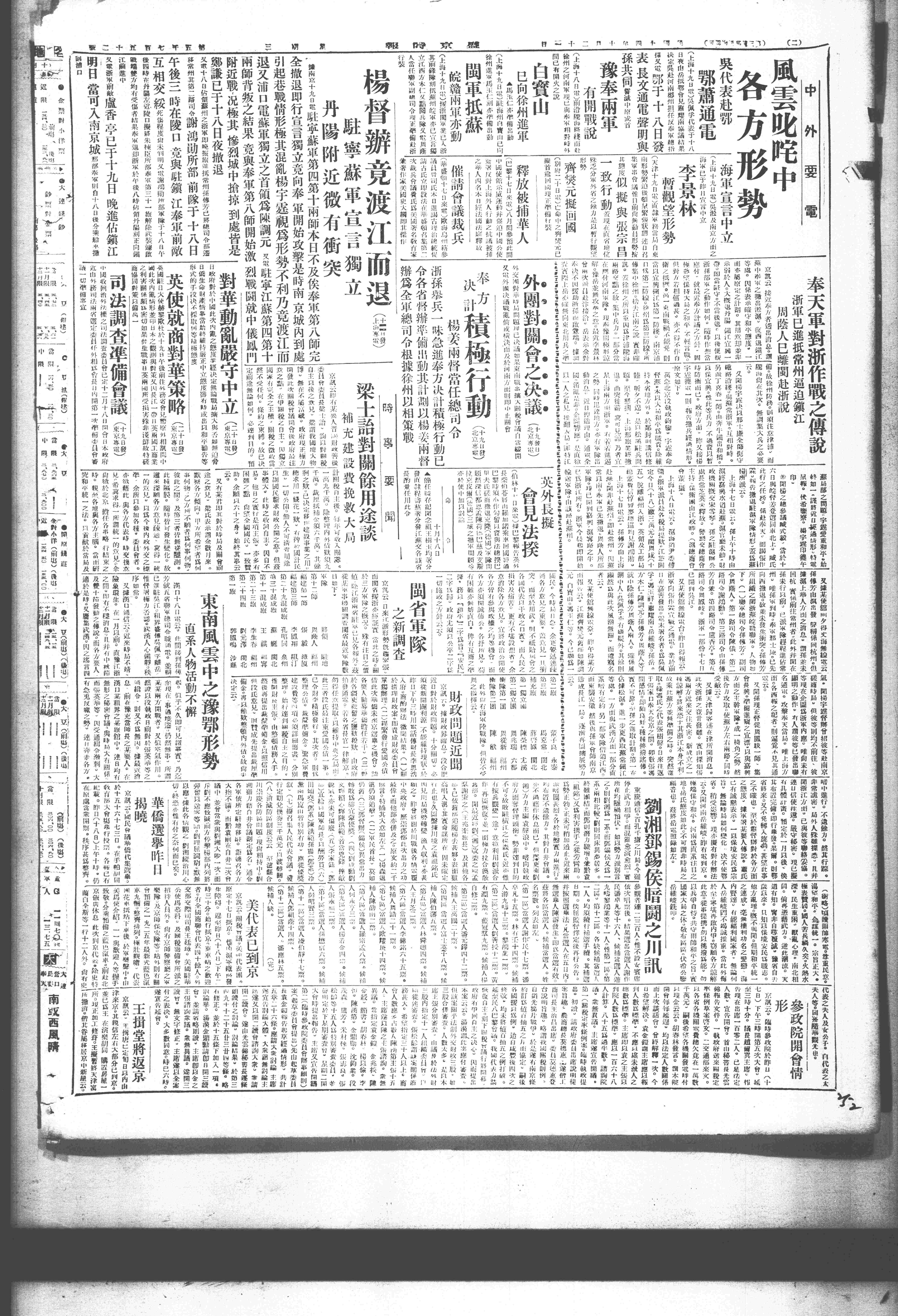 △ 苏军将领陈调元、郑俊彦、白宝山、马玉仁等20人联名电请齐燮元迅速回国,主持大计。