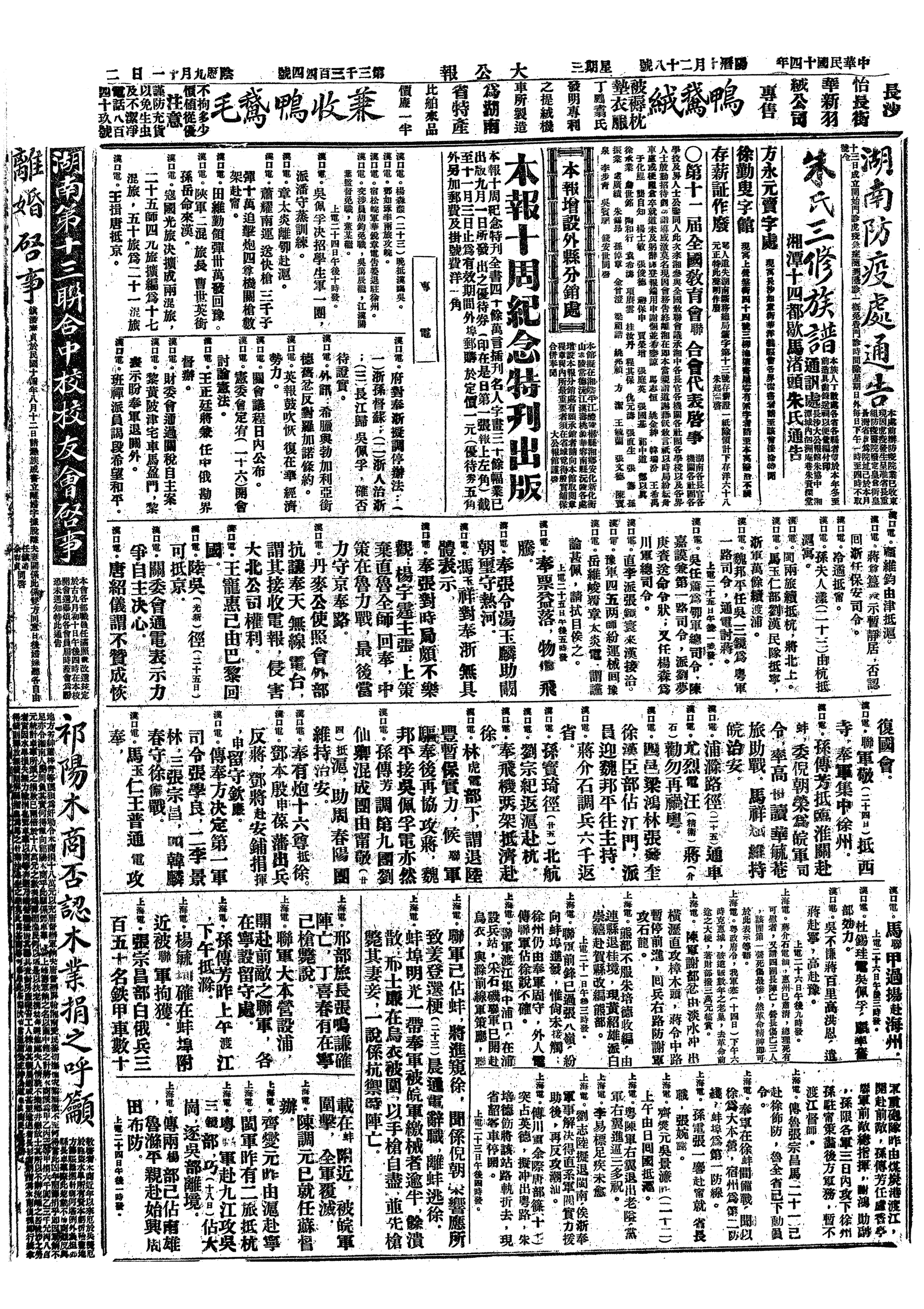 (3)山东张宗昌东路军及奉军邢士廉占江苏海州,孙传芳调陈调元、郑俊彦等赴援。