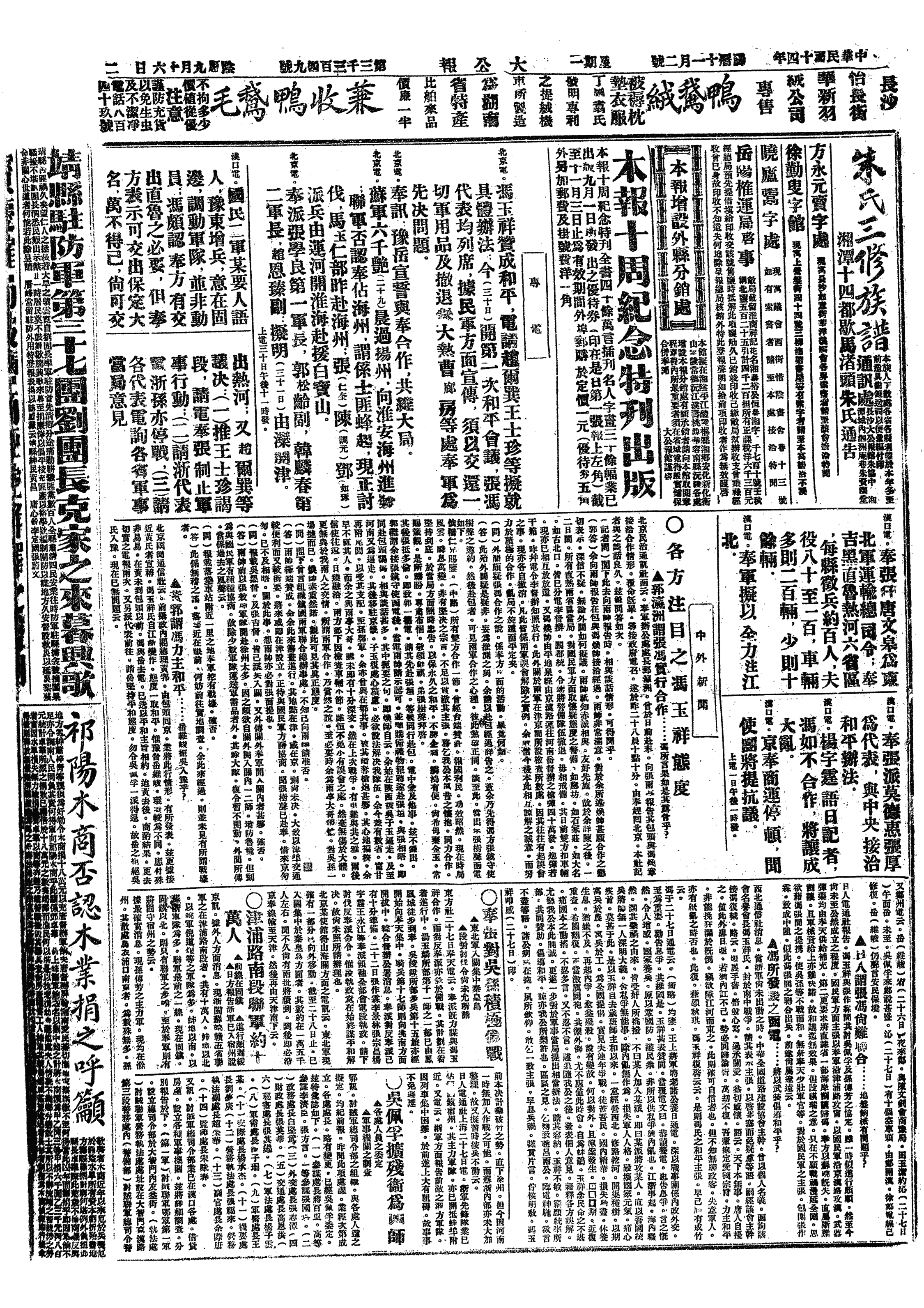 (2)冯玉祥通电主张和平。