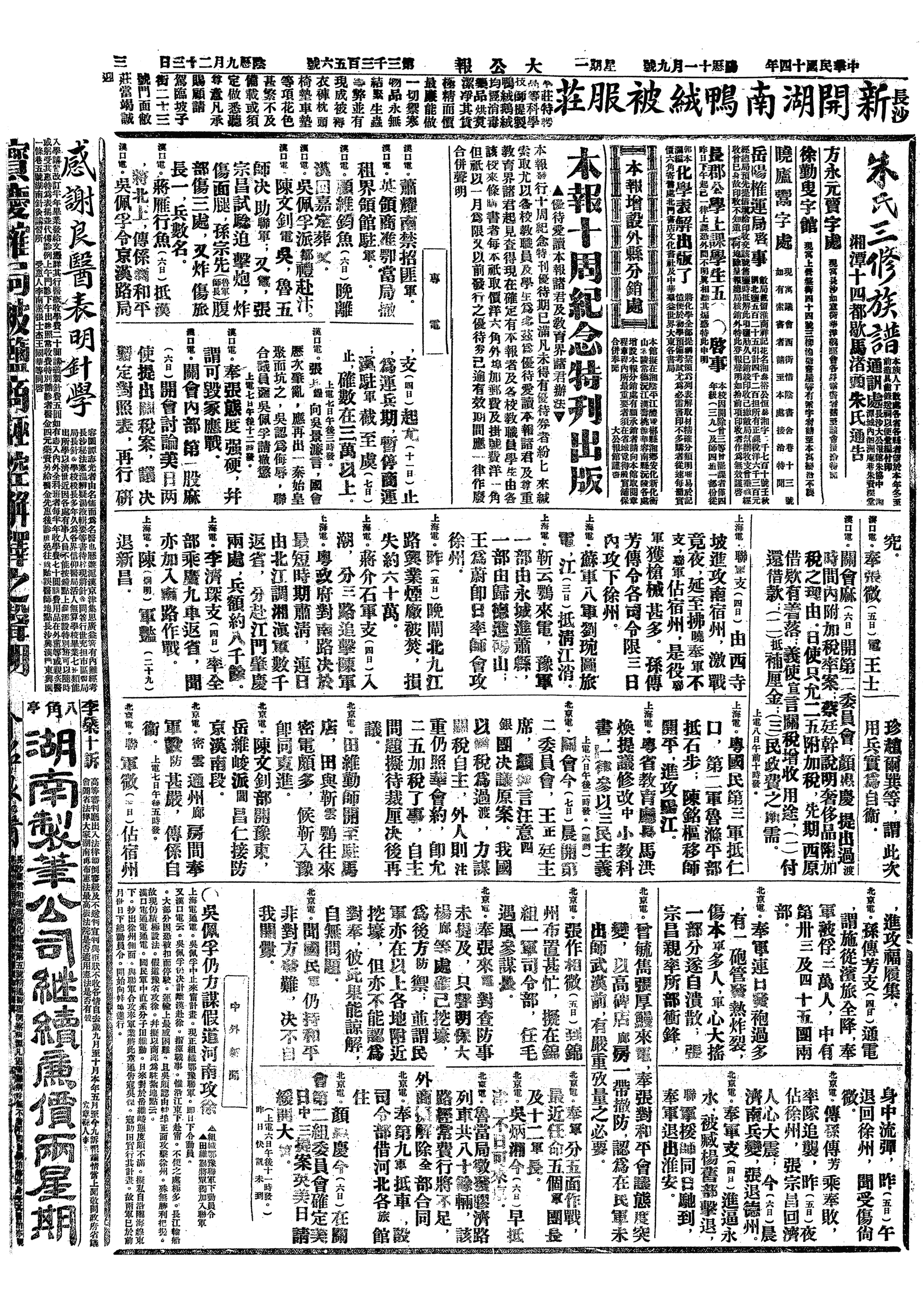 △ 孙传芳由南宿州进驻徐州,联军总司令部亦移设徐州。