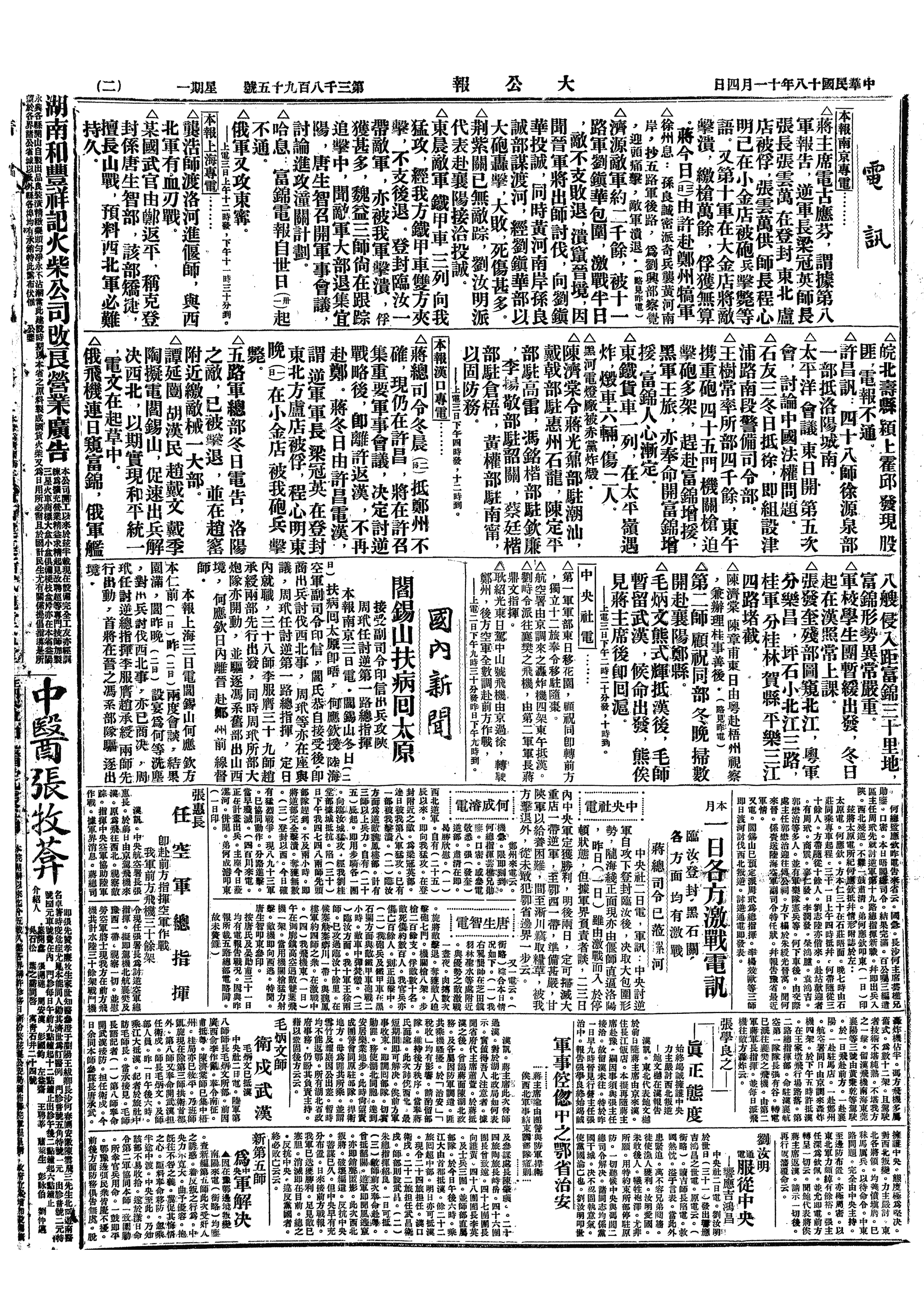 上午批阅,写信,会客,第1师今晨已完全集,逆军犹不敢出密县东犯,则阵脚已稳。