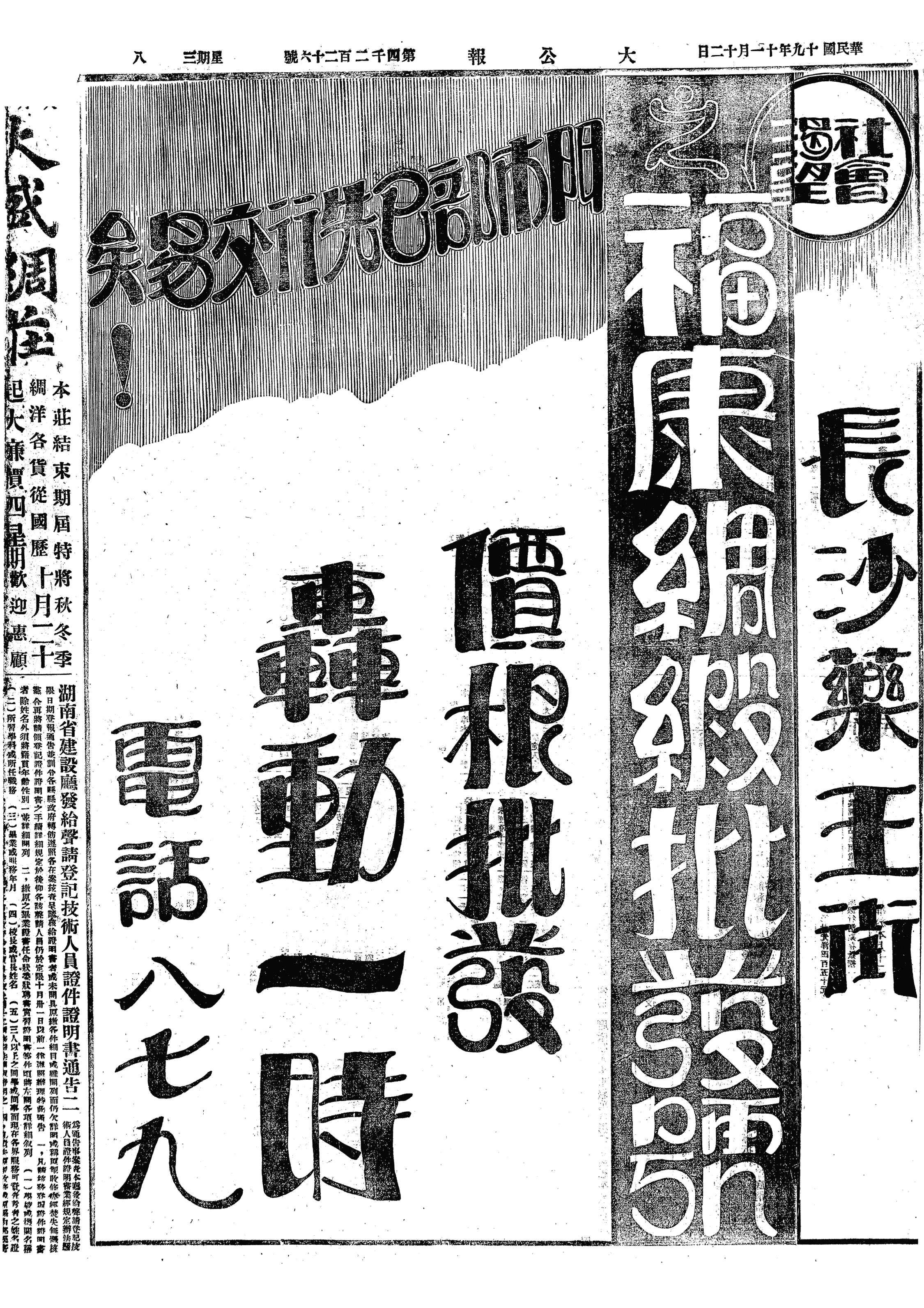 △ 红三军团彭德怀部近在平江会议,宣言再取长沙。孔荷宠部移驻汨罗、新市,以断湘、鄂交通,拟西与贺龙部会合。11日,陶广师由官家桥一带向平江推进。是日,湘军彭位仁急率刘旅占领汨罗、归义(位于湘阴县北)。