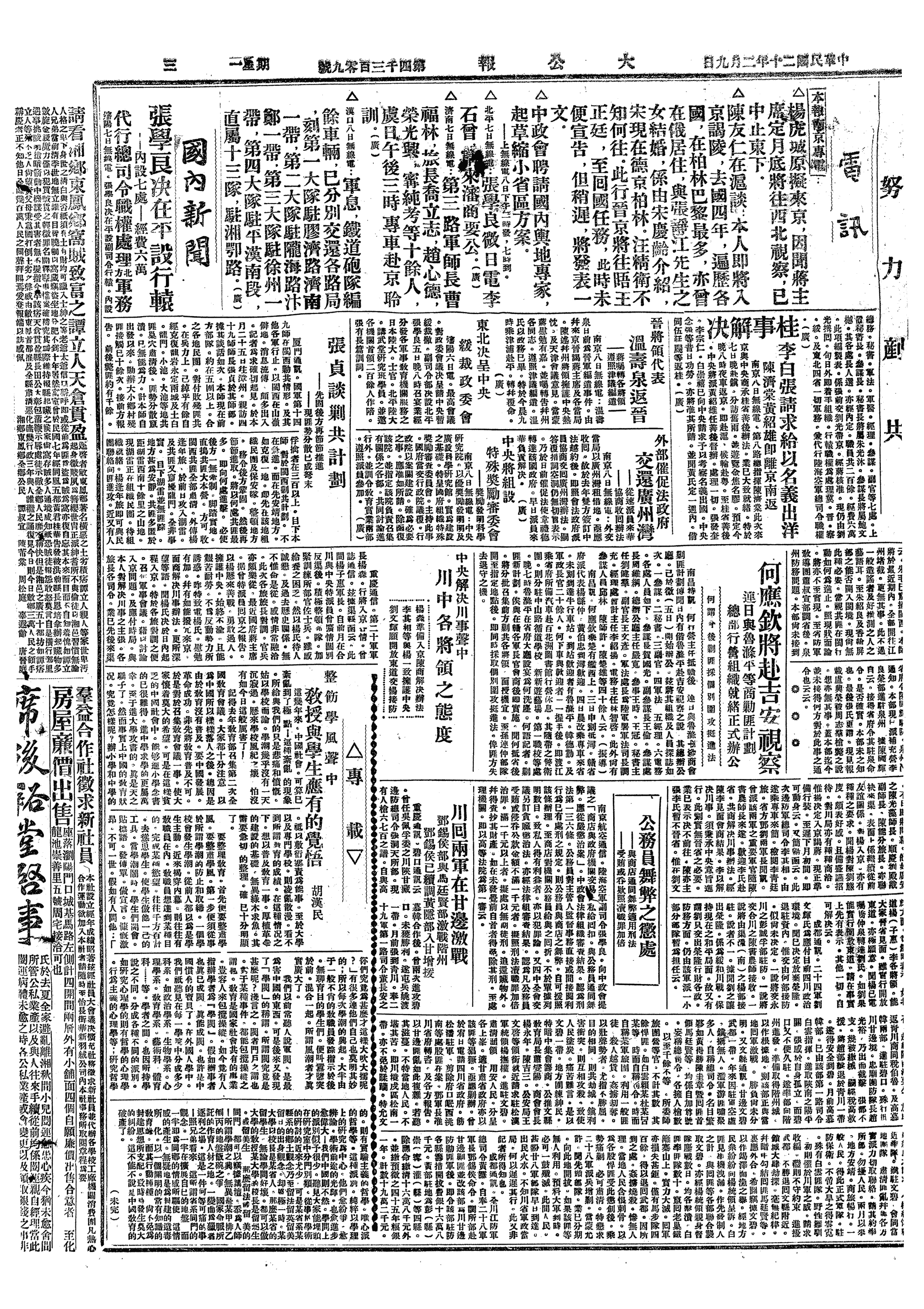 △ 山西善后协进会代表张策等到南京向国民党中央请愿,提出要求五点:一、晋军应照中央军编制,一律改编为国防军,开驻边境;二、实行军民分治,打破军官独裁;三、恢复中央前颁2400万元整理山西金融公债,省银行收归公有,由人民组织监督机关;四、兵工厂改为生产事业工厂,兴修同蒲路,收回正太路;五、各级学校立即复课。