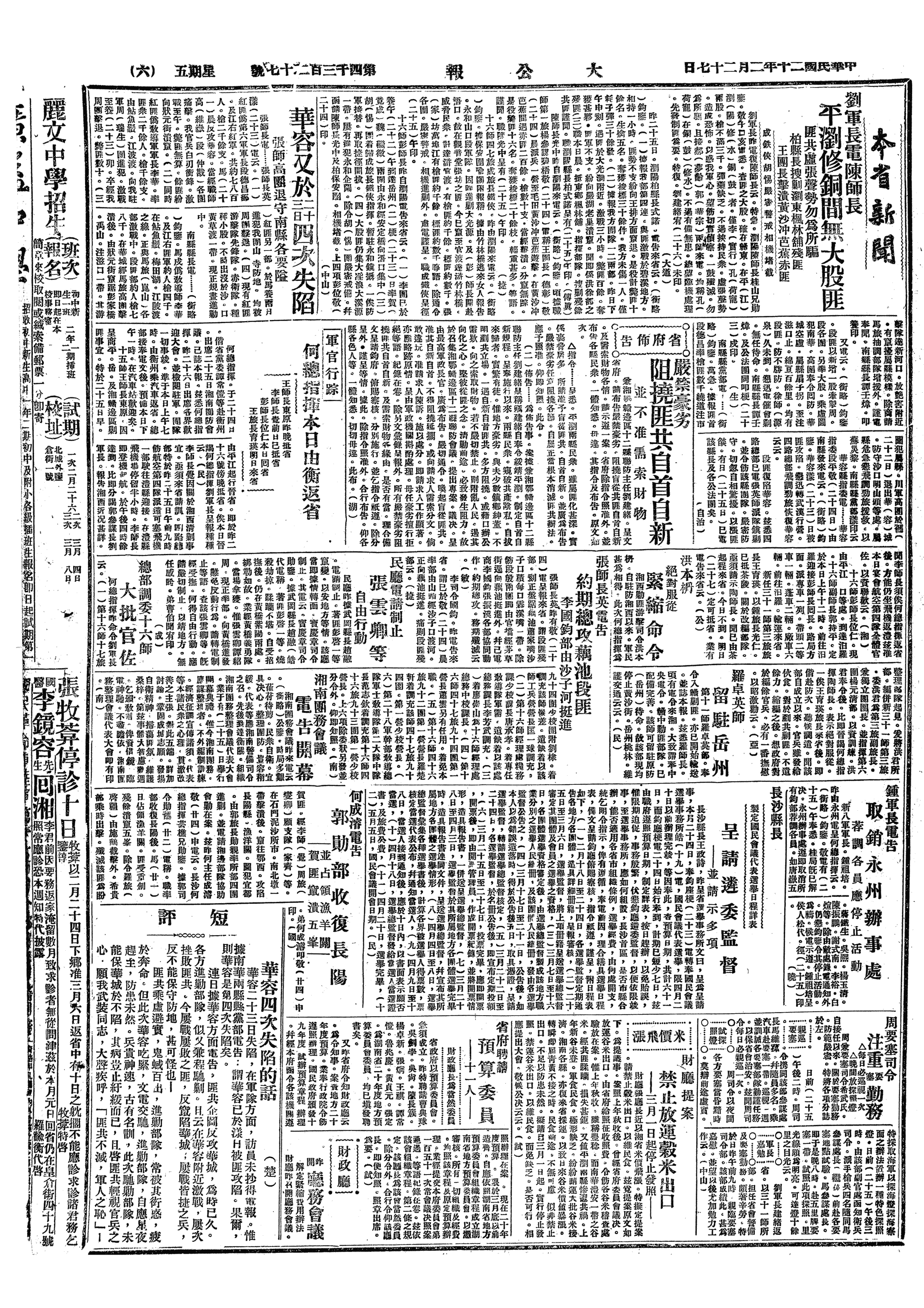 △ 国民政府明令改组四川省政府,原四川省府委员刘文辉、邓锡侯、向传义、任鸿隽、刘湘、田颂尧、黄复生、吕超、熊骅、卢仲琳均免本职,田颂尧、邓锡侯、任鸿隽、向传义分别免去民政、财政、教育、建设各厅厅长兼职;