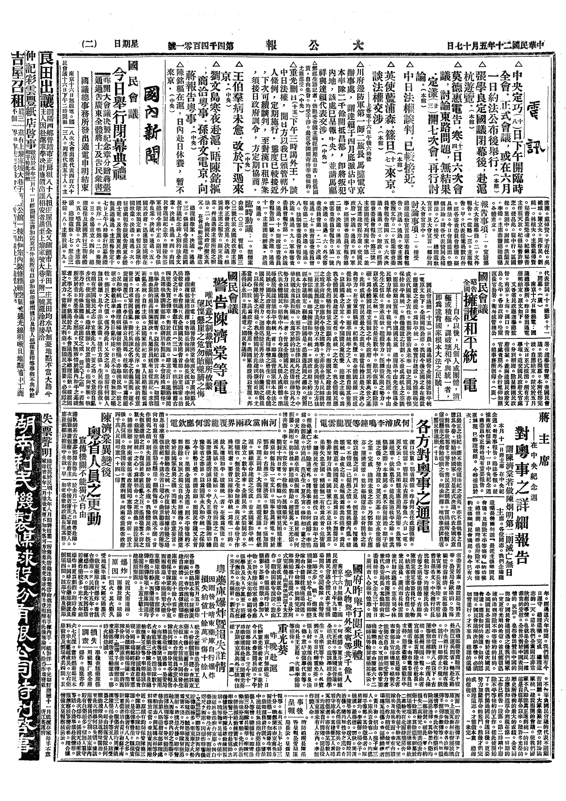 甲、国民会议举行闭幕典礼,周作民主席,于右任读宣言,戴传贤、蒋中正致闭幕词。