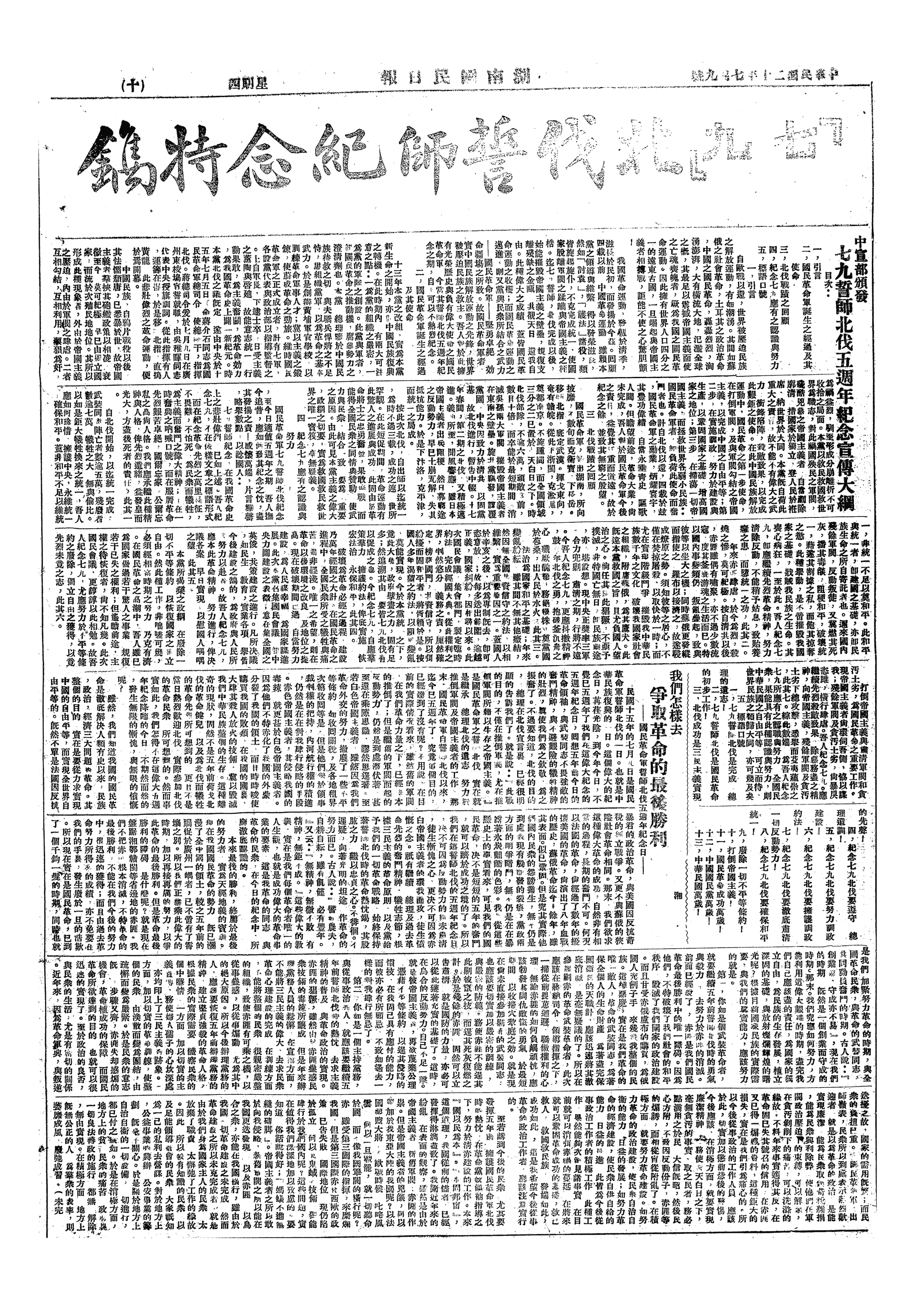 今日为北伐誓师五周年纪念日,蒋中正有感曰:「誓师五年,而广东反叛,赤匪枭张,国家分裂,不能统一,对总理与已死之将士以及全国军民,实不自安,内心之焦灼,未有若此时之甚者,但精神较佳,自信亦深,有我在则必有中国独立完成之01日,亦必有三民主义实行之01日也。」