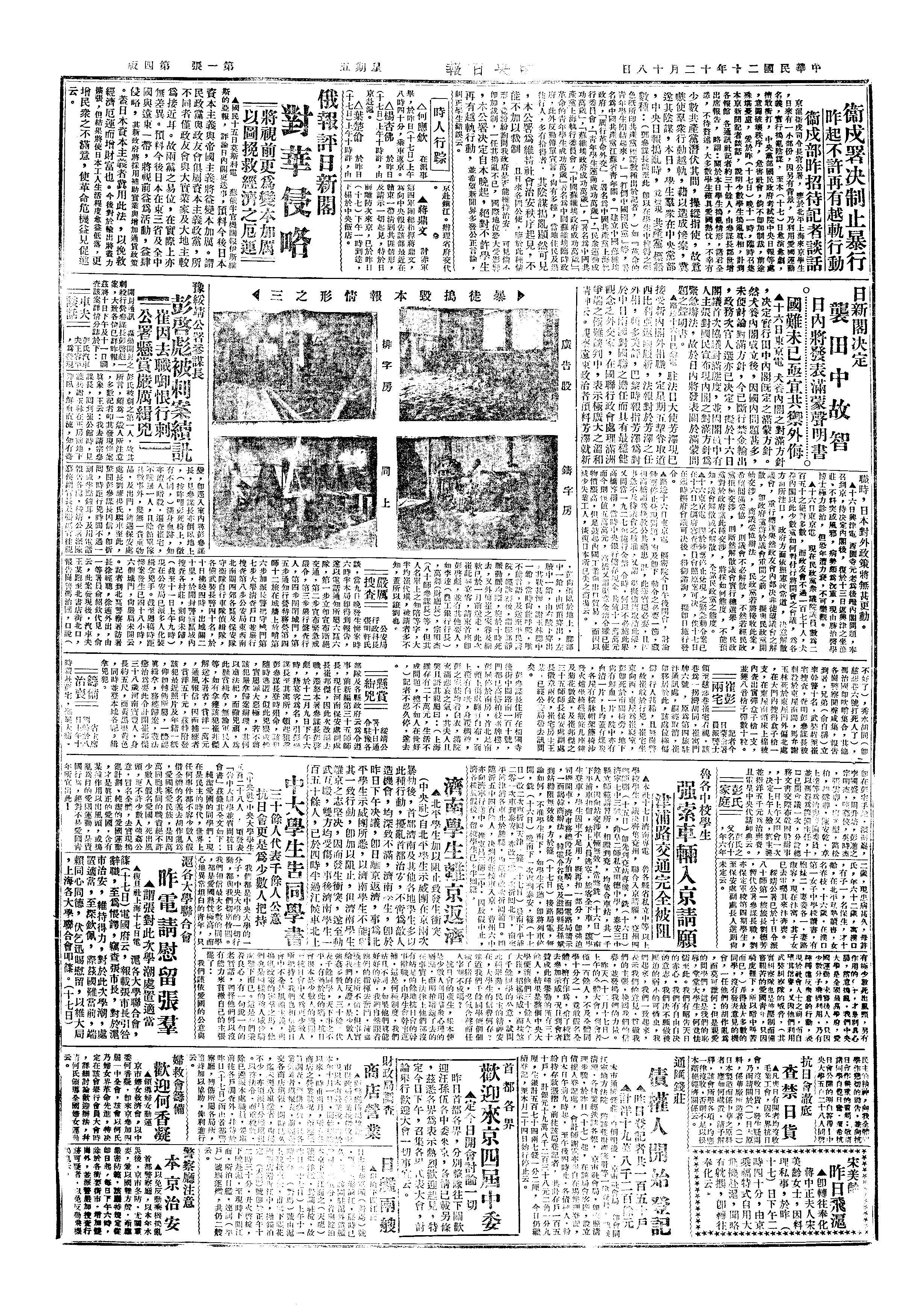 △ 国民政府发表《告诫各地学生书》,指斥北平学生在京围攻中央党部,捣毁《中央日报》馆,“扰乱”治安,显系“暴动行为”,此后对借口爱国之暴动行为“应由各地长官严厉处置”;