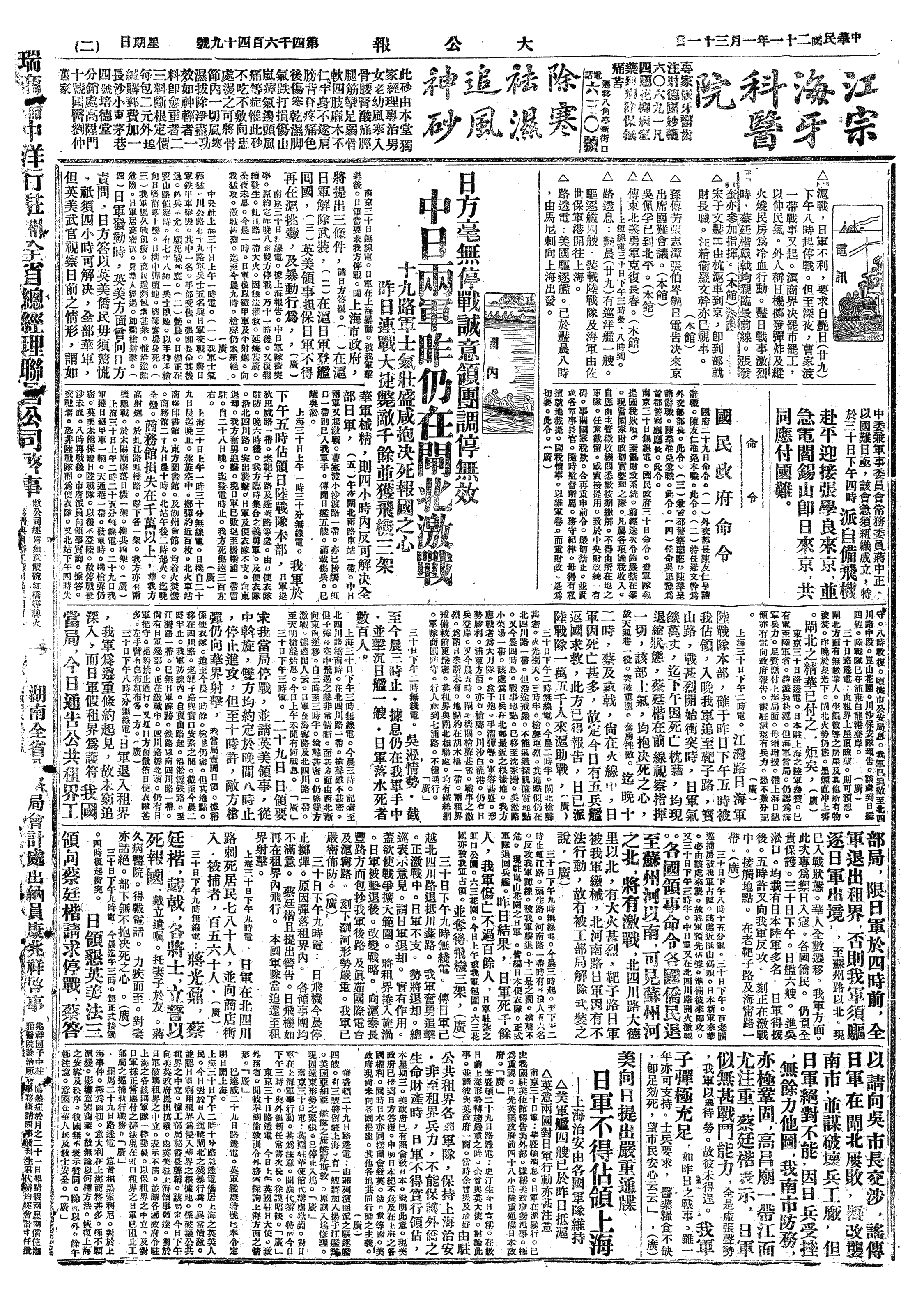 英、美驻上海总领事调解中日战争,要求中、日双方先行停战,英驻防军司令并即席提议,日军应退至租界线内,退出区域由中立国军队驻防,中国军队亦撤至相当距离,一切待外交方法解决。但日方反对,借口须向其政府请示。惟同意停战03日,盖日军连日向我阵地猛冲数十次,我军奋力抵抗,迭予重创,日军力竭,不得不暂藉休战,以为缓兵之计,并向其国内请求支持也。