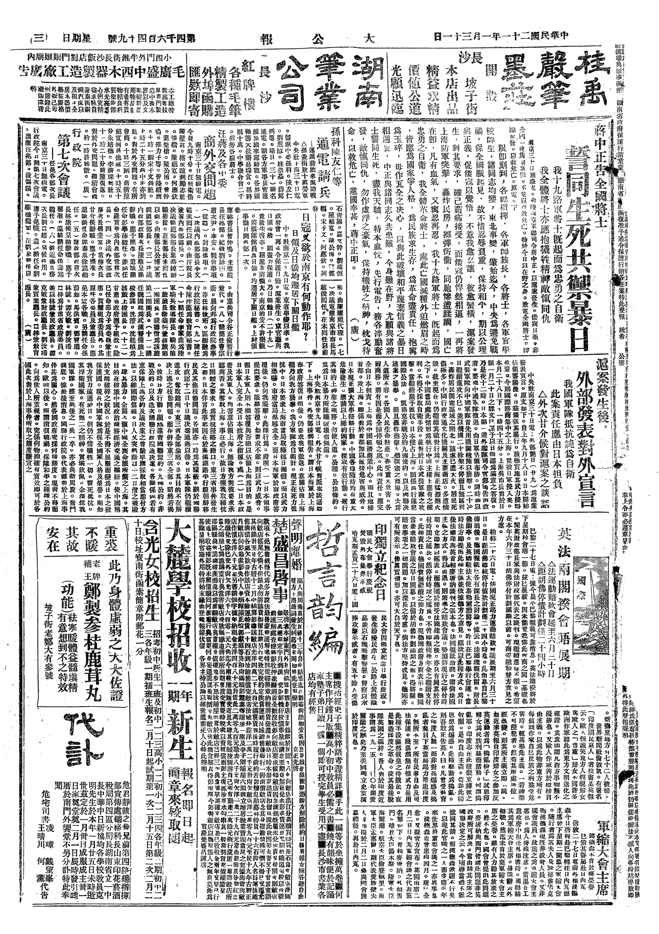 △ 燕京大学学生抗日委员会召集紧急会议,议决为上海事件发表宣言,电慰第19路军将士,并电请国府明令恢复上海抗日运动。