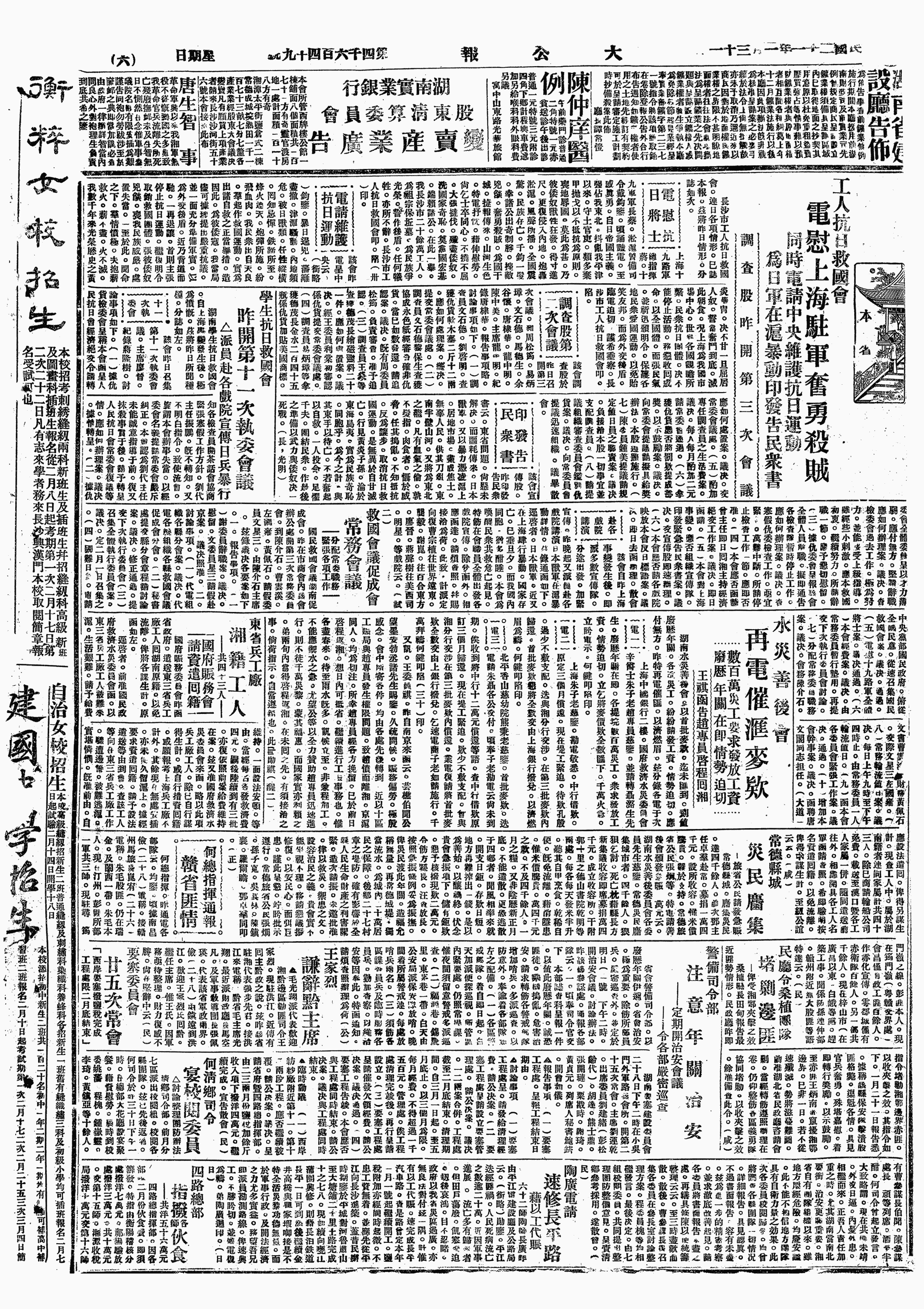 号召全上海的工友们及一切劳苦群众自动起来组织义勇军纠察队,夺取武装来武装自己,反对日本帝国主义占领上海,反对国民党出卖上海。