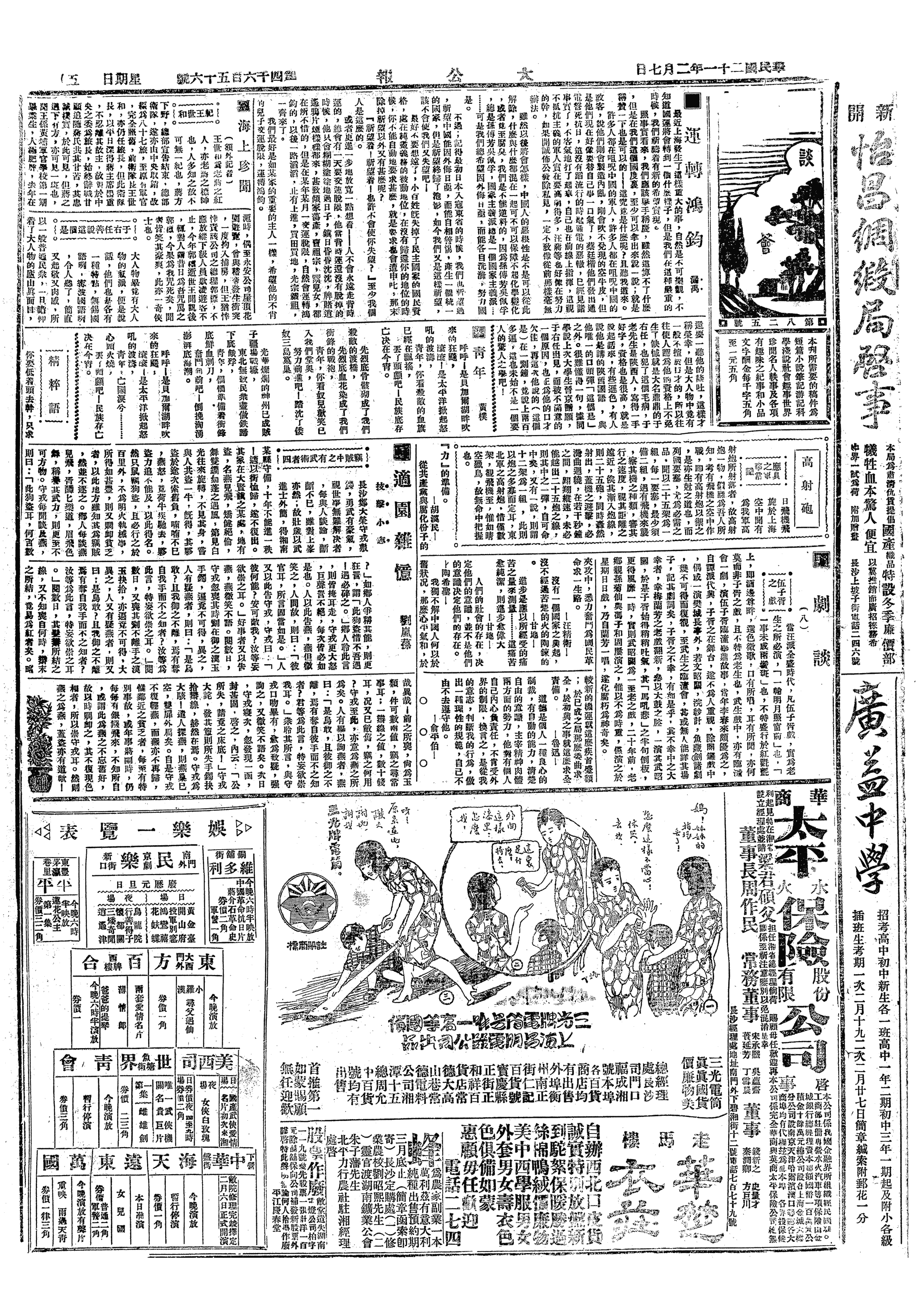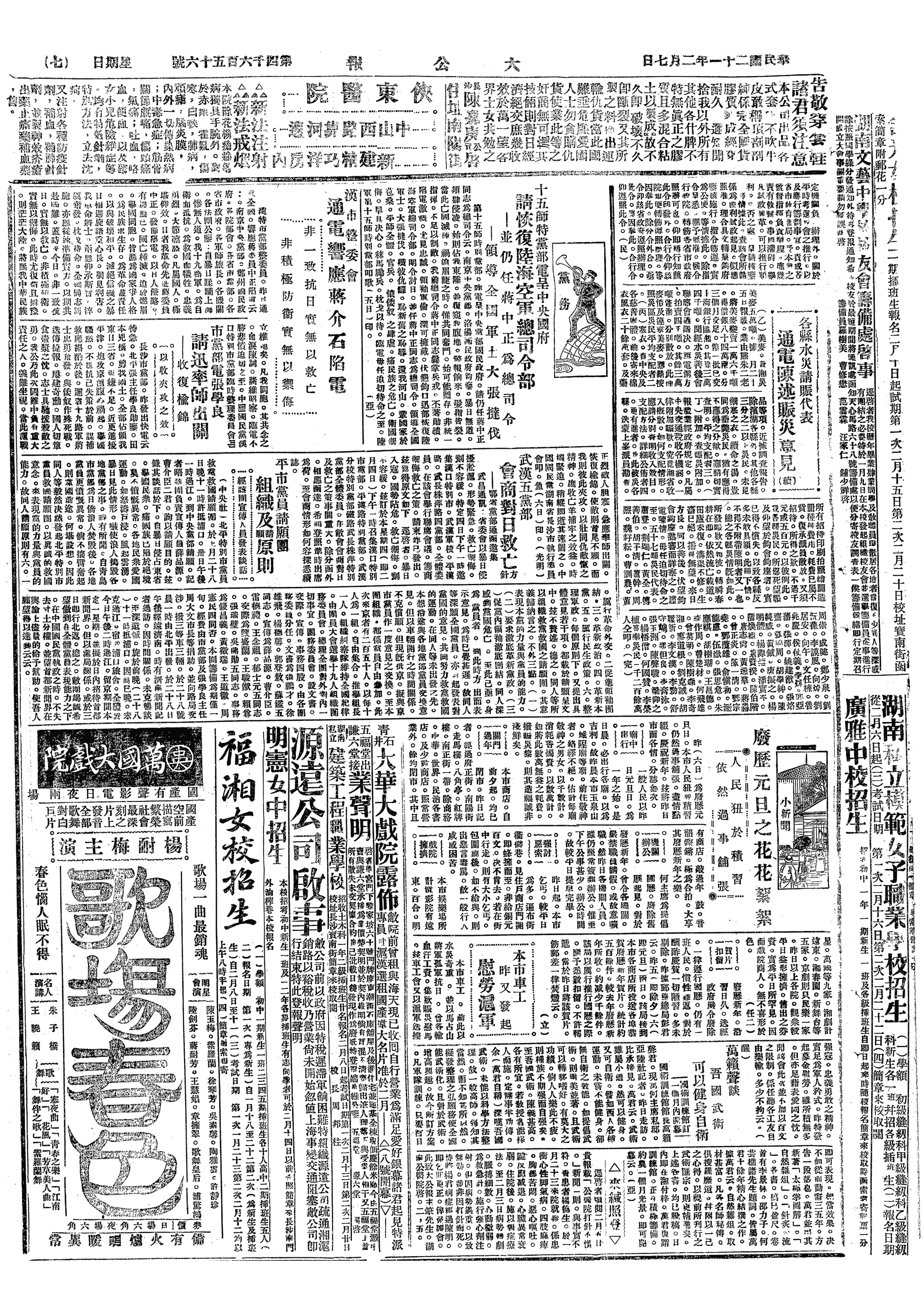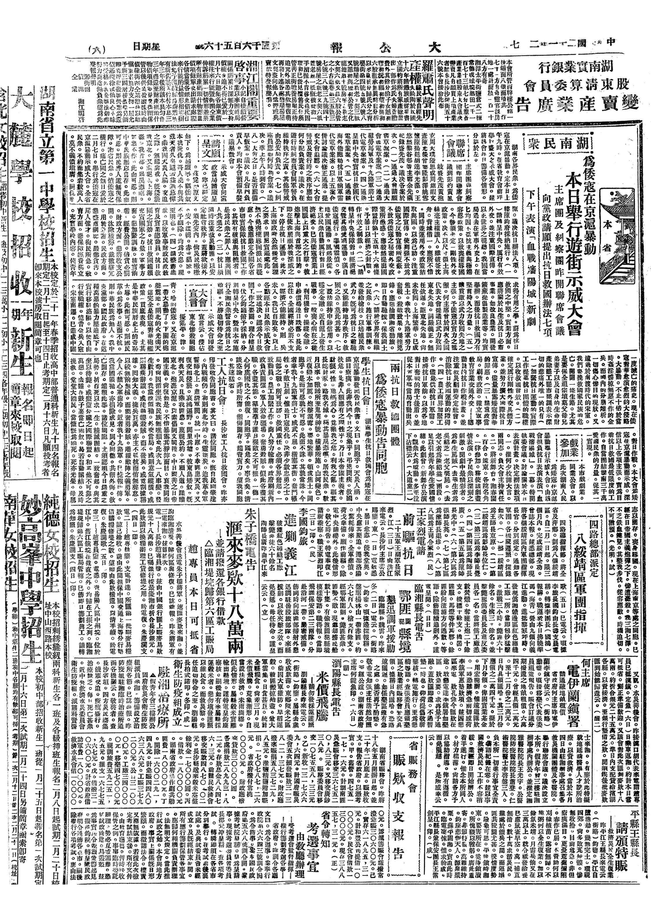 △ 湘省各界在长沙召开抗日示威大会,到百余团体10万人,通过武力收复失地、慰劳沪军、请海外侨胞助饷等七案。