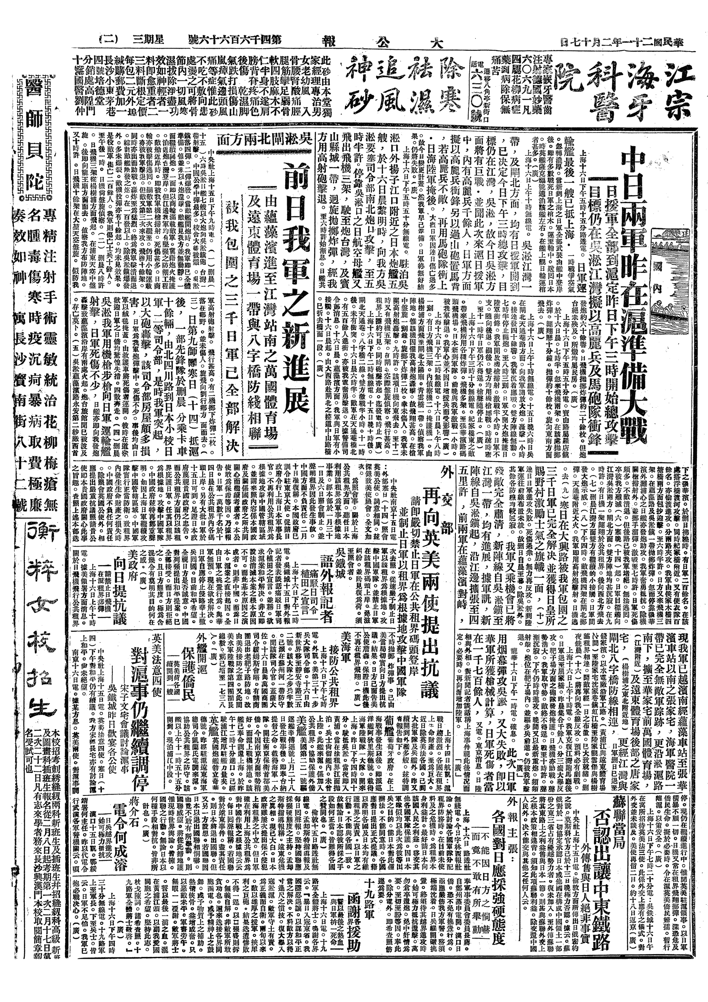 吴淞前线无战事,黄浦江敌舰不时向我炮击。