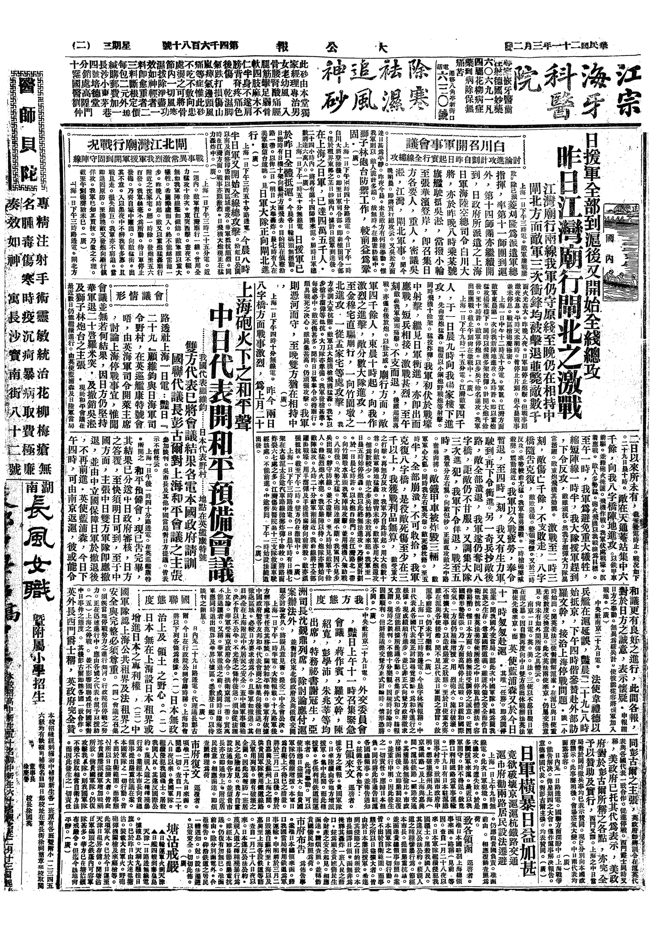 △ 日军二万余人并军舰多艘环攻吴淞炮台,与第19路军谭启秀、翁照垣部激战,至傍晚始停止。