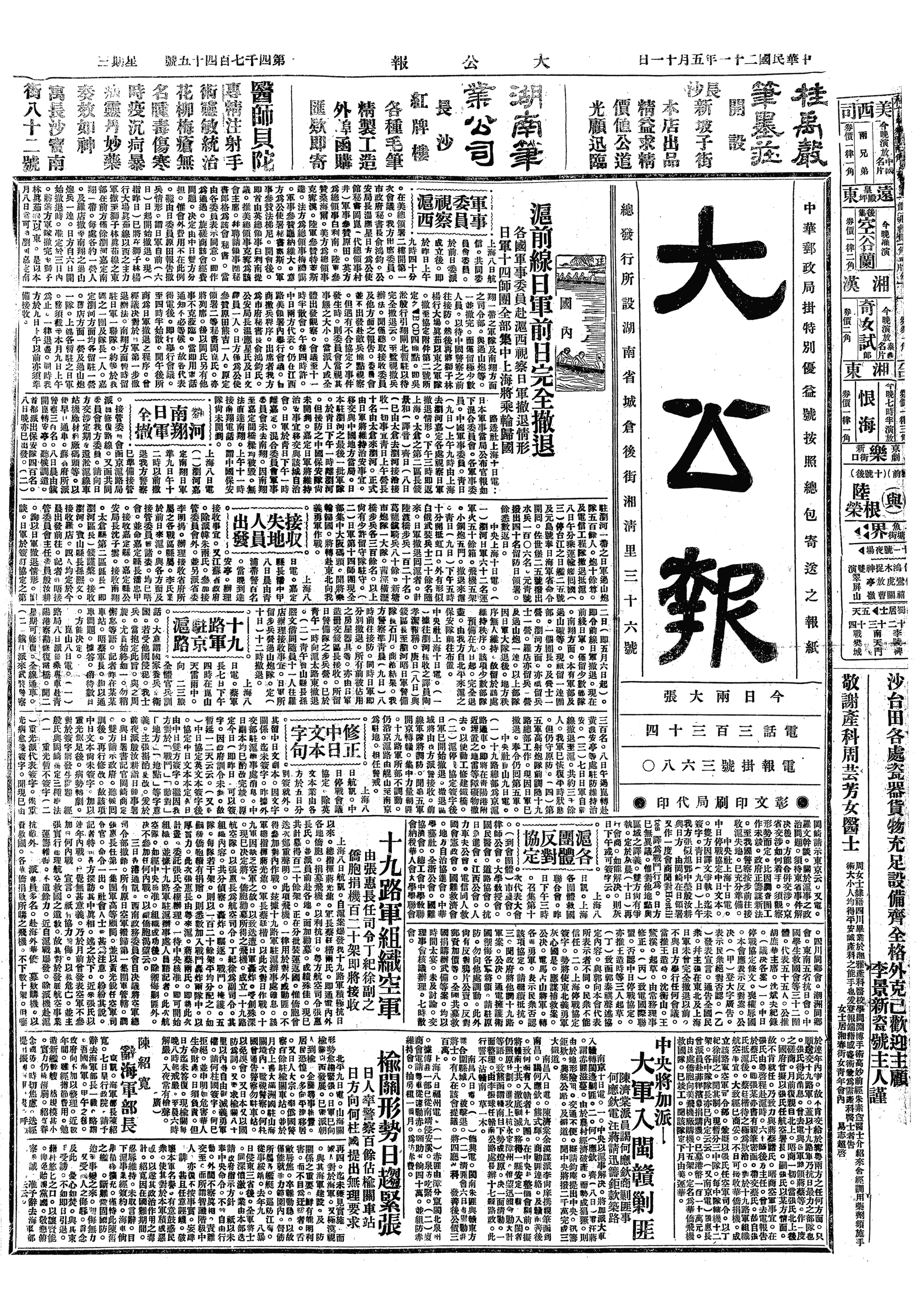 △ 上海市政府商请撤兵区域接管委员会转请停战共同委员会向日方交涉,即日将闸北、吴淞、江湾等处日军迅速撤退,以便早日接管。