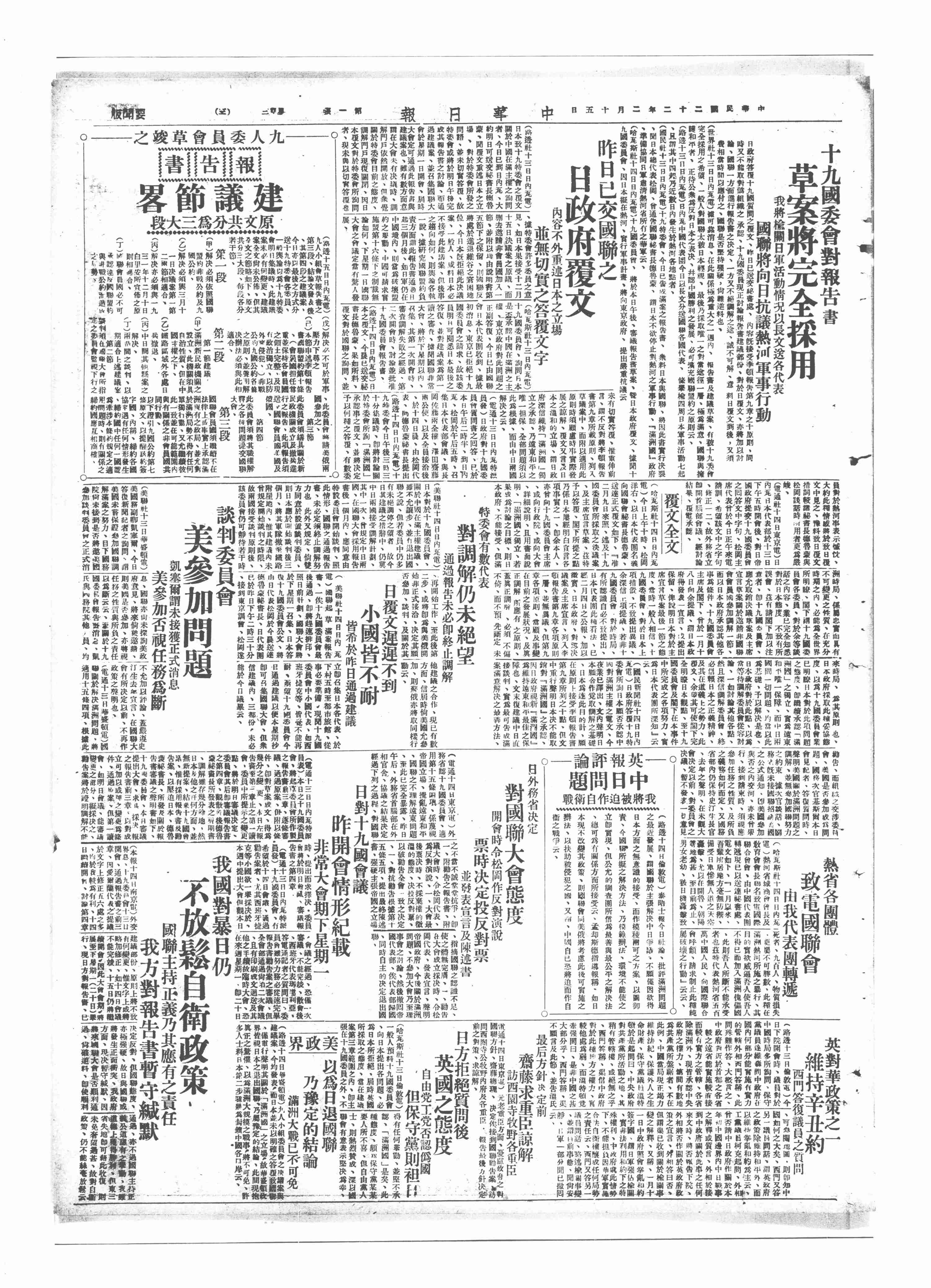 | 9328 | 002000001457A | 一般資料—民國二十一年 (十六) | 蔣中正總統文物-特交檔案-一般資料- | 我國代表團自日內瓦來電稱此間一般一致之意見厥為十九國委員會通過之報告書及建議書將為國聯大會所接受等語 | 1933/02/15 | 1933/02/15 | 002-080200-00068-051 |