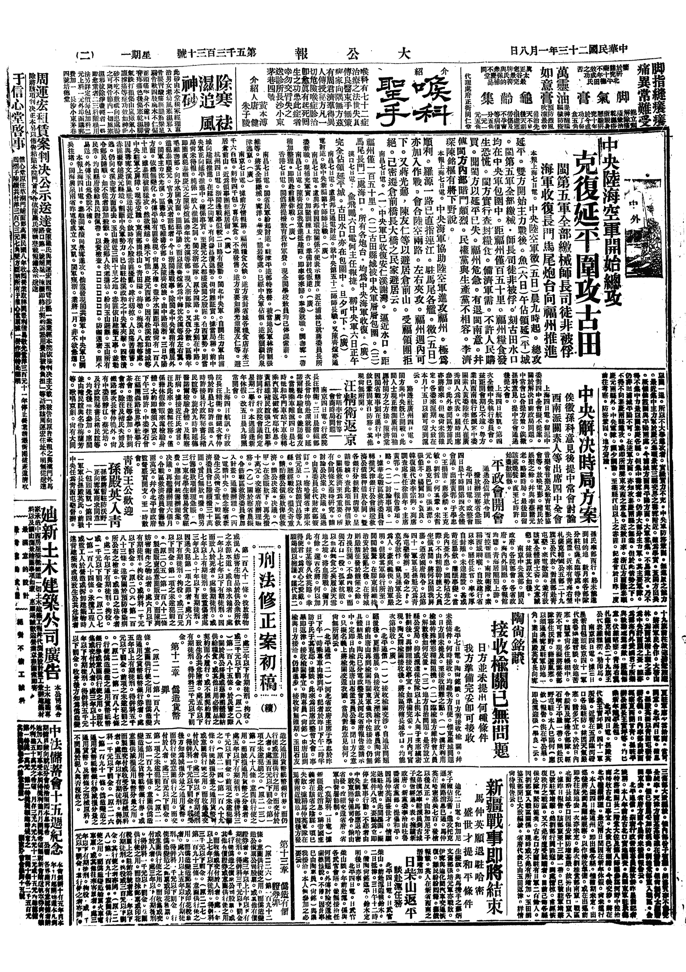上周,一、本身渐壮;二、中央如常;三、川赣匪情渐衰;四、连克延平水口;五、张将到沪。