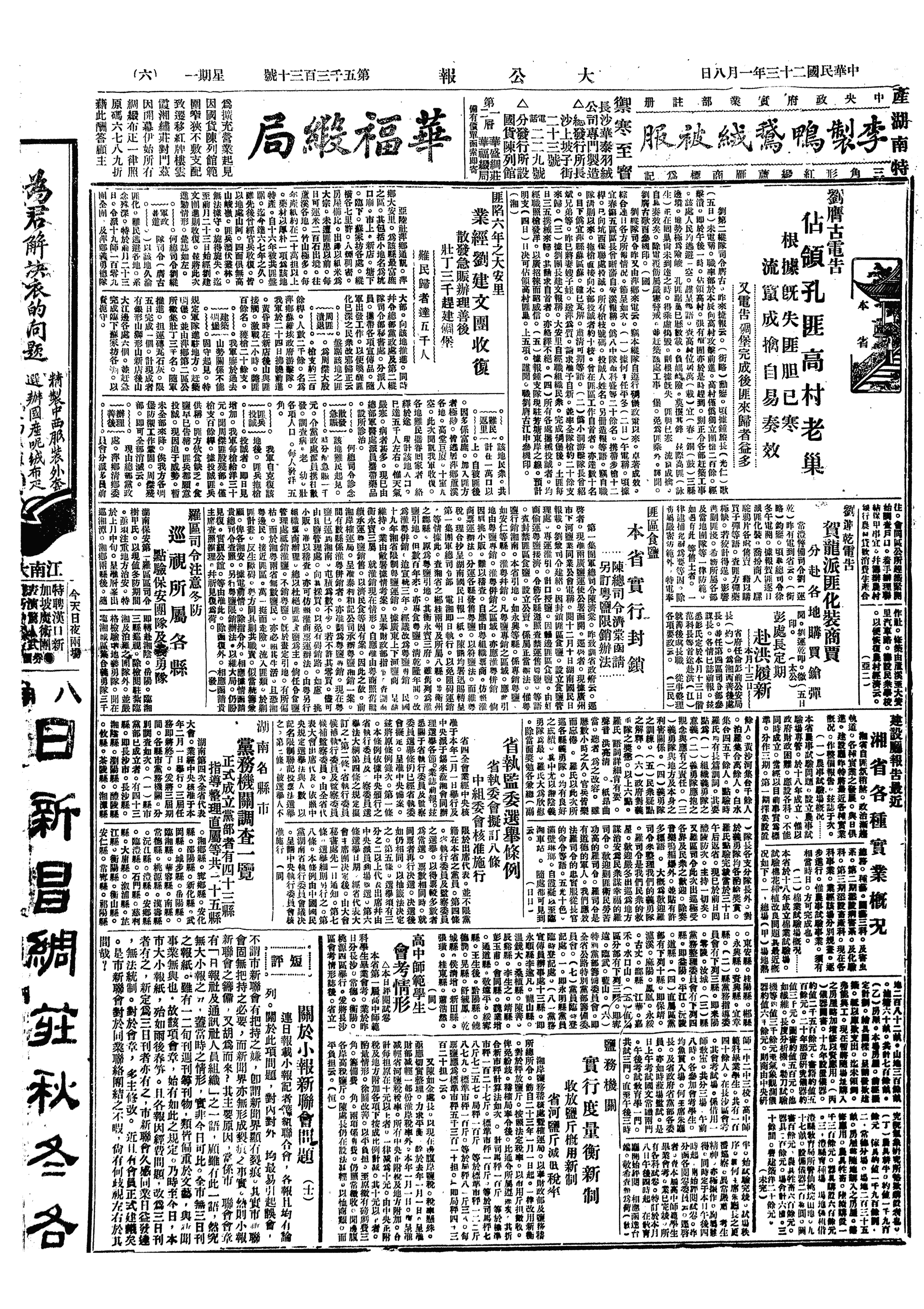 丁、西路剿匪军第2纵队刘膺古部第62师陶广攻占铜鼓万载间之高村(1,5?)。