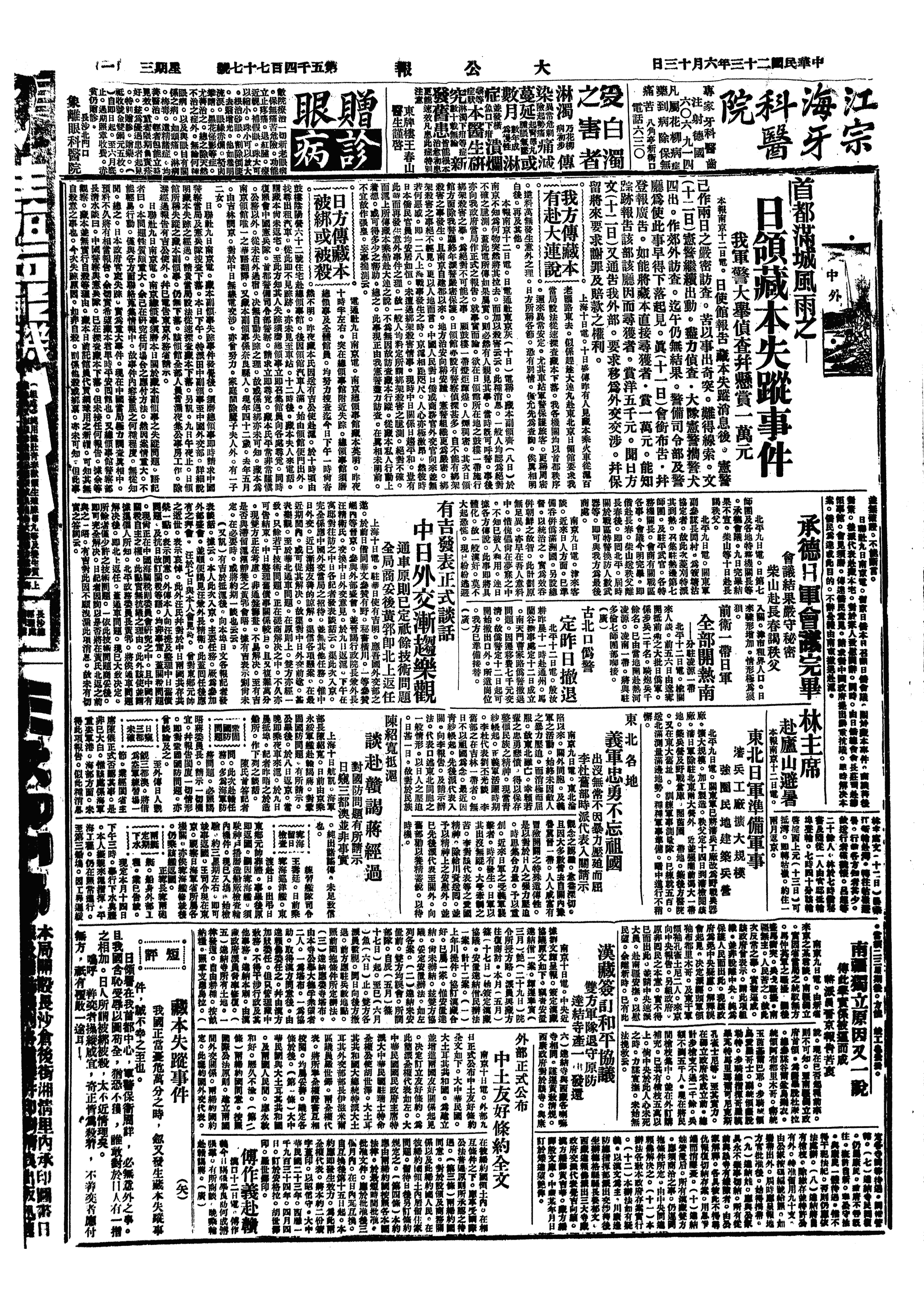 日本驻南京副领事藏本英明复出,日军怏怏不得借口。缘藏本英明于08日晚送其驻华公使有吉明行后,即乘黄包车出中山门登紫金山,欲自杀者数次,旋即隐藏于明孝陵后山穴中。至是,为我驻总理陵园之特约通讯员张燕亭发觉报告,由警察厅特务组员曾杖、李侃将其带至警察厅,据藏本英明向我警方供认其出亡与欲自杀之原因系自动出走。并由驻京之哈瓦斯与路透社外国记者至警厅访问藏本英明,取得其承认自动出走之口头凭证,即由我警察厅备文将藏本英明送往外交部转送日本领事署。日本驻南京总领事须磨奉其政府命即于下午四时来我外交部表示谢意,并诡称经医生证明藏本患有极度之神经症,致有此举云。