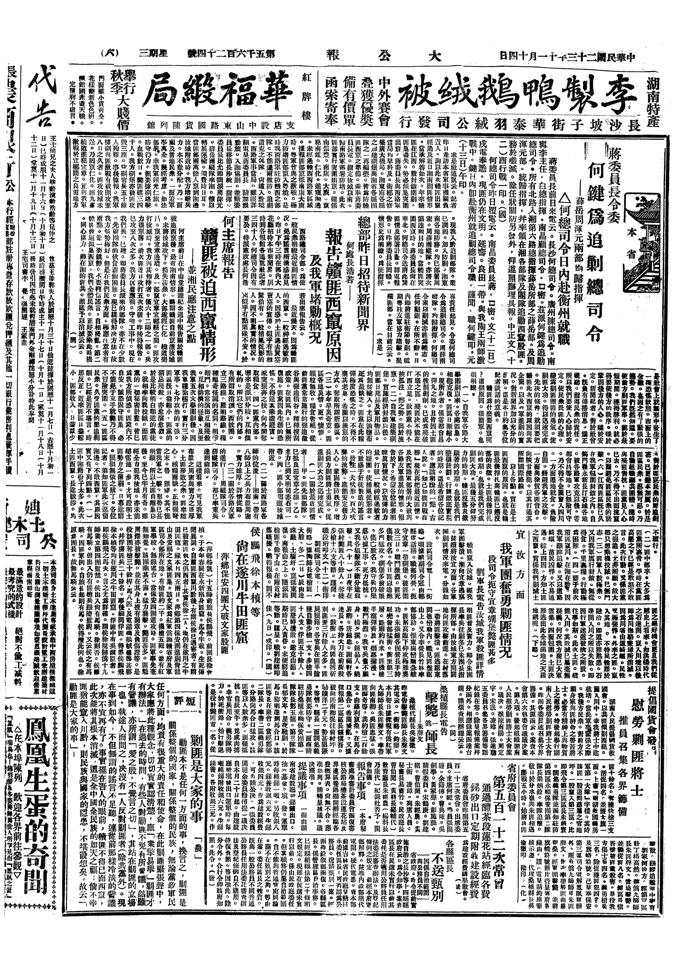 何键在衡阳成立“追剿”军总司令部,宣布就任总司令职。